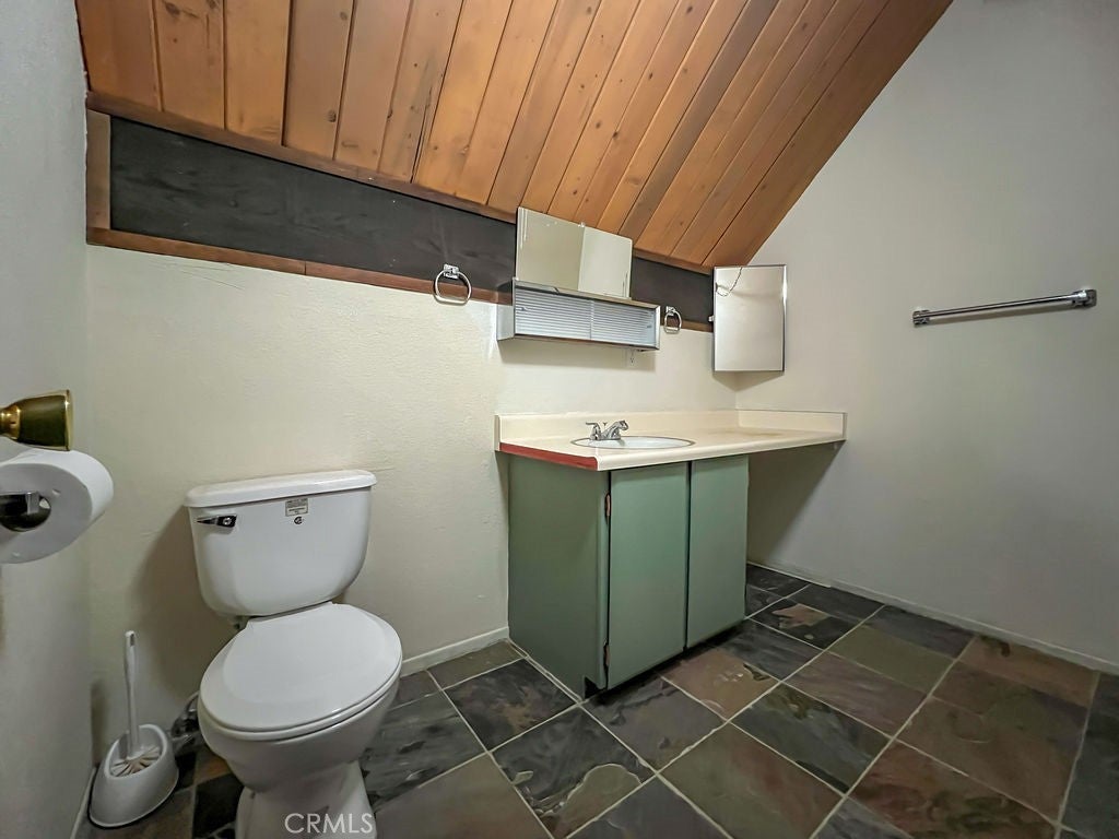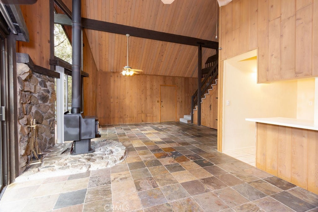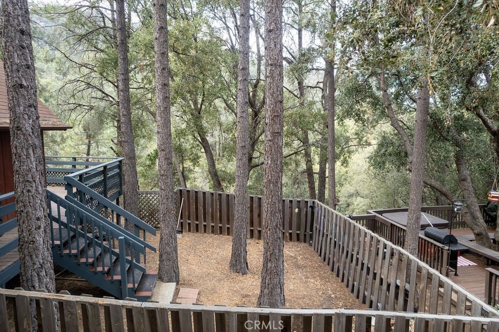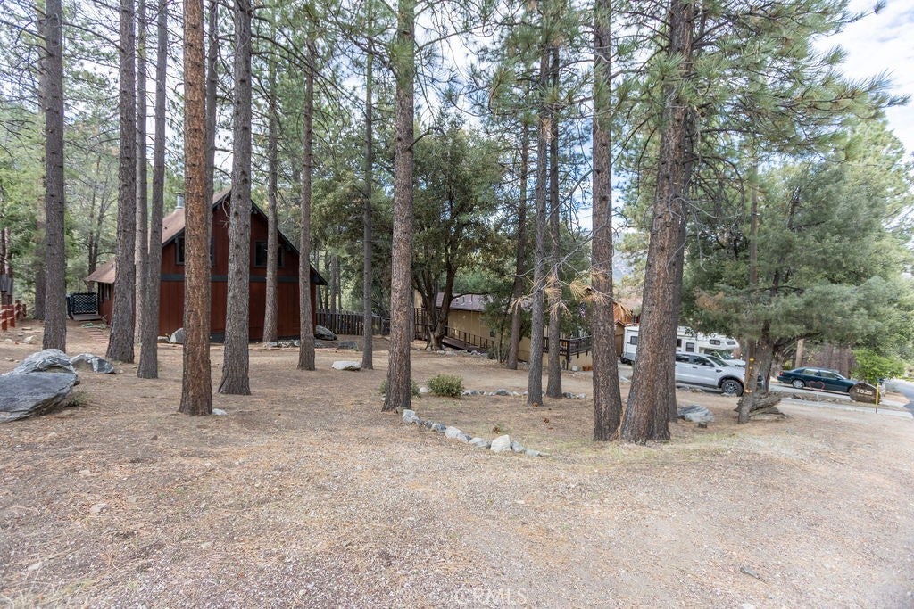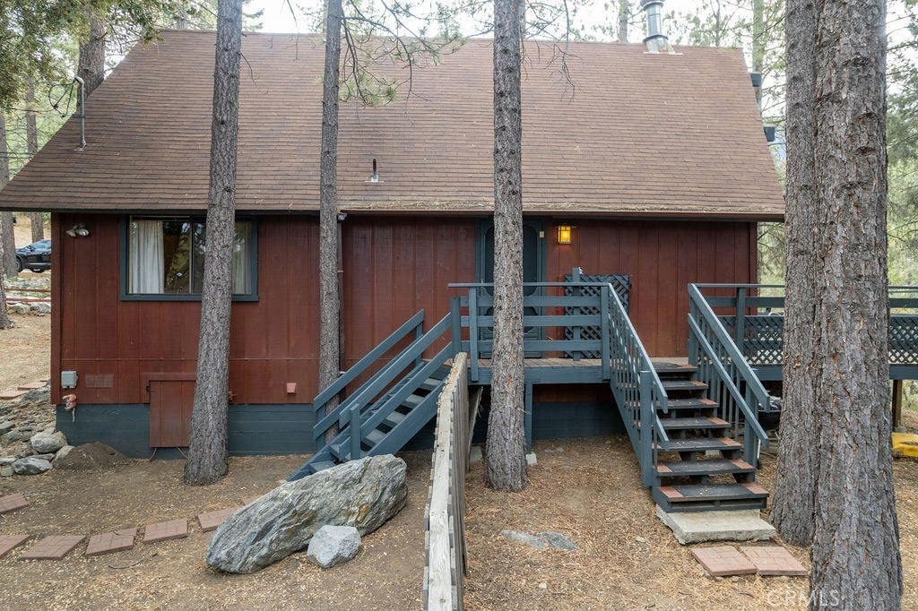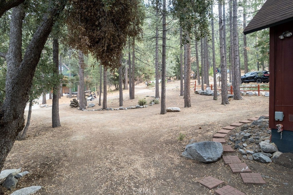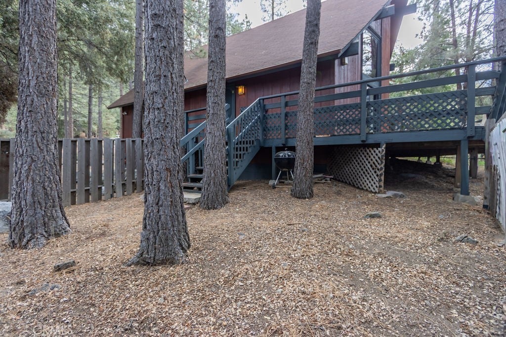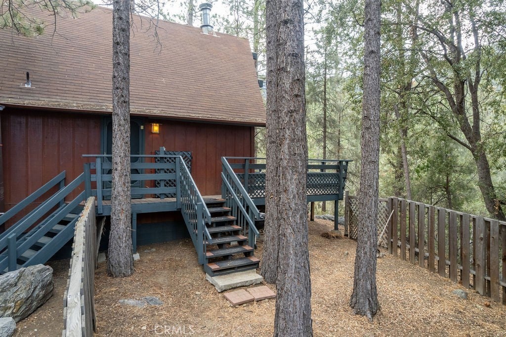 Tucked under towering pines, this 3 bedroom, 1.5 bath cabin has a two-story high great room ceiling with windows looking into the trees and two sets of sliding glass doors opening onto a deck. The kitchen is open to the great room. Also on the main level is a laundry closet, two bedrooms and a bath. Upstairs is an open loft which can be used as a large bedroom as well as a half bath. The slate living room floor adds a special beauty to this home. The bedrooms are carpeted and vinyl floors serve the bathrooms, kitchen and laundry closet. Outside, enjoy the flat front yard with 2 driveways and huge trees, the fenced side yard, large back deck and the green space behind the house. Look into the trees and relax. Come take a look and see if this home calls to you. Enjoy the 1973 vibe or update it as you choose. Check out the community amenities including the clubhouse, pool/spa, golf course, tennis/pickle ball courts, park, stables, hiking and riding trails and more, as well as the activities available every week. Make an appointment to see this well priced home while you still can.