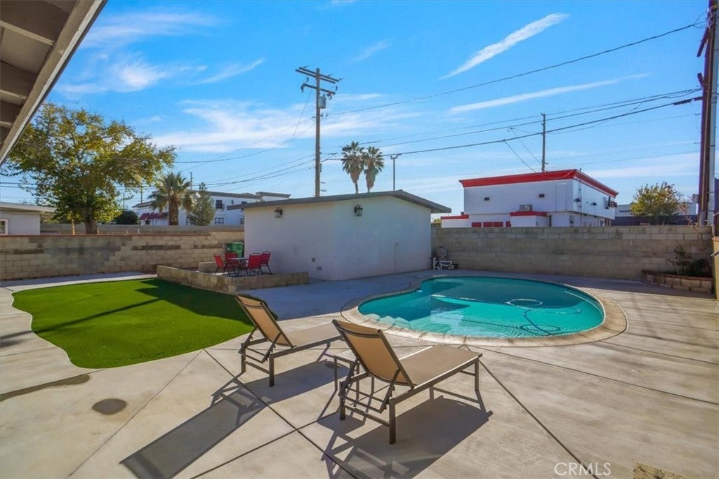 Move-in-ready single-story home with a private pool and tasteful updates throughout. This 3-bedroom, 2-bath property offers an efficient layout with approximately 1,095 sq. ft. of living space on a 6,560 sq. ft. lot. The updated kitchen includes modern cabinetry, granite-style countertops, and a functional island. The home features neutral interior paint, laminate flooring, and a decorative wood beam that adds warmth to the living area. Both bathrooms have been upgraded with tile flooring and updated fixtures. Step outside to a private backyard with a pool — a great space for outdoor enjoyment. Additional improvements include updated HVAC, dual-pane windows, interior cosmetic upgrades, and a solar system for added energy efficiency. Conveniently located near shopping, dining, schools, and local amenities. A well-maintained home at an attractive price point.