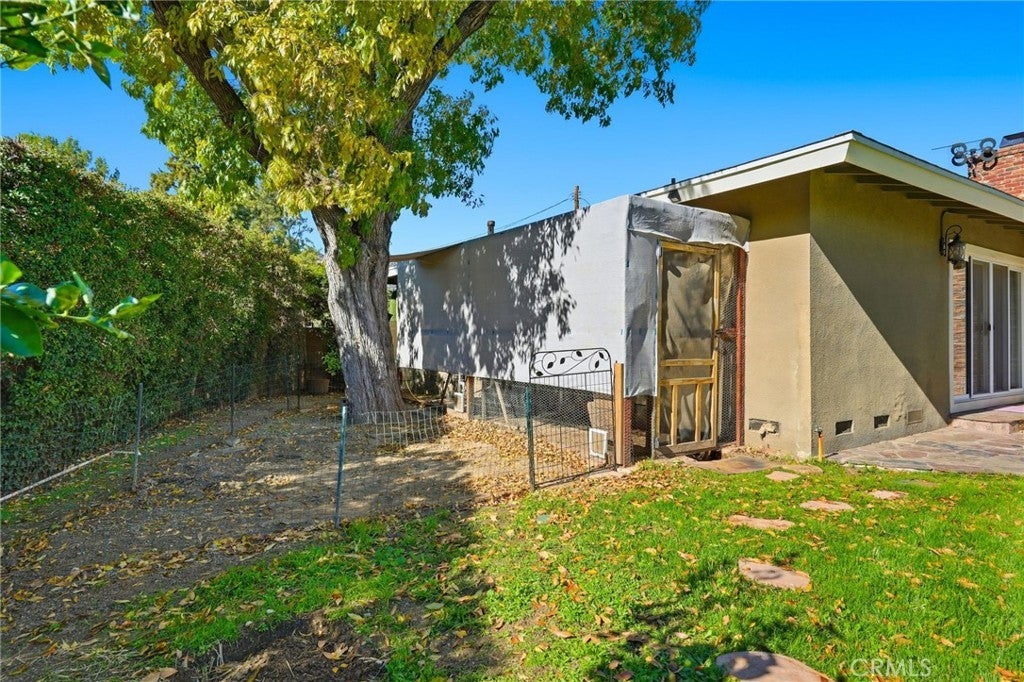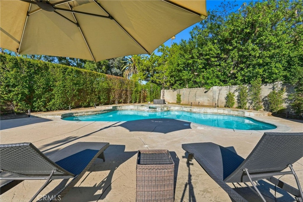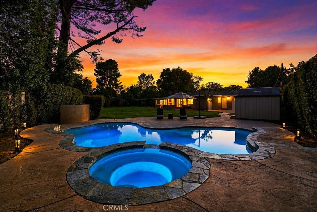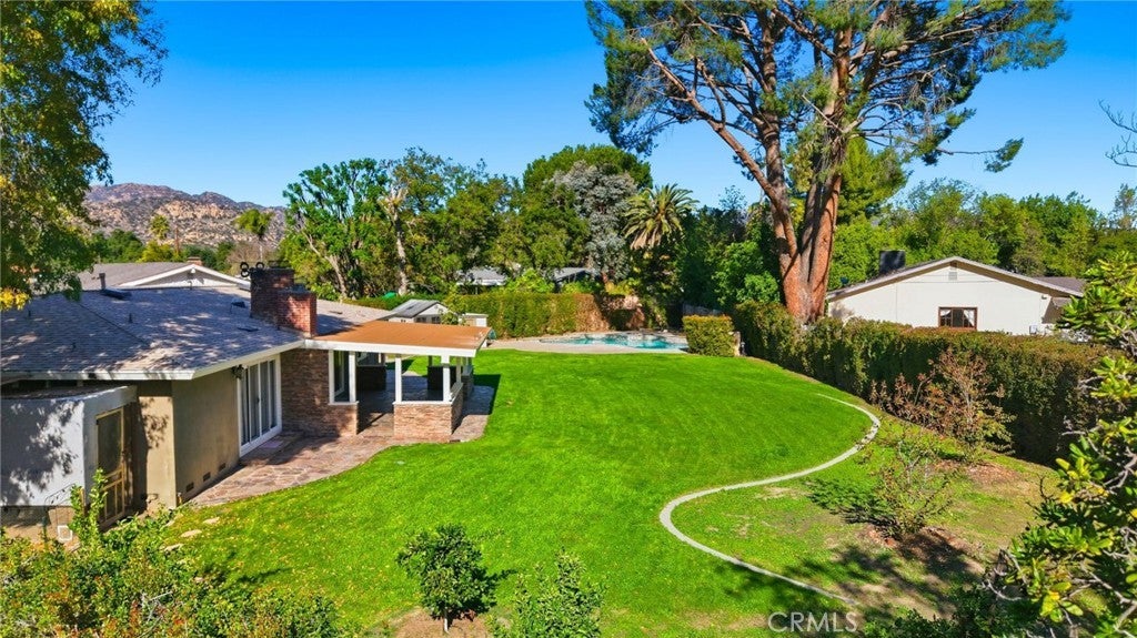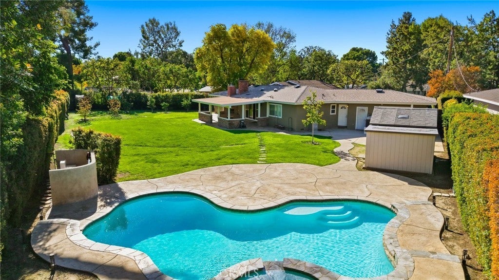 Discover the epitome of California living in this exceptional Chatsworth estate, nestled at the end of a serene cul-de-sac. This single-story residence welcomes you with impressive curb appeal, featuring a stamped concrete driveway and walkway leading to elegant double doors. Upon entry, you are greeted by an expansive living room framed by oversized sliding glass doors that seamlessly blend indoor and outdoor living. Solar tubes, crown molding and a beautifully detailed brick fireplace create an ambiance of warmth and sophistication. The gourmet chef’s kitchen is appointed with rich cabinetry, granite countertops, abundant storage and opens to a sunlit dining room overlooking the manicured front grounds. The luxurious primary suite is a private retreat, offering direct access to the backyard oasis, double closets and a spa-inspired ensuite showcasing custom cabinetry, vanity with double sinks and an oversized designer-tiled shower. Two spacious secondary bedrooms enjoy picturesque front-yard views and share a beautifully appointed full bathroom. A separate fourth bedroom, located in its own wing with direct access to an updated bathroom, provides an ideal space for guests, extended family, a home office, or a personal fitness studio. Additional interior amenities include a generous indoor laundry room and a walk-in pantry. The impeccably finished garage offers direct access, epoxy floors, an insulated door, recessed lighting, seperate A/C system and convenient pull-through capability. The amazing rear grounds provide the feeling of a private park designed for both intimate gatherings and grand entertaining, the outdoor space features a custom covered patio with a fireplace, multiple lounge and dining areas, lush mature landscaping, a custom sparkling pool and spa, a storage shed, fruit trees including avocado and plum, a chicken/rabbit coop and a stunning spacious lawn. This is truly an entertainer’s paradise. Modern upgrades and comforts include paid solar, an EV charger, hardwood flooring and an outdoor fireplace. Perfectly situated in a quiet and desirable enclave of Chatsworth, this remarkable estate offers effortless access to scenic hiking trails, dining, shopping and major freeways—blending luxury, privacy and convenience into one extraordinary offering.