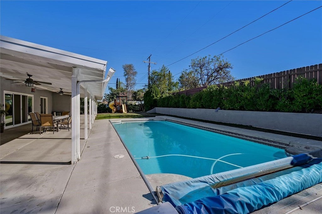 Welcome to this stunning single-story Mid-Century Modern residence nestled in the heart of Woodland Hills. This expansive 5-bedroom, 3-bathroom home blends timeless architecture with the comfort and functionality ideal for today’s lifestyle. Step through the foyer and into an inviting open layout where the spacious living and dining areas showcase floor-to-ceiling views of the sparkling pool and lush green yard—perfect for both everyday living and entertaining. A striking dual-sided fireplace anchors the space, offering warmth and charm to both living and rumpus rooms. The versatile rumpus room can serve as an additional bedroom, home office, or creative studio. The private primary suite is located on the east wing and features a walk-in closet and a generously sized ensuite bathroom. Two additional bedrooms are located on each side of the home, sharing beautifully appointed bathrooms. A two-car garage and an oversized driveway provide ample parking. This home offers the perfect blend of indoor-outdoor living, style, and space—truly a must-see.