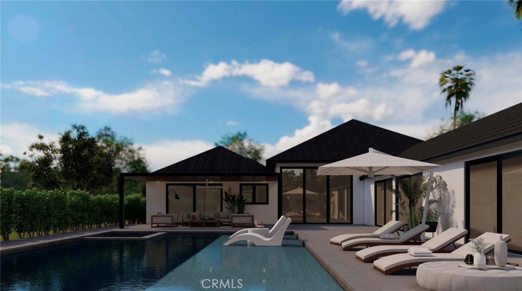 Unveiling a remarkable single story compound estate nestled in Woodland Hills’ coveted Walnut Acres enclave. On a 21,000 SF lot, this 5,000 SF home includes 5 bedrooms all loaded with en suite bathrooms and ample sized closets. Setback far from the street and behind a double gate entry is a massive parking area for up to 9 cars and future improvements will be made for a portion of the driveway to be covered from above. As shown in the renders, this house is on its way to completion and will include a dream entertainers yard- the heated pool and spa is in. Next up will be a half sports court with a net, a luxurious outdoor pavilion, and a fire pit with integrated seating. The pavilion will include a full outdoor kitchen, fireplace and lots of seating area. Inside of the home, a giant pivot door opens up to 13 foot high ceilings, lined by custom panel walls complimented with LED lighting, and natural porcelain floors. This is a fully integrated Control4 smart home with camera, lighting, surround sound, and AC control all from your phone and 2 built in tablets. The home includes a theatre room, giant walk in pantry, laundry room, an additional powder bathroom room for guests, wine wall, and so much more. The master bedroom has direct access to the dream yard and the Jr master also has access to the outdoors. This floorpan is perfectly situated for big families and every bedroom has significant space in between each other. Located minutes from award-winning El Camino Charter High School, the Topanga Mall and The Village, and the premier boutiques and dining along Ventura Boulevard. Modern sophistication and unmatched convenience in one of Woodland Hills' most sought-after neighborhoods.