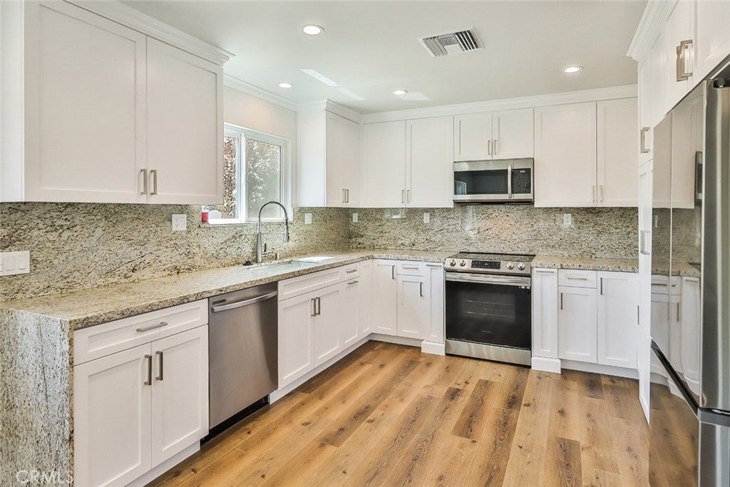 2 story newly constructed ADU. 3 bedroom 2 bath with 1200 square feet of living space. Gourmet kitchen with granite counter tops and stainless-steel appliances. Large living room. Recessed lighting throughout. All bedrooms upstairs, Tankless water heater, solar panels, Refrigerator, washer & dryer included.