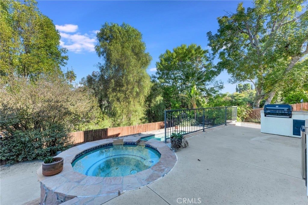 Welcome to 22781 Macfarlane Drive, a private retreat tucked away on a desirable flag lot offering space, comfort, and exceptional indoor-outdoor living. This expansive home features 3 bedrooms, 4 bathrooms, and a large, versatile downstairs bonus room—ideal for a home office, gym, media room, or guest suite. The spacious living room features a fireplace and is enhanced by French doors with sidelights that open to the backyard, filling the home with natural light. Designed for entertaining, the formal dining room includes a wet bar and wine refrigerator, seamlessly connecting social spaces. The chef’s kitchen is both stylish and functional, showcasing granite countertops, stainless steel appliances, rich dark wood cabinetry, a trash compactor, pot filler above the stove, and a generous walk-in pantry with brushed-glass double doors. A cozy eat-in kitchen area flows effortlessly to the backyard through sliding glass doors. Step outside to a true entertainer’s paradise featuring a built-in BBQ, refrigerator, outdoor TV, and a sparkling pool and spa—perfect for hosting gatherings or relaxing under the stars. The tranquil yard is complemented by mature fruit trees, including lemon and orange trees, dragon fruit vines, and views of the West Valley. Inside, travertine tile flooring enhances the main level, while the upper floor offers a spacious primary suite with his and her bathrooms, along with two secondary bedrooms that share a full bathroom. Additional highlights include plantation shutters, newer windows, ceiling fans, elegant arched entryways, an indoor laundry room, pull-down attic access in the garage, and fresh paint and new carpet. Ideally located just minutes from premier dining, shopping, and entertainment, with easy access to The Commons at Calabasas, Westfield Topanga, and The Village, this home offers privacy, convenience, and an exceptional lifestyle in one remarkable setting.
