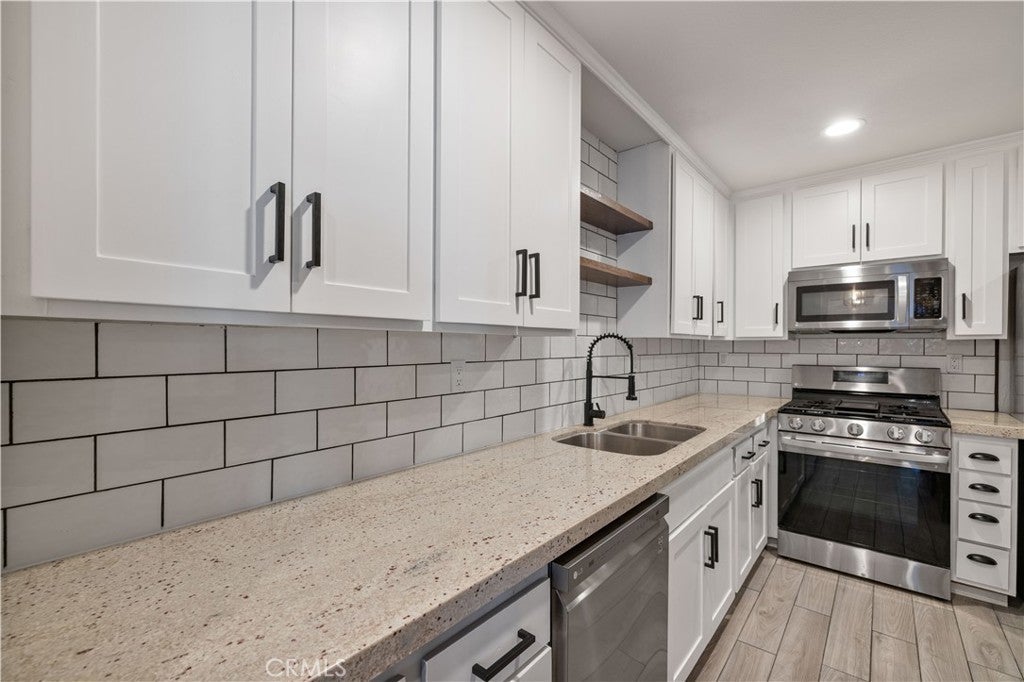 Welcome home to this beautifully updated, MOVE-IN READY, end-unit condo boasting 3 bedrooms, 2.5 bathrooms, back patio, a detached 2 car garage, and PLENTY OF UPDATES over the last few years! As you enter into the spacious living room, plantation shutters and newer recessed lights help it show light and bright. The fireplace serves as a beautiful focal point adding warmth and comfort to the space, while your adjacent dining area features a stunning wood-paneled accent wall illuminated by a newer modern light fixture. Your kitchen has been tastefully updated with wood-like tile flooring, white granite countertops (matching in all bathrooms), newer cabinetry, matte black hardware and coil spring gooseneck sink faucet, subway tile backsplash, floating shelves, a pantry with farmhouse style bi-fold barn doors, and stainless steel appliances that are all just a few years old (fridge included)! You also have a half bath downstairs with floating shelves against a black accent wall. The back slider opens up to the spacious patio featuring string lights, a utility sink, and access to your 2 car garage. Head upstairs to find all 3 bedrooms with newer ceiling fans, your laundry area (washer and dryer included), and 2 more bathrooms. Your primary suite has vaulted ceilings, a stunning black shiplap accent wall, two closets, and a walk-in shower. Your NEWER AC UNIT is only a few years old and the water heater replaced just within the last several months. Your HOA includes a pool, tennis court, and trash is included. Located near plenty of shopping centers, eateries, parks, Castaic Lake, the Castaic Sports Complex, Aquatic Center, and just a hop away from the 5 freeway, you're close to everything so come make this your own while you can!