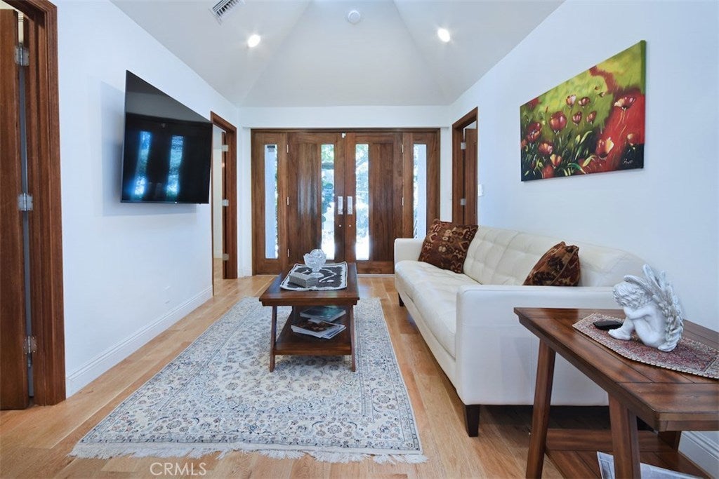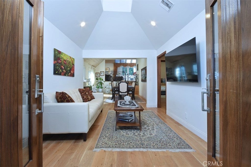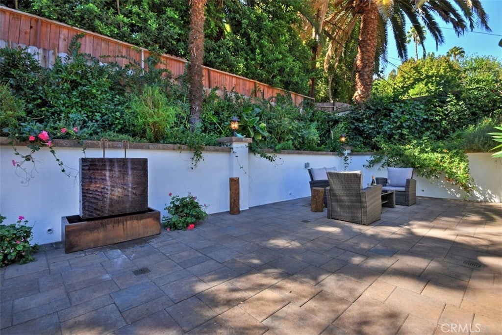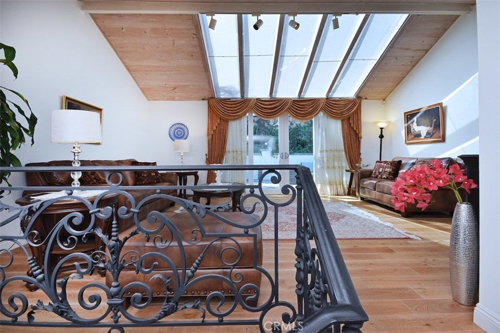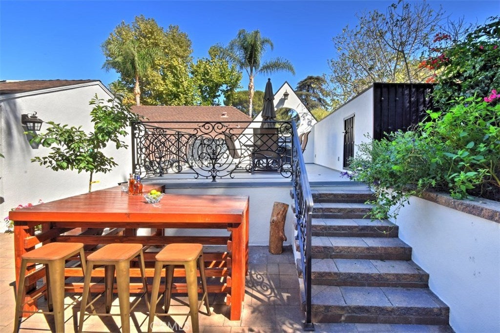 This South of the boulevard Sherman Oaks contemporary home has outstanding curb appeal plus a large grassy front yard and mature landscaping. Enter this amazing home thru the custom wood and glass double doors that lead you to an entry with high ceilings and wood floors that run flawlessly throughout. The living room features wood floors, high exposed wood ceilings, several skylights that help make it a bright and pleasing area plus French doors to the backyard. The dining area also has high exposed wood ceilings and French doors and is open to the art-deco style kitchen with checkerboard floors, granite counters, black stainless steel appliances, skylights, and a breakfast bar that links the kitchen and dining areas. The main floor features 3 nice-sized bedrooms including the tranquil and spacious master suite with exposed wood ceilings, a full bathroom, a walk-in closet, and a private patio. The terraced backyard has several lounging areas, and plenty of mature tropical landscaping.
