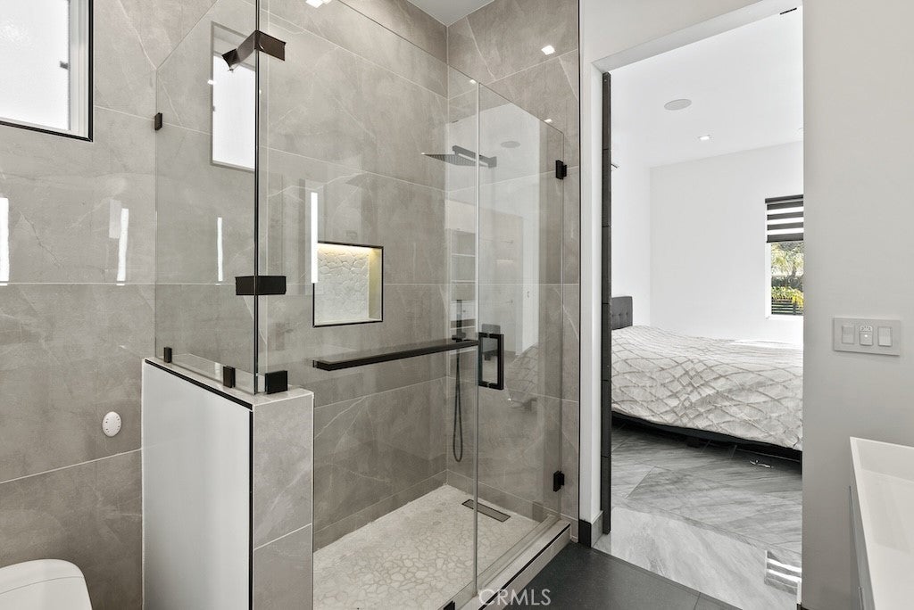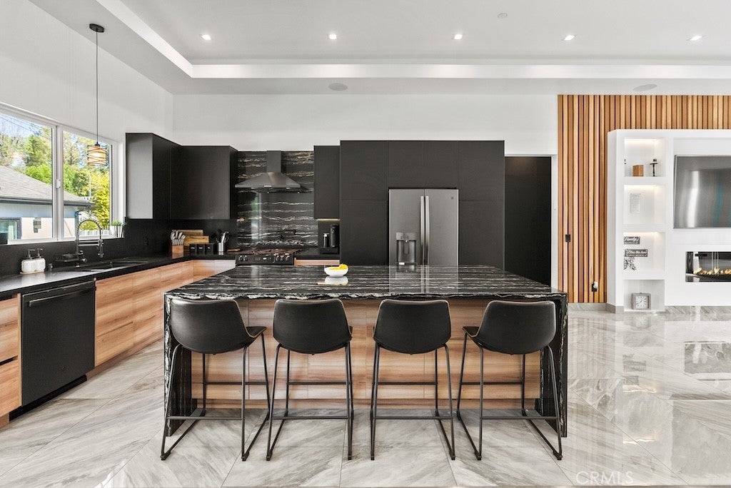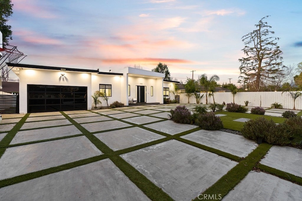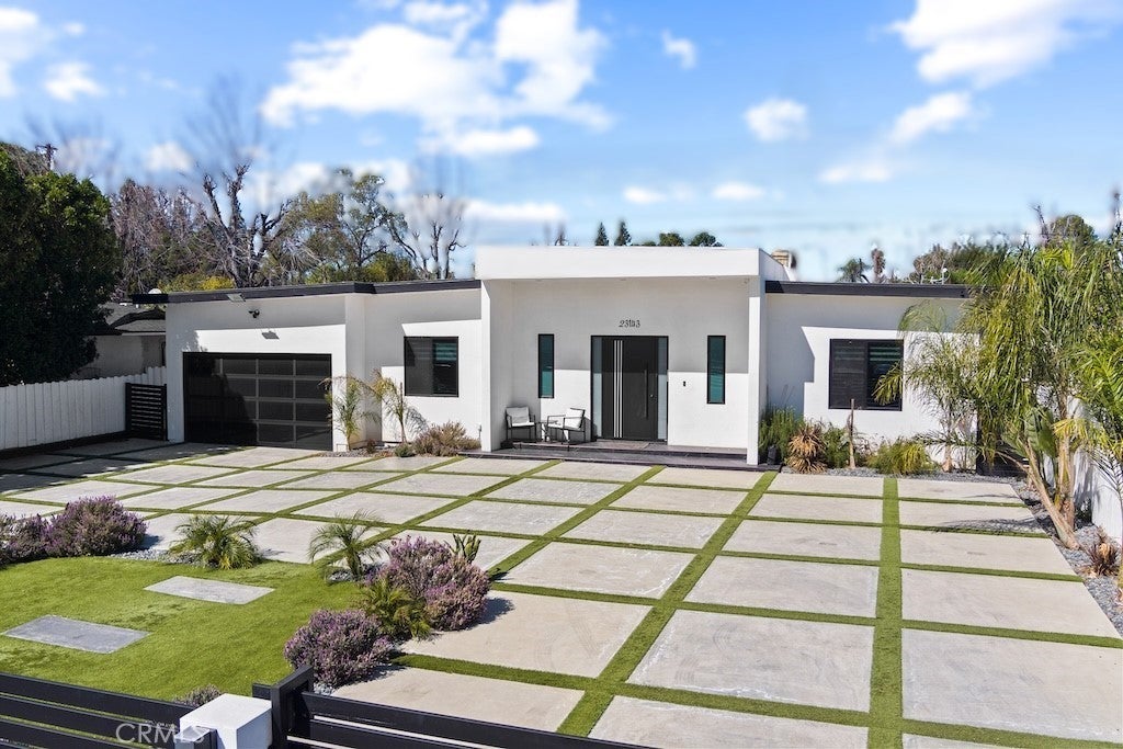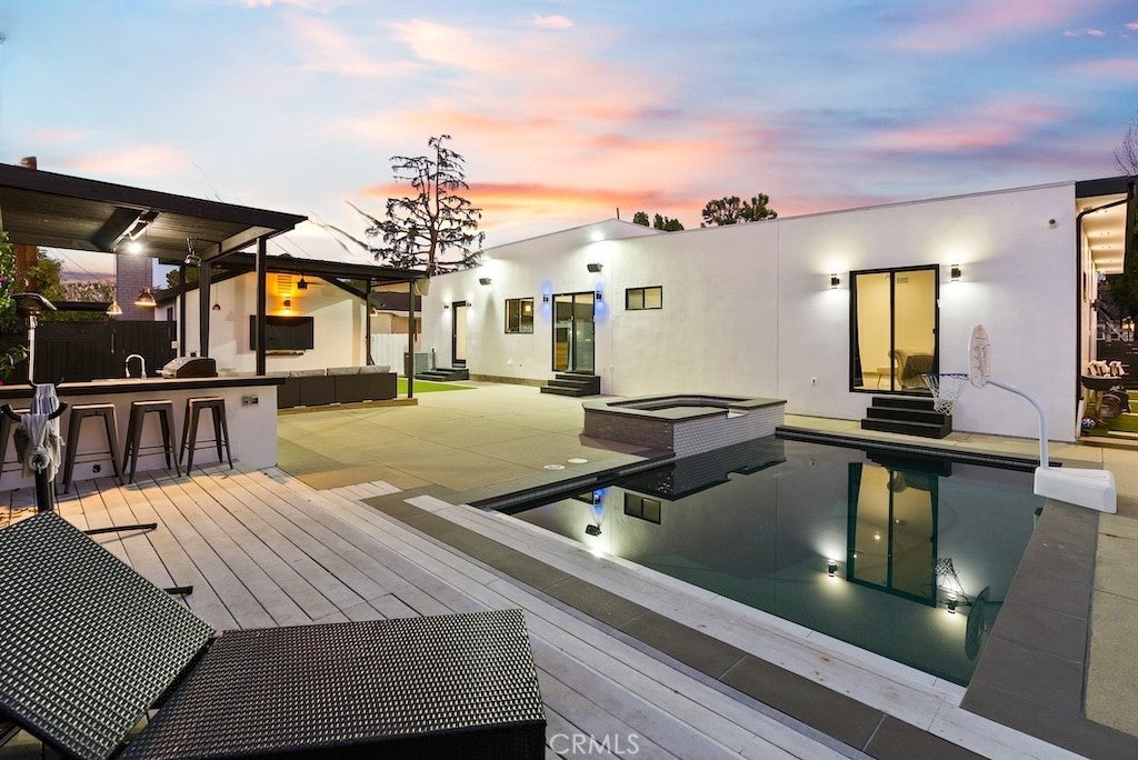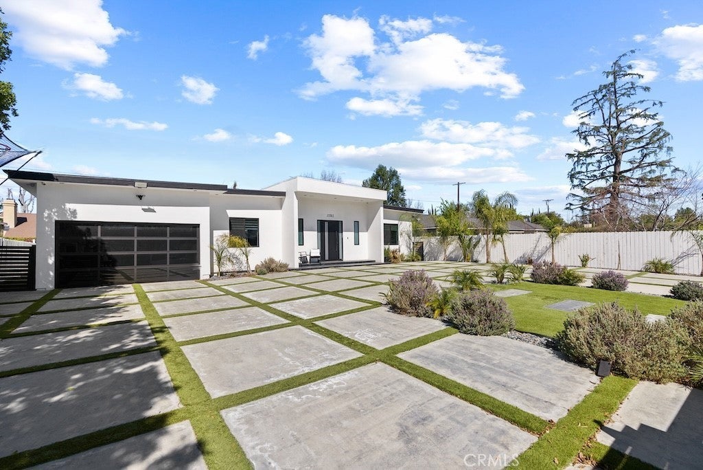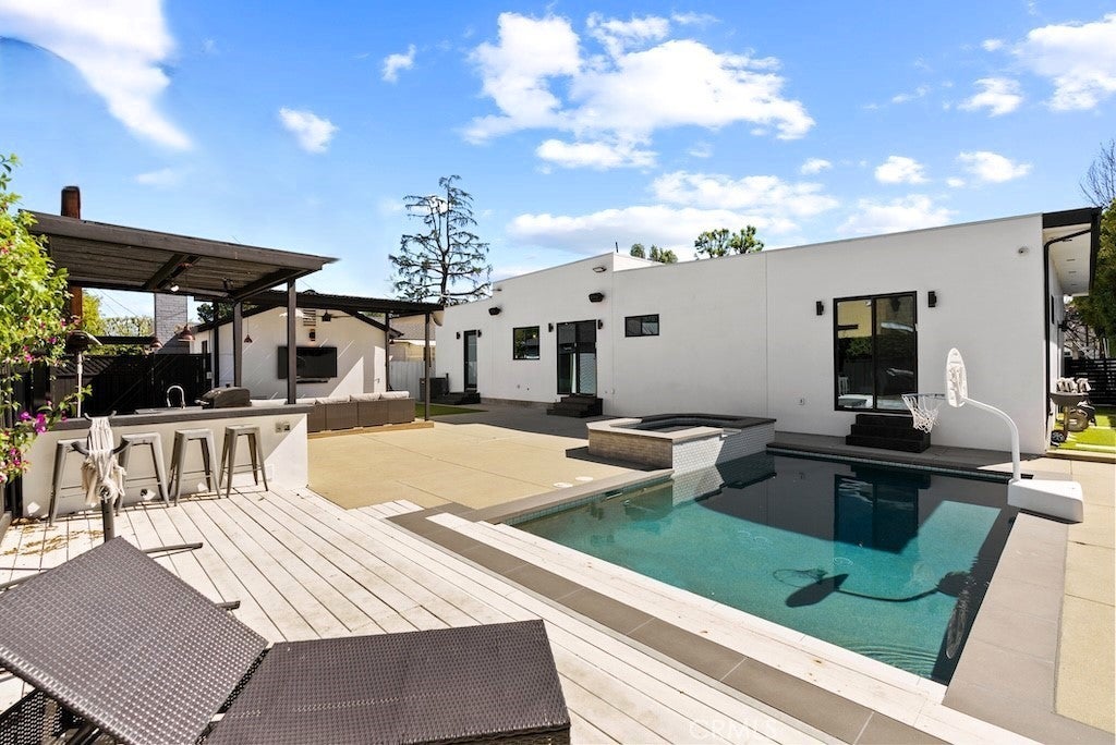 Welcome to this unique one-story modern masterpiece in the highly sought-after Walnut Acres Adjacent neighborhood of Woodland Hills. Fully rebuilt and reimagined, this expansive 3,300 sq. ft. estate offers 5 bedrooms and 4 bathrooms, including a detached guest house with 1 bedroom and 1 bathroom.From the moment you arrive, the electrical double-gated entry and circular driveway set the tone for privacy and elegance, providing parking for multiple vehicles, an RV, or even a boat. Step inside to a light-filled open floor plan with 14' soaring ceilings, bespoke Wisconsin hardwood accent walls, custom built-ins blended with soft LED lighting, and a striking modern fireplace that together create a warm yet sophisticated atmosphere. The chef’s kitchen is designed for both beauty and function, complete with soft-close custom cabinetry, quartz countertops, a large island with breakfast bar, double sink, pot filler, high-end appliances, and plenty of workspace. The dining area, overlooking the backyard, creates the perfect setting for intimate dinners or lively gatherings. The primary suite is a serene retreat featuring vaulted ceilings, a massive walk-in closet, and a spa-inspired en-suite with dual faucets and a walk-in shower. Two spacious bedrooms share a modern Jack & Jill bath, while a junior suite offers its own walk-in closet & full bath. The detached guest house is a true bonus with its own fireplace, walk-in closet, and full bath, ideal for guests, a home office, gym, or rental income. Step outside to your private backyard paradise, a resort-style escape with a sparkling saltwater pool & spa, raised tanning deck, and covered patio with ceiling fan for year-round comfort. Host unforgettable gatherings with the outdoor kitchen, complete with double BBQ grill and built-in bar, then unwind by the sleek fire pit or dine al fresco in the covered lounge, all surrounded by lush, mature landscaping. Additional features include luxury tile flooring throughout, custom window blinds, and smart home system that controls interior and exterior sound, security cameras, intercom, central A/C with individual climate control for each bedroom to maximize comfort and energy efficiency. Perfectly located just one block north of Ventura Blvd and minutes from the 101 freeway, this home offers easy access to The Calabasas Commons, premier shopping, fine dining, and award-winning schools. This is your opportunity to own one of Woodland Hills’ finest modern estates.