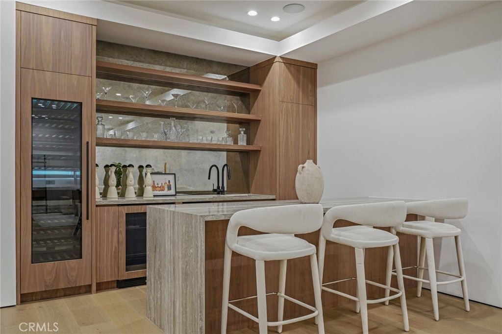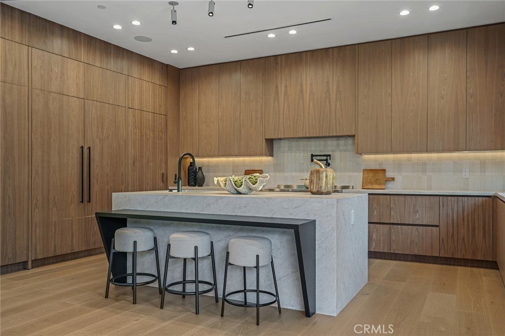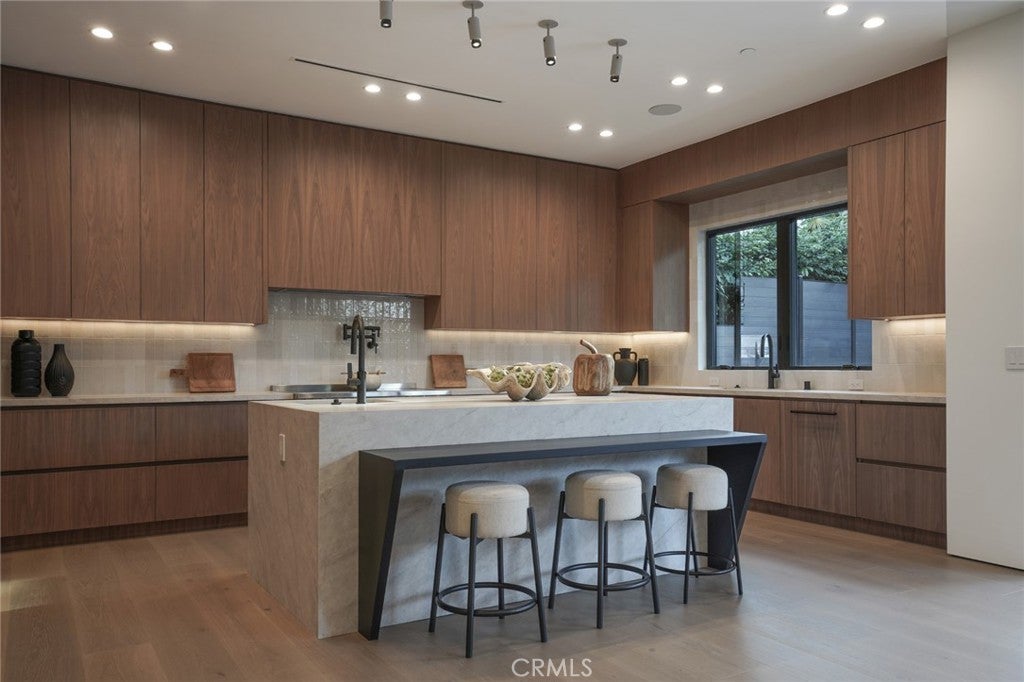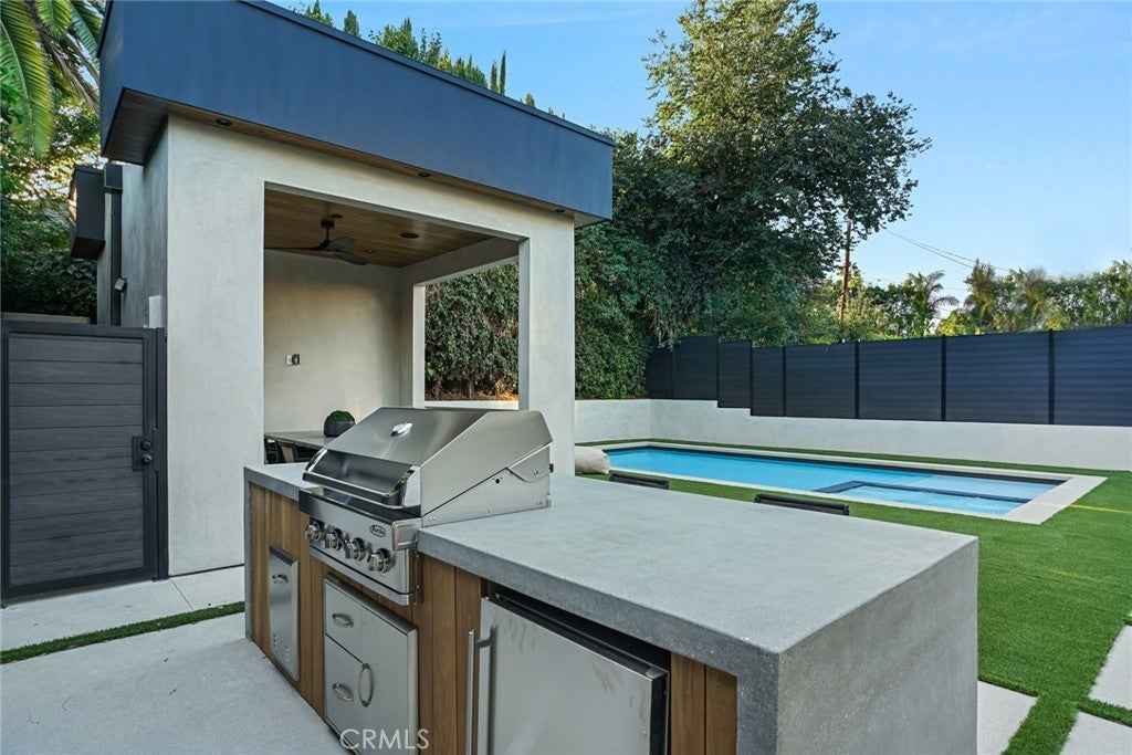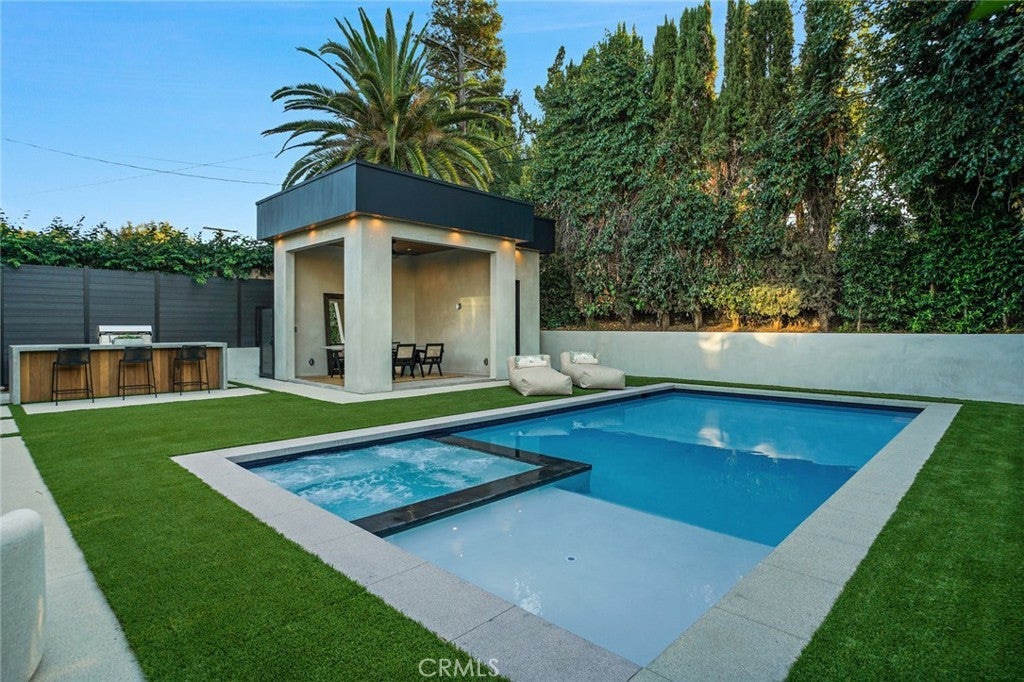 Welcome to this exceptional 5-bedroom, 6.5-bathroom modern masterpiece spanning 5,400 sq ft across three thoughtfully designed levels, complete with ELEVATOR ACCESS to all 3 floors . Perfectly situated just moments from Ventura Blvd, you’ll enjoy unparalleled walkability to some of the city’s best restaurants, cafés, and boutique shopping. As you arrive, the striking architectural façade sets the tone for what lies inside—sophisticated elegance with a contemporary edge. Step into an expansive open-concept floor plan featuring soaring ceilings, sleek finishes, and an abundance of natural light. The gourmet chef’s kitchen seamlessly flows into spacious living and dining areas, creating the ultimate entertainer’s layout. Floor-to-ceiling glass doors open to a backyard oasis, where a sparkling pool, spa, and outdoor cabana offer the perfect setting for both relaxation and gatherings under the California sun. Five generously sized bedrooms include a luxurious primary suite with a spa-inspired bathroom, an expansive walk-in closet, and a private balcony showcasing stunning views of the surrounding greenery. From this vantage point, you’ll feel immersed in nature, with lush trees wrapping the property in beauty and privacy. Every secondary bedroom is en-suite, providing comfort and seclusion for family and guests. A private home theater delivers the ultimate cinematic experience, while the stylish bar in the basement makes entertaining effortless. The home also includes designer walk-in closets, custom cabinetry, a two-car garage with a sleek wood-paneled door, and outdoor dining and lounging spaces designed for year-round enjoyment. With an elevator providing easy access to all three levels, every detail has been carefully crafted for both luxury and convenience. This home blends lifestyle and sophistication in one of the most desirable locations in Sherman Oaks. With its thoughtful design, high-end amenities, breathtaking views, and prime proximity to Ventura Blvd, this property is more than just a home—it’s a lifestyle statement.