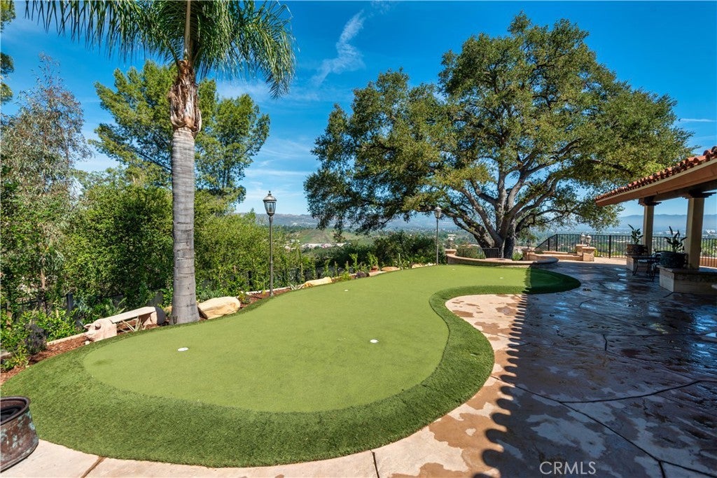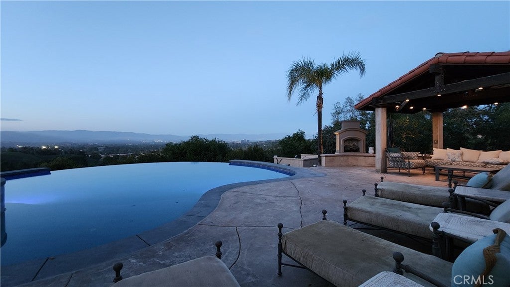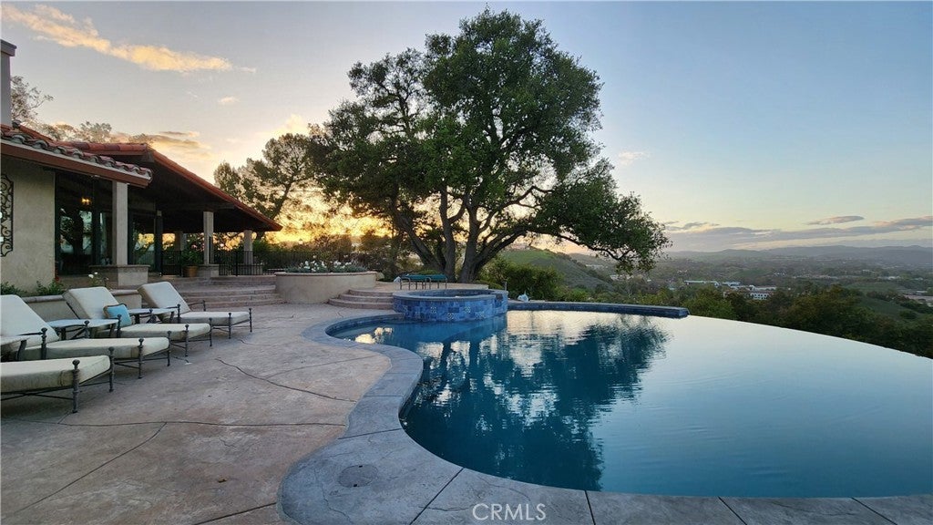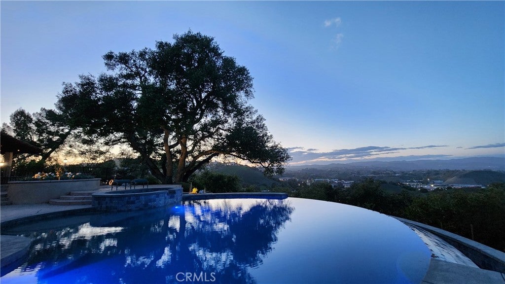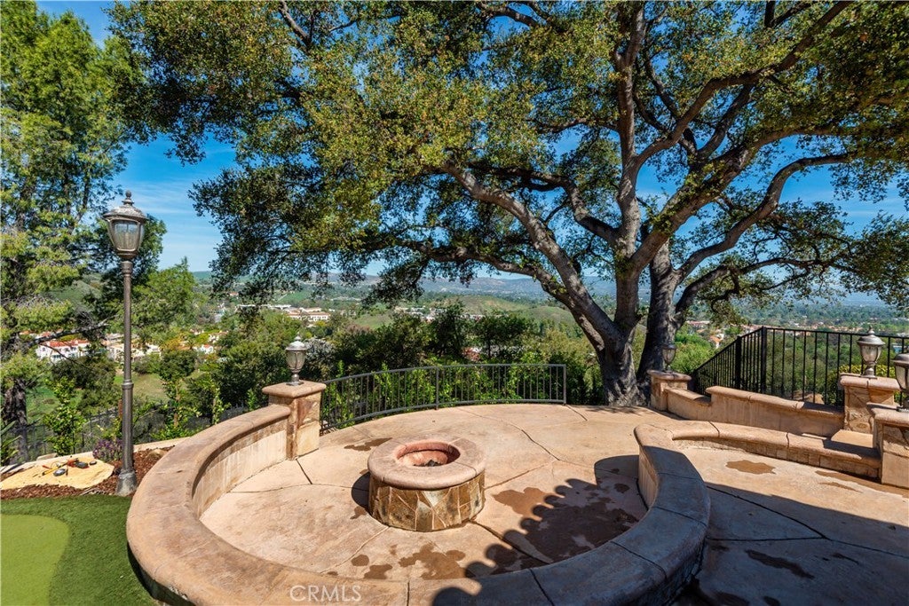 A very rare find! Stunning, absolutely panoramic views highlight this privately gated, nicely upgraded one-story home on a superbly private lot. Amenities include a spacious chef's kitchen with two islands, freestanding Viking Range and a sunny breakfast room, plus a large great room with a vaulted, open beam ceiling, stone fireplace, & walls of glass capturing the expansive views, with an adjoining, open dining room for casual entertaining, and two private offices. The big primary suite includes a fireplace, stone bath with walk-in shower & soaking tub, dual vanities, and a large walk-in closet. There is also an adjoining room (second office) that could be an additional large walk-in closet if desired. Additional amenities include wood floors, stone countertops and big picture windows that fill the home with natural light. The lushly landscaped grounds include a superb, just remodeled, infinity edge swimmers pool with spa, two covered patios, full barbecue center with refrigerator, stone countertops & seating, outdoor fireplace, and beautiful mature oak trees. With a prime location near several public and private schools, just minutes from Calabasas Park Lake and The Commons shopping center, this custom home has much to offer.