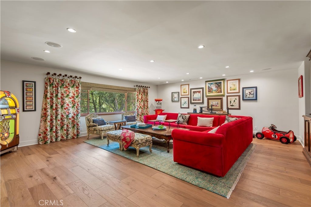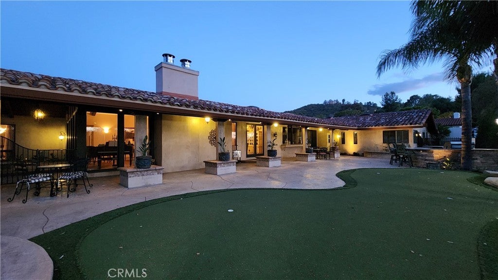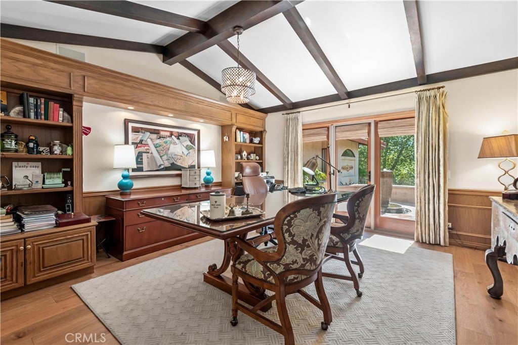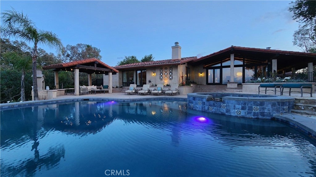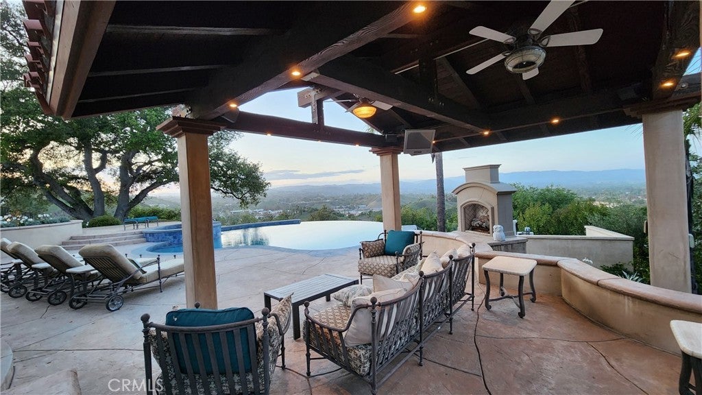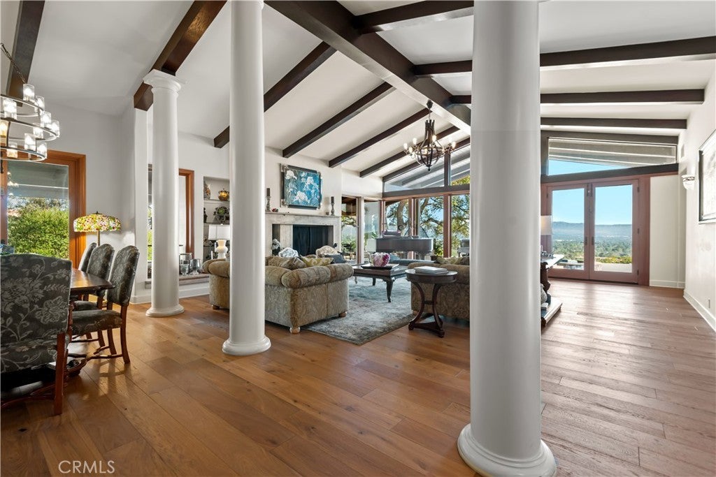 A very rare find! Stunning, absolutely panoramic views highlight this privately gated, nicely upgraded one-story home on a superbly private lot. Amenities include a spacious chef's kitchen with two islands, freestanding Viking Range and a sunny breakfast room, plus a large great room with a vaulted, open beam ceiling, stone fireplace, & walls of glass capturing the expansive views, with an adjoining, open dining room for casual entertaining, and two private offices. The big primary suite includes a fireplace, stone bath with walk-in shower & soaking tub, dual vanities, and a large walk-in closet. There is also an adjoining room (second office) that could be an additional large walk-in closet if desired. Additional amenities include wood floors, stone countertops and big picture windows that fill the home with natural light. The lushly landscaped grounds include a superb, just remodeled, infinity edge swimmers pool with spa, two covered patios, full barbecue center with refrigerator, stone countertops & seating, outdoor fireplace, and beautiful mature oak trees. With a prime location near several public and private schools, just minutes from Calabasas Park Lake and The Commons shopping center, this custom home has much to offer.