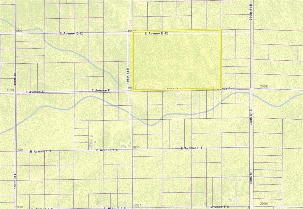 61.79 flat acres in the Hi Vista area of East Lancaster. The lot has 2011 feet of frontage on Ave F and 1339 feet along 195th St E to Ave E12 which runs along the north border of the lot. APN 3316-010-028. Power poles are a quarter mile away on 195th St E and about 700 feet away on 200th St E. Zoned A11 for agriculture, animals, and a home. Located close to the ''Kill Bill'' church film site.
