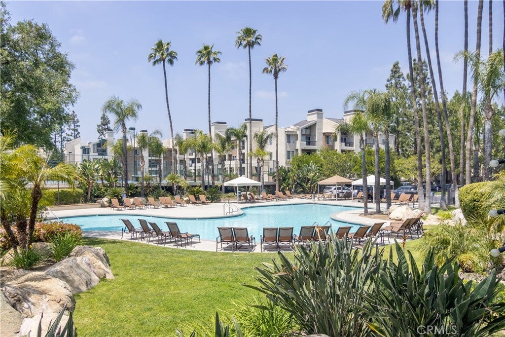 Enjoy resort-style living in this rare 3-bedroom, 2-bath penthouse. This highly sought-after single-level, top-floor condo is tucked away in a quiet setting with serene courtyard and treetop views. The light-filled living room features soaring vaulted ceilings, a cozy fireplace, and a private balcony. The kitchen boasts new appliances, and the spacious primary suite includes mirrored closets. Additional highlights include abundant storage, in-unit laundry, and two tandem covered garage parking spaces. Located in a 24-hour guard-gated community offering four pools and spas, multiple tennis courts, a state-of-the-art fitness center, and 24/7 security patrols. Ideally situated near freeways, public transportation, shopping, dining, movie theaters, parks, and The Village at Westfield Mall.