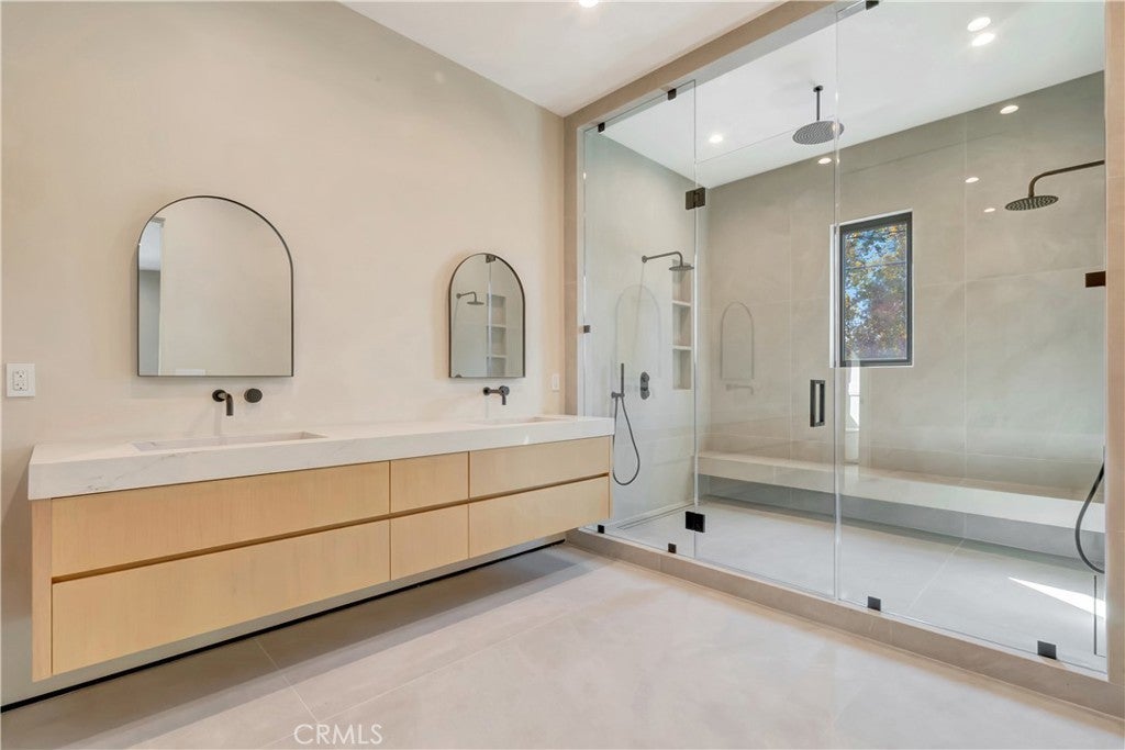 Welcome to this warm and sophisticated residence, masterfully designed with elegant finishes, abundant natural light, and timeless style. Step inside a bright open-concept floor plan, highlighted by expansive living and dining areas, chic wide-plank flooring, and a designer powder room with a statement vanity. The gourmet chef’s kitchen boasts custom wood cabinetry, a grand center island, premium countertops, and top-of-the-line finishes — perfect for everyday living and effortless entertaining. The first floor also features a spacious guest suite complete with a walk-in closet and a private ensuite bath. Upstairs, discover three luxurious bedroom suites, each with a walk-in closet and private bathroom. The primary retreat impresses with a custom grand walk-in closet, a spa-inspired bathroom with soaking tub and oversized walk-in shower, plus a private balcony overlooking the backyard oasis. The resort-style backyard is designed for both relaxation and entertainment, featuring a large patio, built-in BBQ, and a sparkling heated pool with spa and Baja shelf. Adding incredible versatility, a detached 2-bedroom, 1-bath ADU with its own living room and kitchenette provides the perfect option for guests, extended family, or rental income. Nestled on a tranquil tree-lined street, this property offers the best of both worlds — peace and privacy, yet only minutes from premier shopping, dining, and easy access to the 101 Freeway.