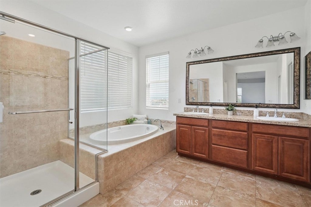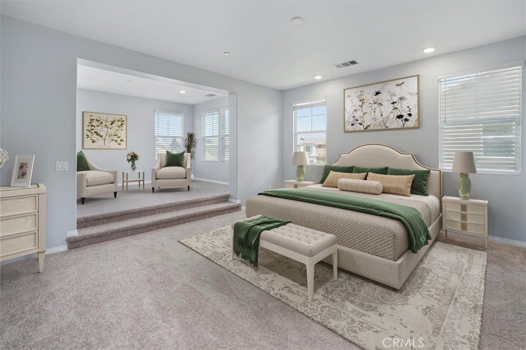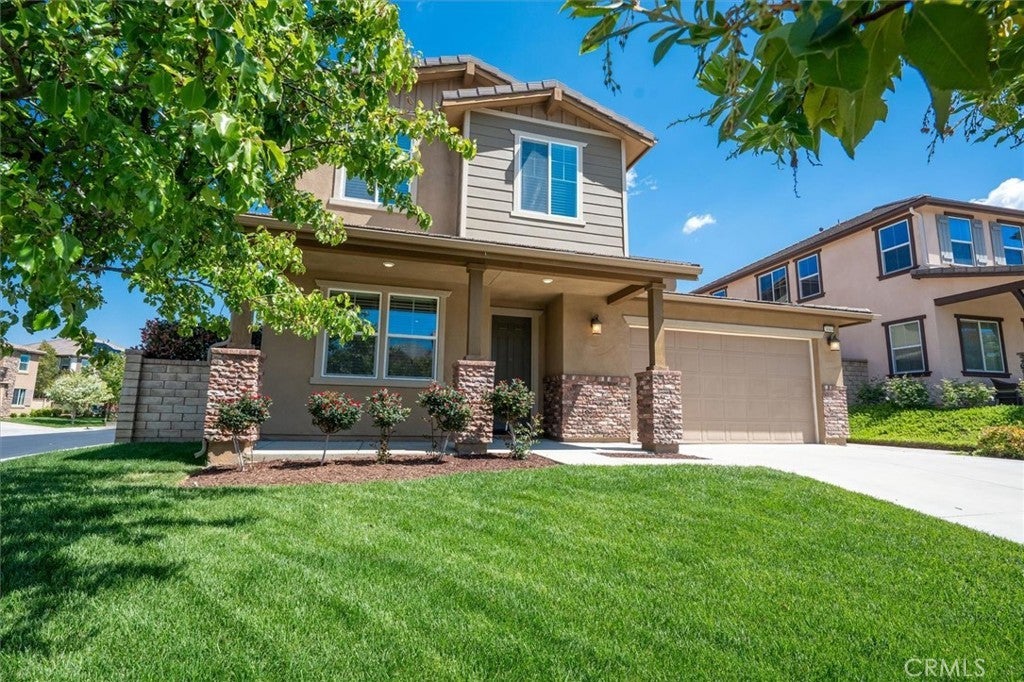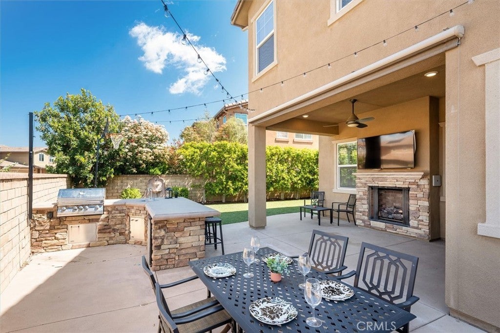 Welcome to this stunning 5 bedroom plus loft home with owned solar and situated on a prime corner lot in the highly sought after gated community of West Hills! This beautiful home combines elegance, comfort and exceptional design in one impressive package. Enjoy an open-concept floorplan perfect for entertaining, featuring a spacious family room with a cozy gas fireplace and a gourmet chef’s kitchen with granite countertops, stainless steel appliances, double ovens, a walk-in pantry, and an oversized island that flows effortlessly into the dining area. A formal dining room opens to a beautifully designed outdoor living space complete with a built-in fireplace, twinkling string lights, and lovely views—perfect for relaxing or entertaining under the stars. The main level also offers a private guest/in-law suite with a full bath. Upstairs, you'll find a large loft, three generously sized secondary bedrooms (each with walk-in closets), a full bath with dual sinks, and a well-appointed laundry room with additional linen storage. Retreat to the luxurious primary suite featuring a spacious sitting area perfect for a nursery, home gym, or office, plus an expansive en-suite bath with dual vanities, a soaking tub, a walk-in shower, and two oversized walk-in closets. Additional features include: fresh interior paint, new carpet throughout, owned solar, a 3-car tandem garage, whole house fan, low-maintenance landscaping with artificial turf, and a built-in backyard BBQ station for seamless California living. Residents of West Hills enjoy access to top-tier amenities, including three sparkling pools, BBQ areas, a clubhouse, scenic walking trails, and 24/7 gated security. Conveniently located near West Creek Elementary and Rio Norte Junior High, lovely parks, shopping, dining, and major freeways. Don’t miss your chance to own this beautifully updated home in one of Valencia’s most prestigious gated communities!