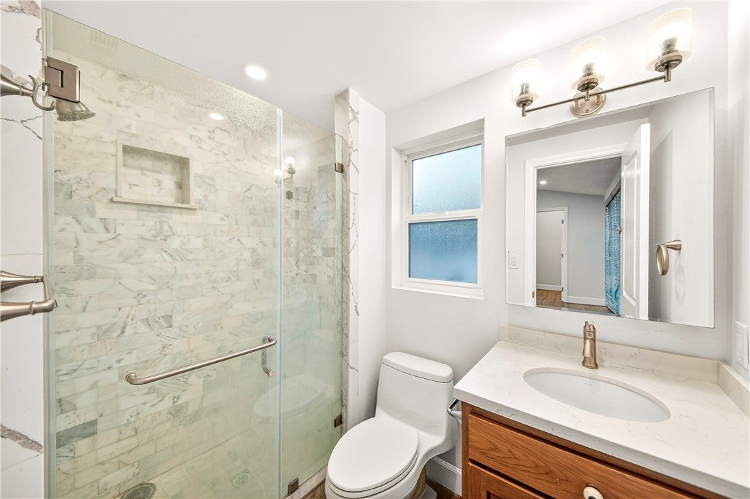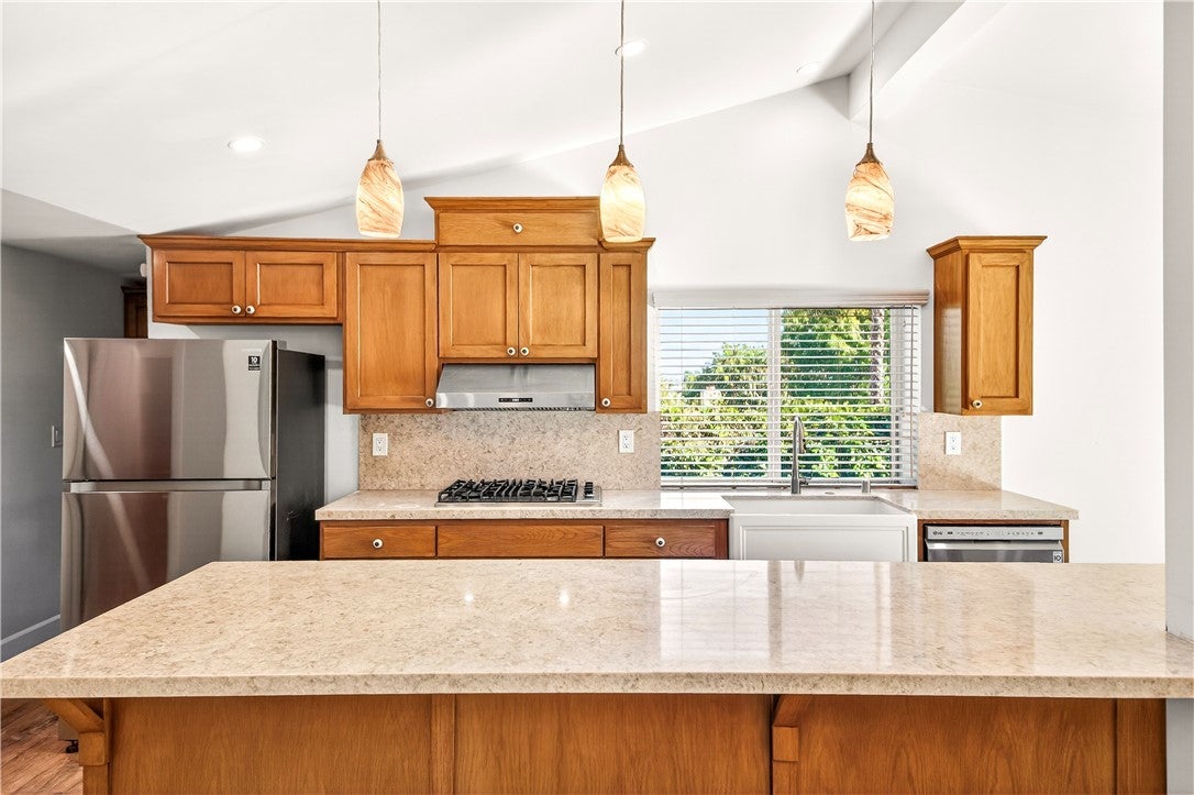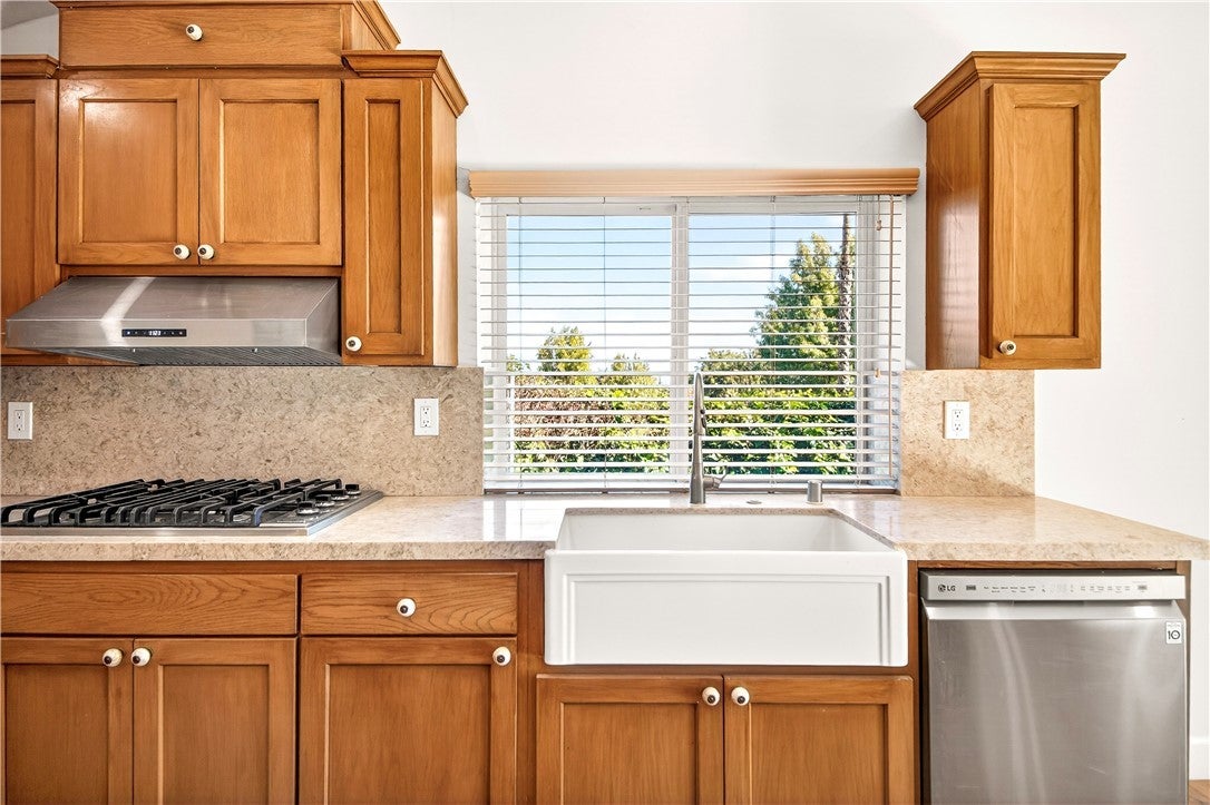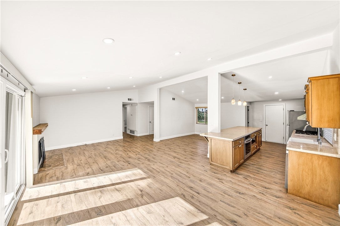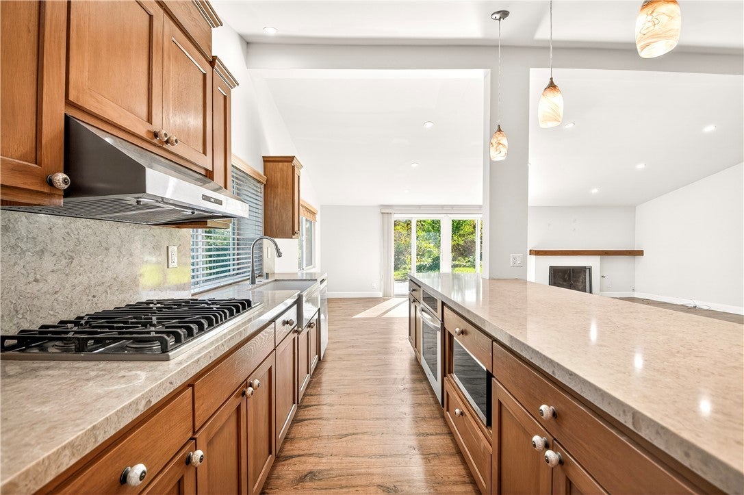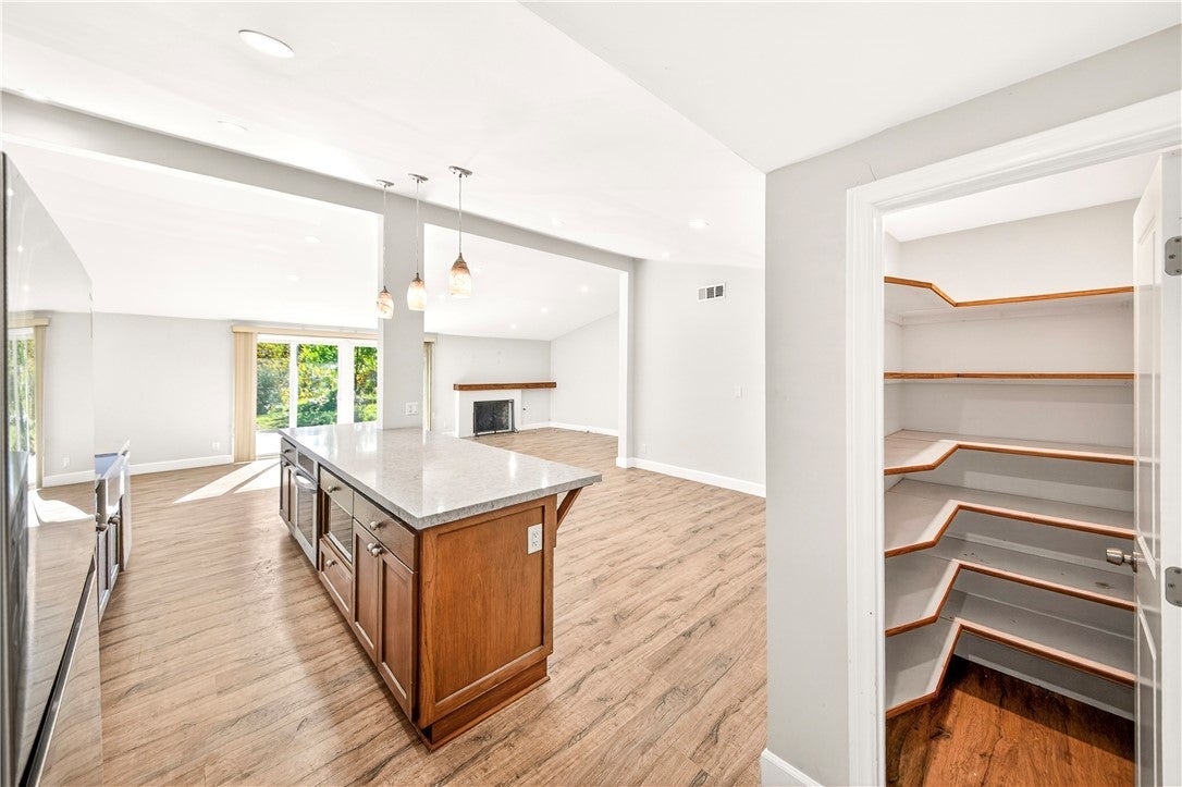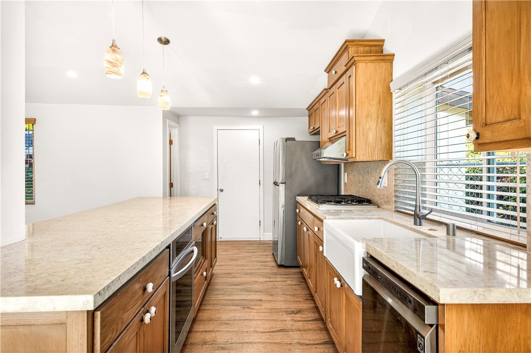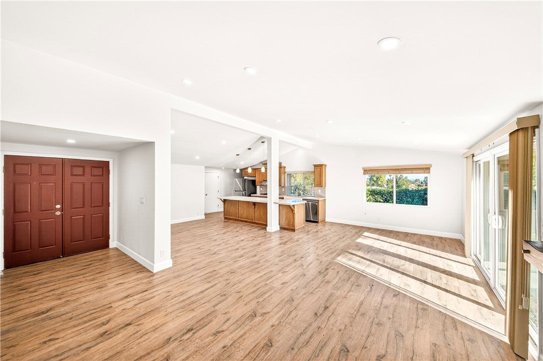 Welcome to this beautifully renovated 3-bedroom, 2-bathroom home situated on a spacious lot in the highly sought-after Carlton Terrace of Woodland Hills. The home is filled with natural light and features an open floor plan with vaulted smooth ceilings, creating a bright and comfortable living environment. The interior showcases neutral wood laminate flooring throughout and a stunning new kitchen complete with quartz countertops, stainless steel appliances, a 4-burner gas Viking cooktop, and a breakfast bar. The open living and dining areas flow together seamlessly and are enhanced by a cozy fireplace, making the space ideal for both everyday living and entertaining. The primary bedroom serves as a relaxing retreat, offering a large closet and a private ensuite bathroom with a marble shower and quartz vanity. The additional bedrooms feature mirrored wardrobes and share a fully updated full bathroom. Sliding glass doors lead to a generous backyard that includes a concrete patio, grassy area, and scenic views—perfect for outdoor relaxation and enjoyment. The home also includes a 2-car attached garage with direct access, providing added convenience and storage. Located in a quiet and safe neighborhood, the home offers convenient access to the 101 freeway, Ventura Boulevard, The Village, Pierce College, and nearby shopping and dining. This move-in-ready home provides comfort, space, and a prime location, making it an excellent choice for tenants seeking a well-maintained property with plenty of room to enjoy both indoors and outdoors.