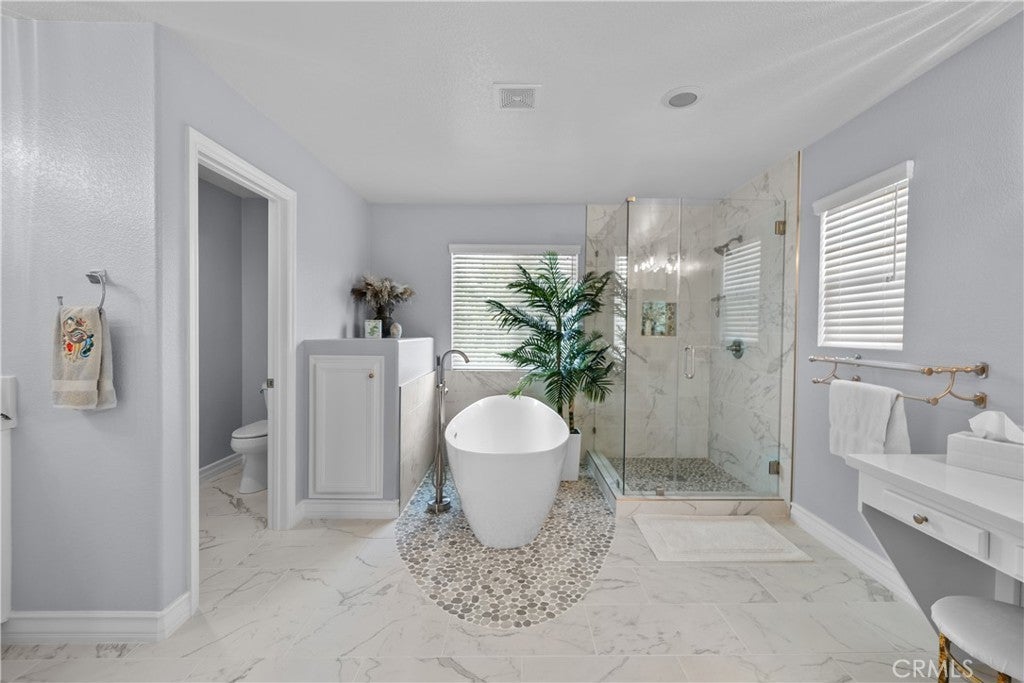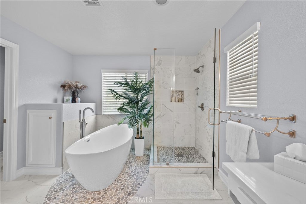Welcome to this beautifully updated Huntington Collection home located in the highly sought-after Tesoro del Valle community. From the moment you arrive, you’ll be captivated by the attractive curb appeal, lush landscaping, inviting front porch with sitting area, and grand double-door entry. Step inside to nearly 3,500 sq. ft. of thoughtfully designed living space, offering 5 bedrooms (including one conveniently located downstairs), 3 bathrooms, formal living and dining rooms, a spacious great room, laundry room, and a 3-car garage. Cathedral ceilings in the entry create an impressive first impression, while abundant windows flood the home with natural light. The heart of the home is the beautifully updated kitchen, featuring premium Thermador appliances, including a Wi-Fi-enabled oven, a microwave-convection oven combination, and sleek finishes throughout. This expansive kitchen offers generous cabinetry, ample counter space, a large island, coffee bar, and a massive walk-in pantry—perfect for both everyday living and entertaining. All bathrooms have been tastefully upgraded, offering a fresh, modern feel with designer finishes. The spacious primary suite is a true retreat, showcasing double-door entry, a private sitting area, romantic balcony with city-light views, and a large walk-in closet. The spa-inspired ensuite bath features dual sinks, a soaking tub, separate shower, and abundant linen storage. Secondary bedrooms are generously sized with ample closet space, while the downstairs bedroom and adjacent bath are ideal for guests or multi-generational living. Step outside to a private entertainer’s backyard complete with a large, covered patio, beautiful landscaping, and multiple spaces for outdoor dining and relaxation. Enjoy the lifestyle Tesoro del Valle is known for—close to parks, award-winning schools, shopping, and convenient freeway access. This move-in-ready home seamlessly blends timeless elegance with modern upgrades and is truly one you won’t want to miss.