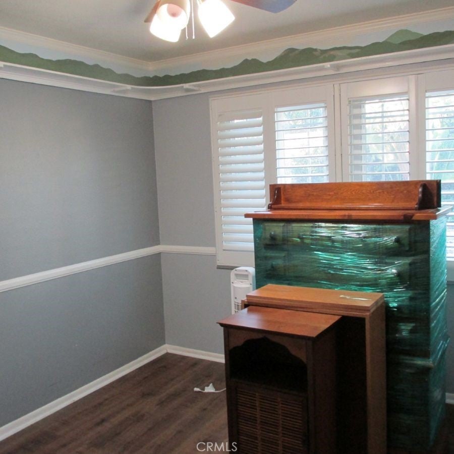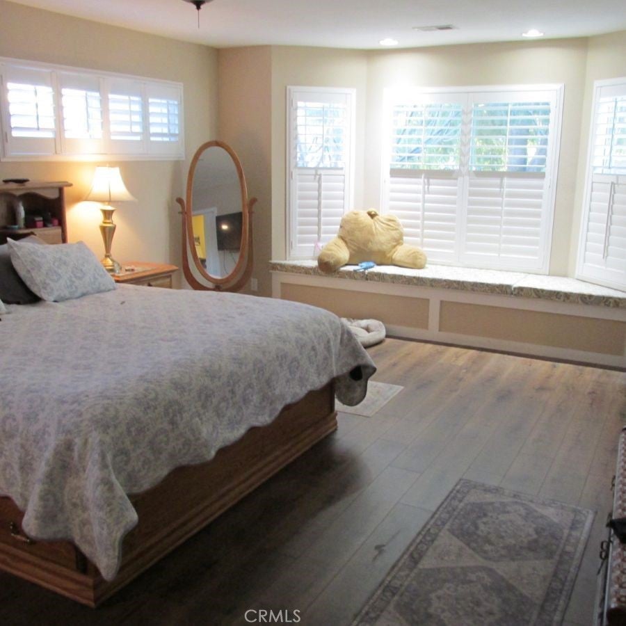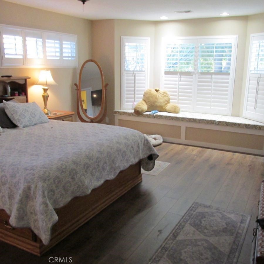 This 3 bedroom 2 bath single story home comes with a large attached den, wood look tile floors throughout with laminate floors in the 3 bedrooms. Kitchen has been upgraded with quartz counters and hardwood cabinets. Primary bedroom was enlarged and has a bay window with a window seat, walk in closet in addition to the regular closet. The ensuite has a walk in shower and double vanity. All bedrooms have plantation shutters and ceiling fans. Direct access garage with storage. Backyard includes a newer pergola over the eating area, a pool and spa that have been resurfaced and retiled. New pool heater, newer pool equipment, and new water heater. Solar panels for all electrical needs including the pool.