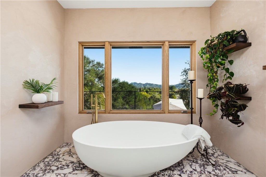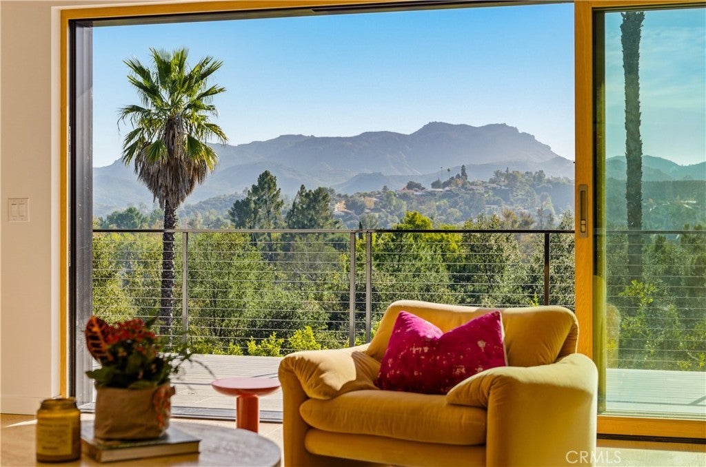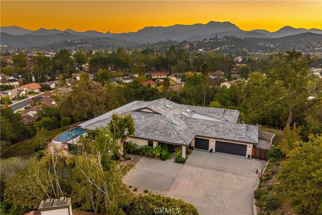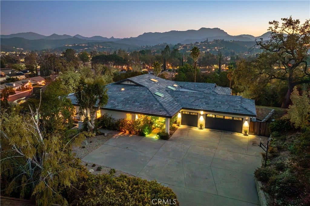 Set on a private and secluded flag lot, this extraordinary single story Westlake Village retreat was completely reimagined in 2021, blending architectural sophistication with warm, livable spaces and unforgettable views. A true hidden gem, the home has been transformed with custom Weather Shield windows throughout and expansive sliding doors spanning the entire main living area - creating a seamless fusion of indoor and outdoor living. Inside, white oak flooring (engineered) flows through an open-concept layout where the kitchen, dining area, and great room are all oriented to capture sweeping mountain, sunrise, and sunset vistas. The Italian-designed kitchen is a masterwork of style and function, featuring a walk-in pantry equipped with its own HVAC, custom cabinetry, and top-tier appliances including a Gaggenau induction stove with an additional gas burner, Miele oven and refrigerator, Fisher & Paykel dishwasher, and Thermador wine refrigerator. A thoughtfully engineered climate system includes multiple mini-split units throughout the home, ensuring individualized comfort in every space. Whole-home Sonos audio, Cat 6 wiring, and a robust security network with 20 cameras for additional peace of mind. A separate laundry room adds everyday practicality. A sprawling balcony connects the primary suite, media room, secondary bedroom, and main living spaces, creating a continuous indoor–outdoor experience. The primary suite offers a sanctuary with a walk-in closet, sitting area, and a spa-caliber bath featuring a marble shower/tub floor and microcement walls - a striking retreat. The media room, complete with custom built-ins, surround sound, and a spiral staircase to a loft hideaway, provides a perfect spot for laid-back evenings or creative escapes. Four additional bedrooms offer generous flexibility for offices, guests, or family with many showcasing the home’s remarkable views. The home is equipped with a three car garage, solar panels, and a Tesla Powerwall, supporting sustainable and efficient living. Outdoors, a sparkling pool, fire pit, and enchanting Italian garden create an idyllic backdrop for sunset dinners and relaxed gatherings. Thoughtful design, luxurious finishes, and commanding views define this remarkable Westlake Village residence as an architectural retreat that offers both privacy and presence. Truly one not to be missed.