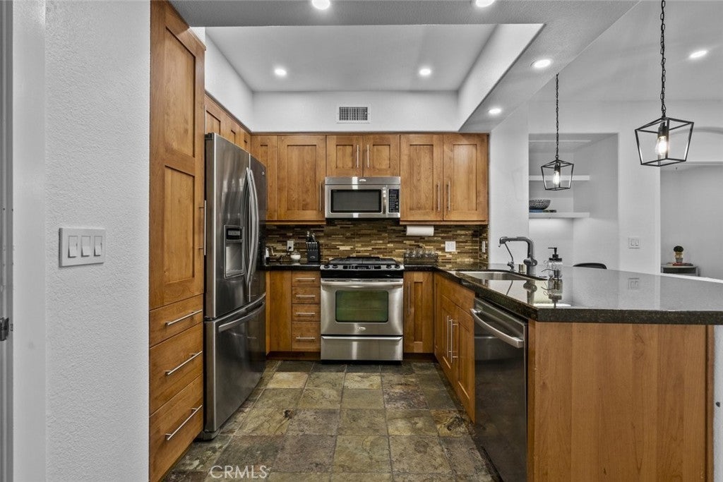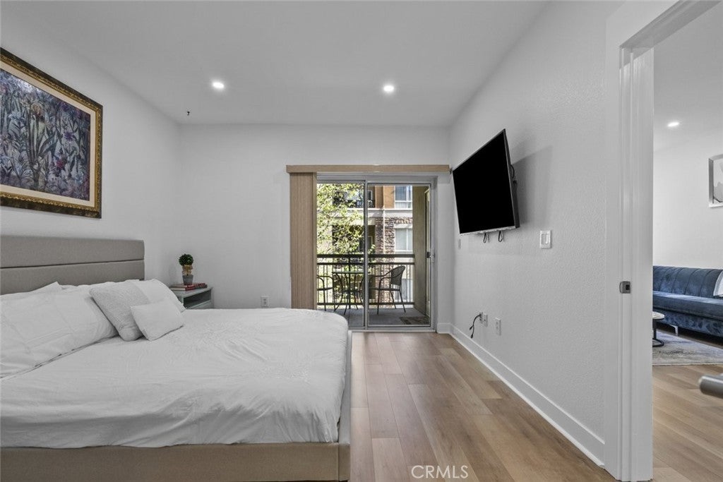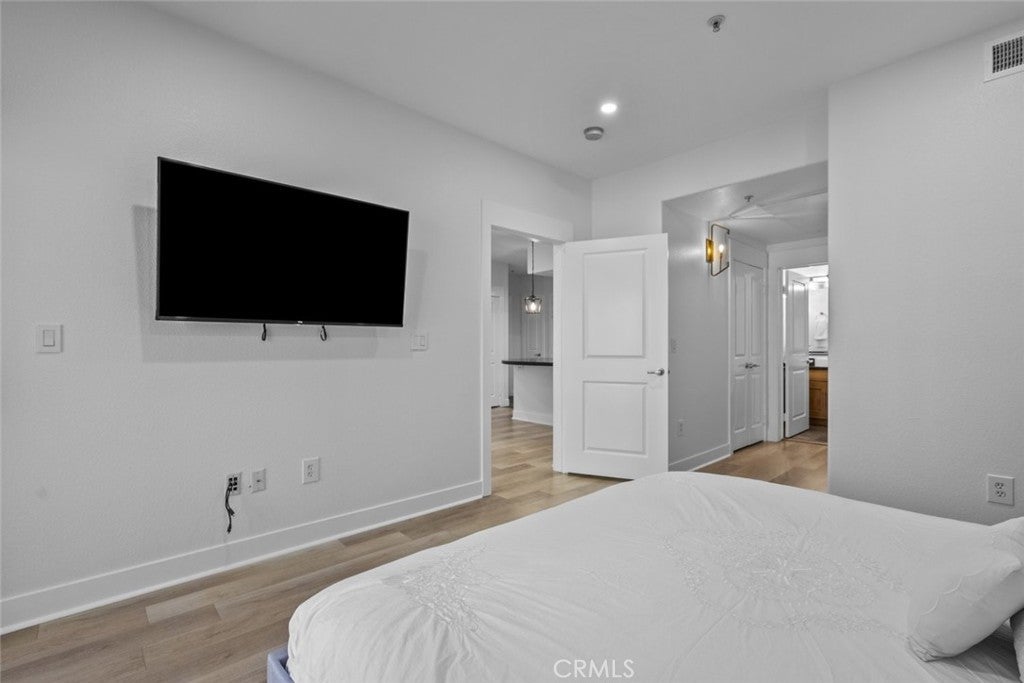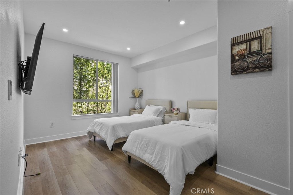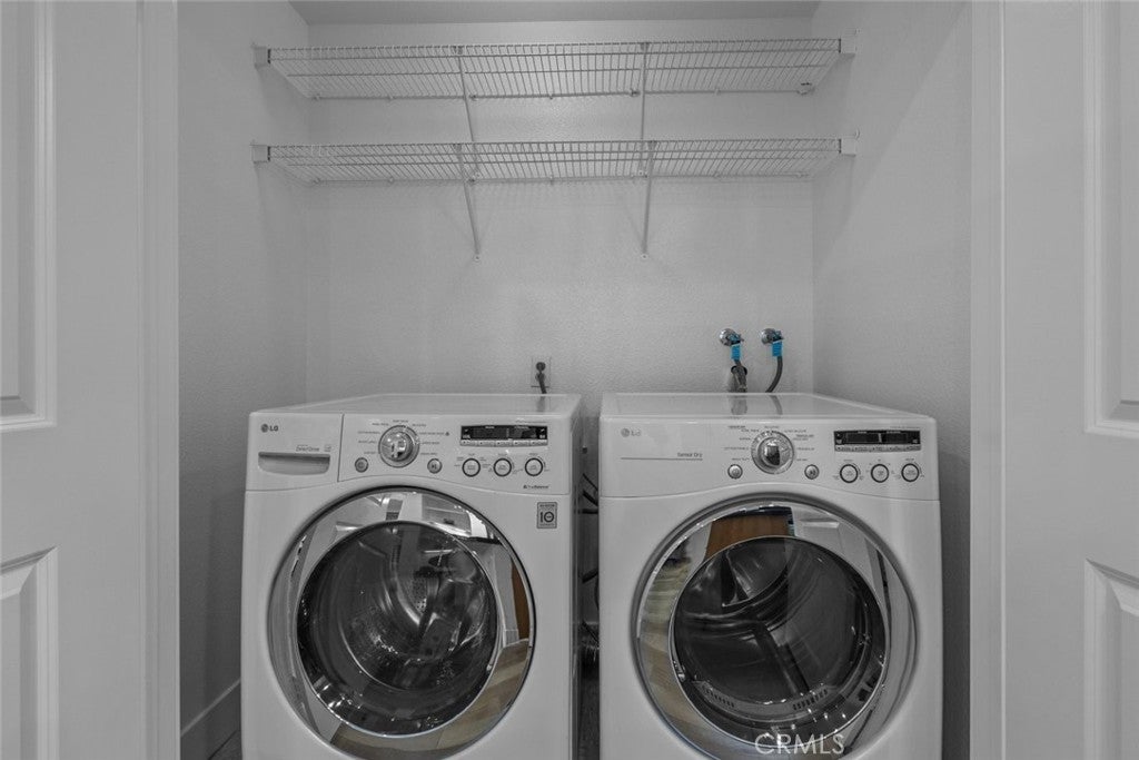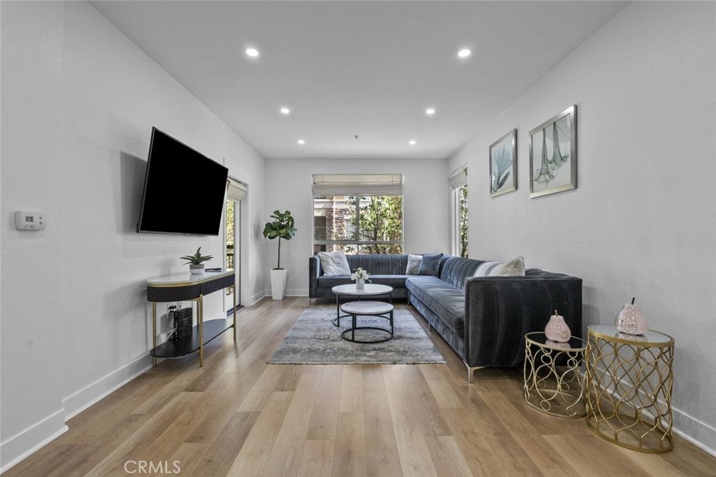 An exquisite and fully furnished condo with in-unit laundry, right across from major shopping centers and a variety of entertainment, residing within the prestigious Madison of Santa Clarita! Completely illuminated by both large windows and recessed lighting throughout, find a 1,090-sqft floorplan detailed with beautiful laminate and stone flooring, tons of built-in storage space, and a fabulous private balcony enjoying scenic views of the courtyard below. The lovely open concept allows for seamless entertaining between the dining and living spaces, and even includes a built-in office nook with shelving and extra lighting. Sparkling stone countertops and well-crafter shaker cabinets adorn this user-friendly kitchen equipped with built-in stainless-steel appliances while also including a comfortable breakfast bar with two pendant lights overhead. Both bedrooms are calming spaces featuring built-in closets with one bedroom including a dual entry bathroom. The large primary bedroom enjoys the exclusive benefit of separate access out to the balcony plus an en-suite bathroom fitted with a corner double sink vanity. The perfect place to call home with this sought-after community offering of a beautiful courtyard, fitness center/gym, lounge areas, recreation space, dining areas, shaded outdoor picnic areas, and the glittering waters of the sun washed pool plus spa provided to all residents. Right in the heart of beautiful Santa Clarita and nearby the Valencia Westfield Mall, a variety of shops, restaurants, entertainment, markets, plus city transportation, and easy access to the 5 freeway!
