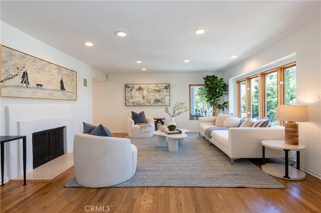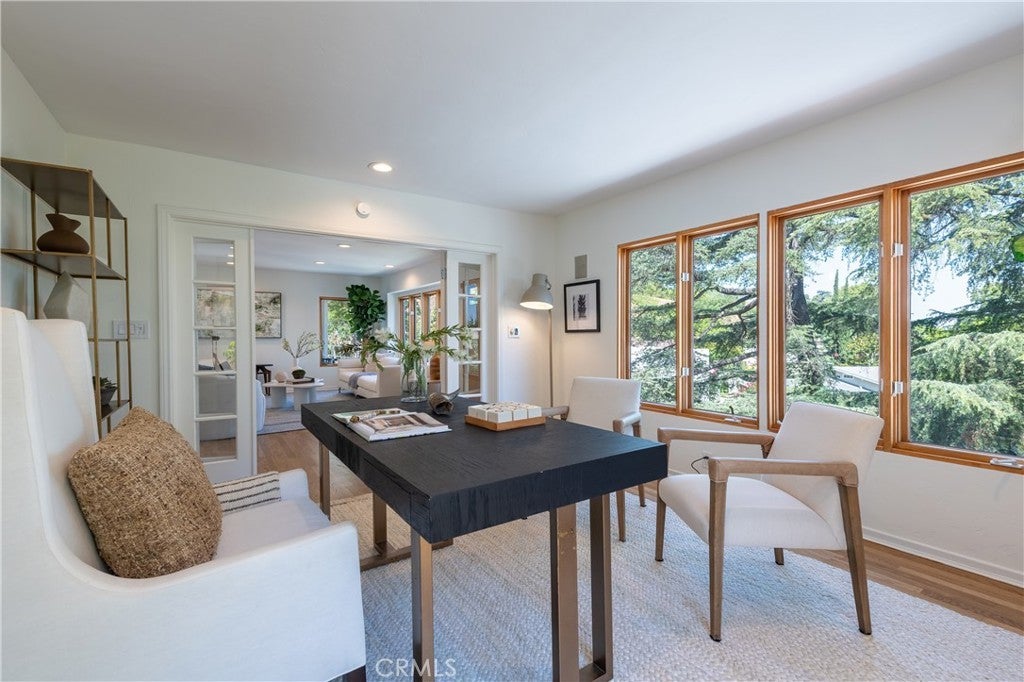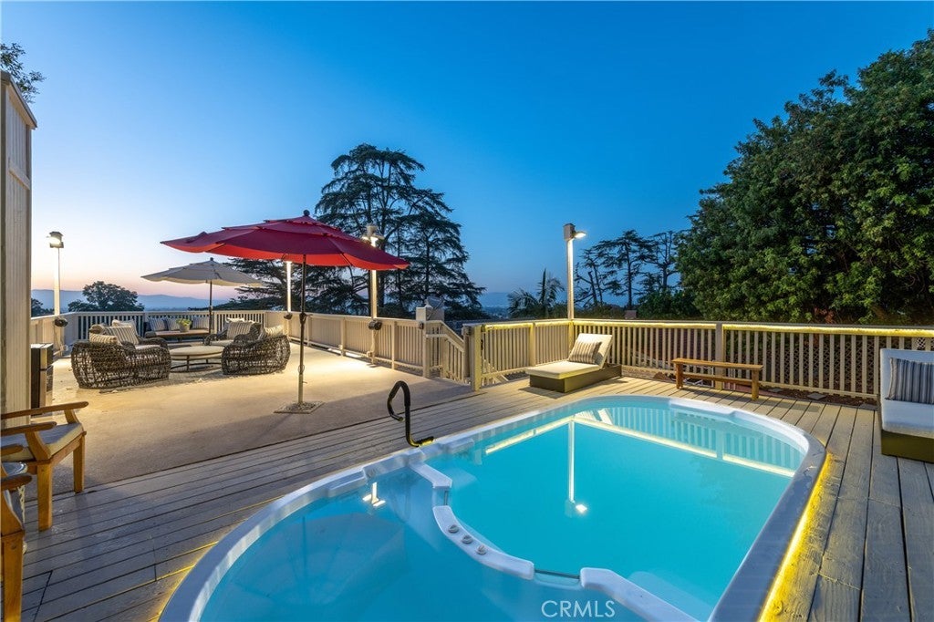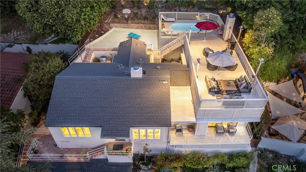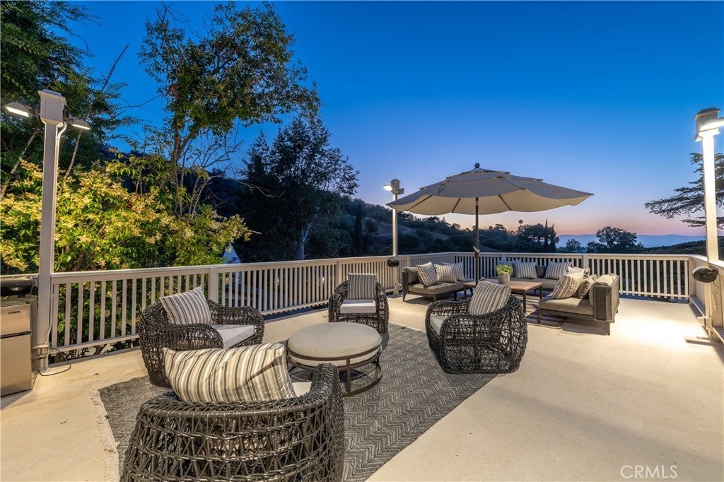 Set on a quiet, sought-after street south of the Boulevard in Sherman Oaks, this elevated hillside residence offers exceptional privacy, treetop views, and a serene retreat-like setting. Designed for entertaining, the property features multiple outdoor spaces, including patios, a sports court, a gazebo, and an expansive approximately 900-square-foot deck with pool, spa, lounge areas, and sweeping mountain and valley views. The home flows seamlessly indoors to multiple inviting living spaces, including a family room with exposed wood beams and a fireplace, a living room with another fireplace ideal for intimate gatherings, and enjoying the tree-top views. The updated kitchen features porcelain tile flooring, refreshed countertops, and premium stainless-steel appliances by Wolf, Dacor, and Bosch, with a breakfast nook and bar seating opening to outdoor dining terraces. The primary suite offers a private sanctuary with a sitting area, balcony, and renovated spa-style bath. Two additional bedrooms provide flexibility, including one with patio access and one currently used as an office. Located within the Sherman Oaks Charter Elementary School District and near scenic hiking trails, this home delivers a peaceful hillside escape with convenient access to the Westside and Ventura Boulevard.