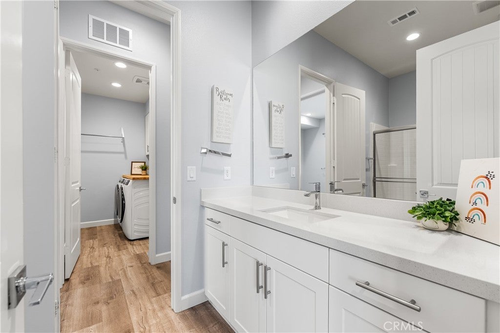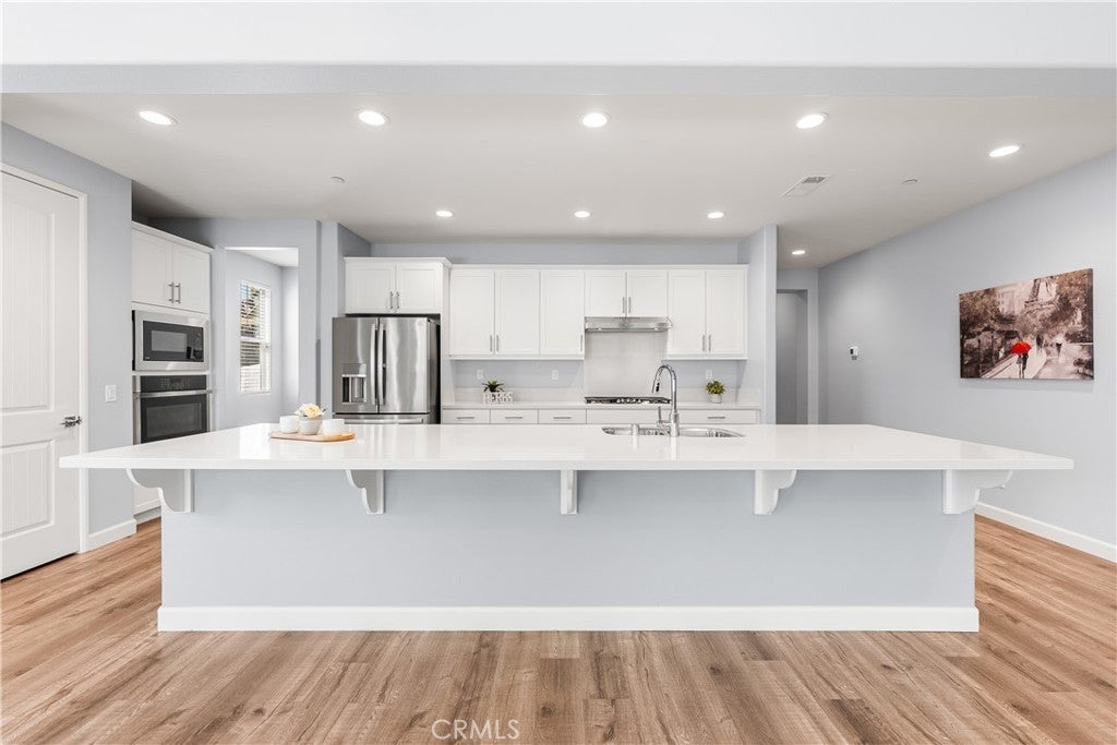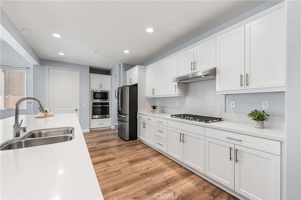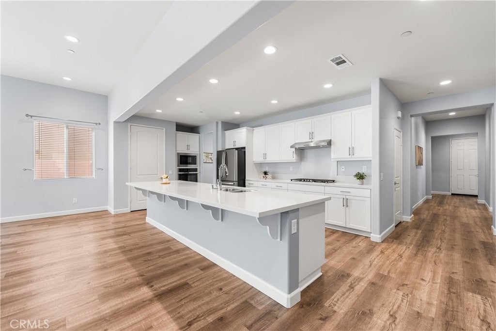 This home is pure perfection! A newer build that absolutely sparkles from the moment you arrive, with standout curb appeal, low-maintenance front landscaping, and an inviting presence that sets the tone for what's inside. The layout is both unique and highly versatile—ideal for multi-generational living or potential rental income. The upstairs suite features a private living area, bedroom, full bathroom, and kitchenette, thoughtfully positioned near the garage entrance to allow for separate access, added privacy, and convenience for guests or extended family. On the main level, the primary suite is a true retreat with a spacious en-suite bathroom offering dual vanities, a separate soaking tub and shower, and a large walk-in closet. A secondary bedroom and office share a well-designed Jack-and-Jill bathroom, making this layout perfect for families or remote work. The kitchen is a true showstopper, featuring quartz countertops, a massive island that comfortably seats 6-8, ample cabinetry, a pantry, and a whole-house water filtration system. Custom vinyl plank flooring flows throughout the home, enhancing both style and durability. The kitchen opens seamlessly to the bright living room, where tall ceilings and a cozy fireplace create a warm, open atmosphere. Step outside to a beautifully designed backyard with grass, custom stamped concrete, full-length covered patio spanning the entire rear of the home, gas hookups ready for an outdoor kitchen, extra drainage, gutters, and bird wiring around the roof. There's also room for RV parking—perfect for toys or additional storage. The laundry room includes extra storage cabinetry for added functionality. Located in highly desirable West Palmdale, just minutes from shopping, schools, and the 14 Freeway, this home offers the perfect blend of luxury, flexibility, and everyday convenience.