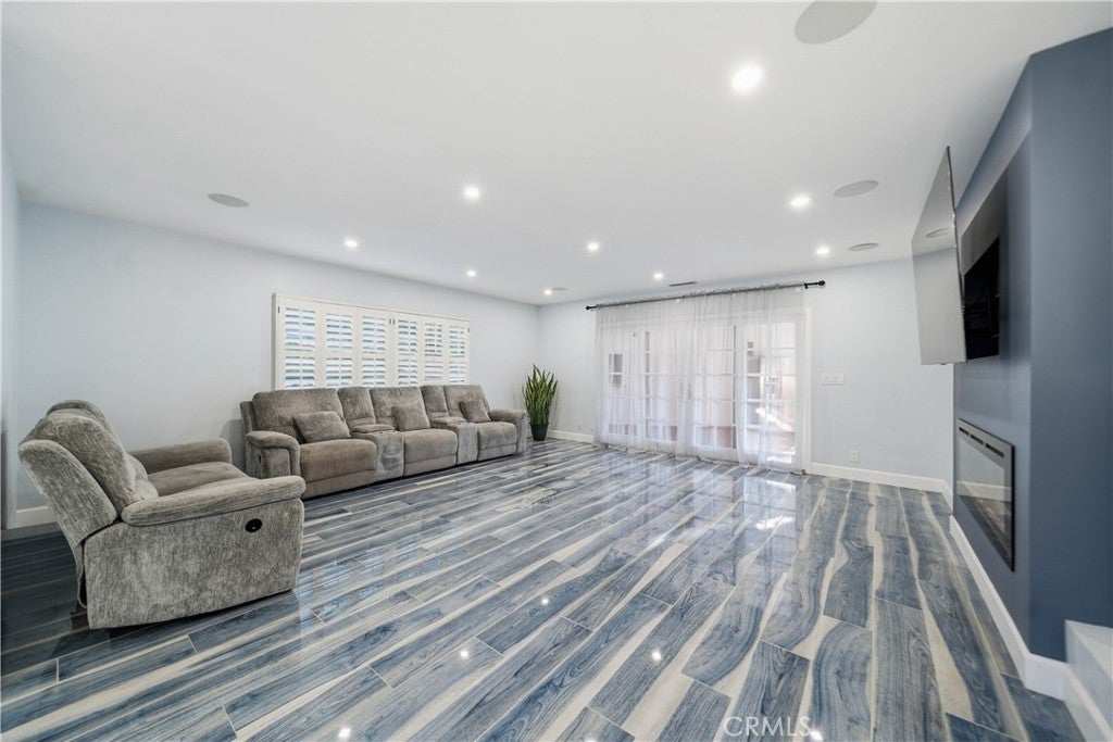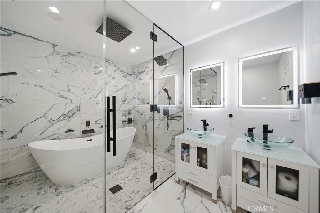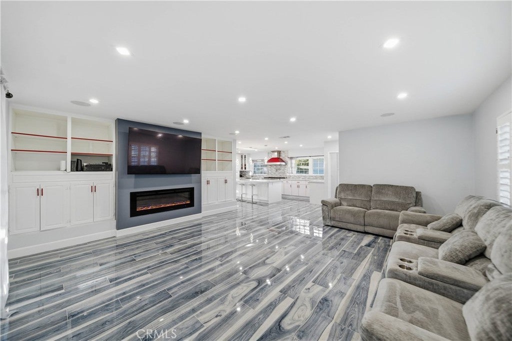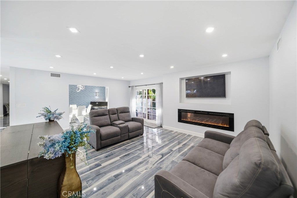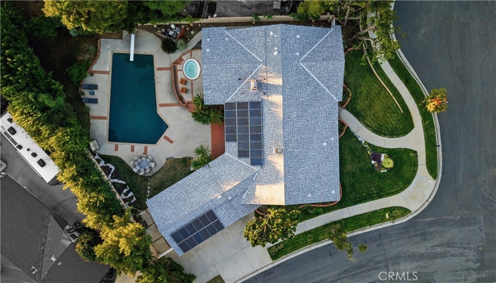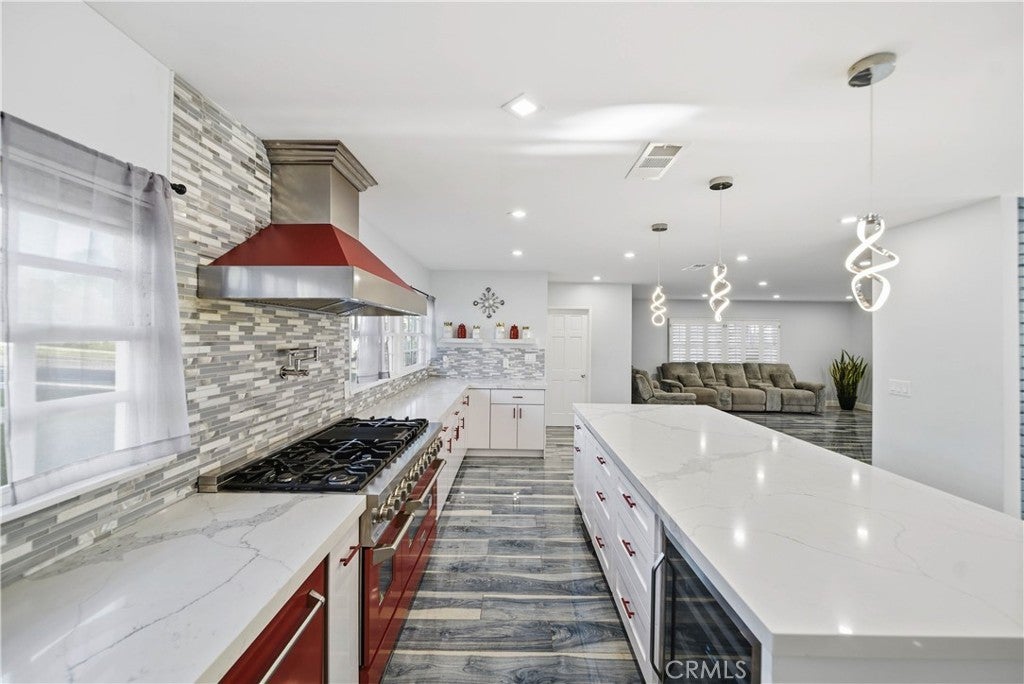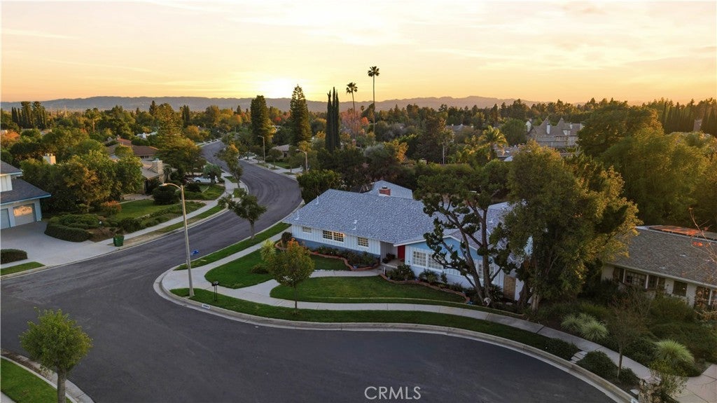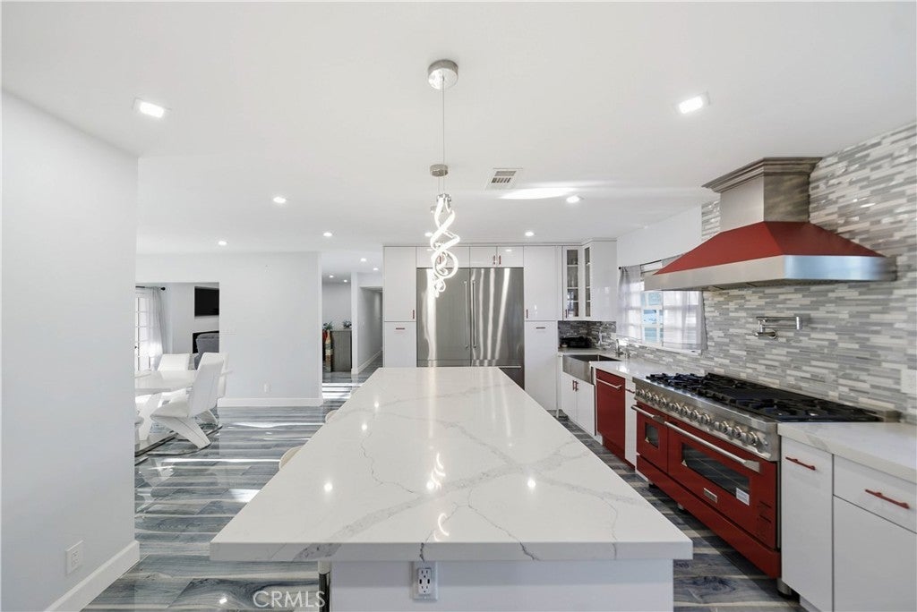 Brand new roof, solar panels in place, ADU potential, and a prime location that continues to be a favorite among Northridge buyers. Sprawling single story living in the desirable Scottish Terrace Estates. Nearly 2,800 square feet, all on one level, with elegant porcelain wood-look tile flooring throughout. Step inside to a wide open floor plan designed for both everyday living and entertaining. The gourmet kitchen is positioned at the front of the home and serves as a true focal point. This chef-inspired kitchen is thoughtfully appointed with a high-end ZLINE appliance package, featuring a stainless steel 7-burner double-oven range with statement hood, ZLINE dishwasher, stainless steel farmhouse sink, trash compactor, pot filler, built-in luxury refrigerator, and wine cooler. White cabinetry is elevated with bold red hardware accents, complemented by quartz countertops and a modern gray-toned tile backsplash. The open concept layout flows seamlessly from the kitchen into the family room, formal living room, and dining area. Designed for an indoor-outdoor lifestyle, sliding doors from the main living spaces open to a private backyard retreat featuring a pool and spa, lush greenery, usable lawn, and a massive covered patio with vaulted ceilings. The home offers four bedrooms and three bathrooms. The bath is a standout, featuring a massive glass enclosed wet room with a freestanding soaking tub set against a floor to ceiling tile wall. High-end finishes include sleek matte black hardware and LED backlit mirrors over dual vanities. Situated on a corner lot, this true single story ranch offers a wrap-around lawn, wide concrete driveway, and detached two car garage enhancing both privacy and ADU potential. The home also features a convenient indoor laundry room with washer and dryer hookups and a utility sink for added functionality. A rare opportunity offering space, flexibility, and timeless single level living, ready for its next owner.
