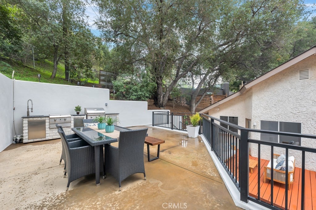 Tucked south of the Blvd on a tree-studded hillside, 4384 Saltillo Street is a two-story 4 bed 3 bath 1,994 sqft retreat designed for easy indoor-outdoor living. The main level features two bedrooms and two bathrooms, including a serene primary suite with treetop views from the front balcony. A bright living room with a vaulted ceiling and brick fireplace connects to a cook’s kitchen with stone counters, a center island, white cabinetry, and stainless-steel appliances. Downstairs offers two additional bedrooms and a full bath, ideal for guests, office, or your own home gym. The multi-level backyard is an entertainer’s dream. The top deck captures tranquil views and is the absolute perfect location for a cup of your favorite morning coffee. The middle patio sets the stage for outdoor dinners and hosts the built-in kitchen with grill, sink, and prep counters. The lower deck is made for lounging beneath mature oaks and features a relaxing jacuzzi, ideal for winding down after a long day. Located moments from incredible hiking trails in the Santa Monica Mountains, The Woodland Hills Country Club, The Village, and all the communities vast amenities this home could not be more perfect!