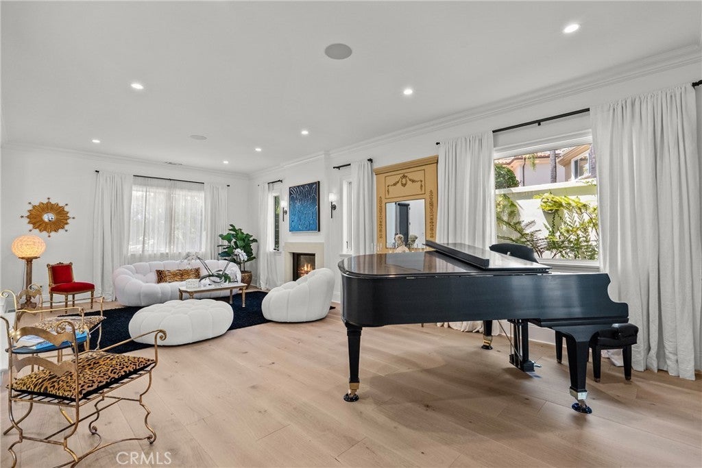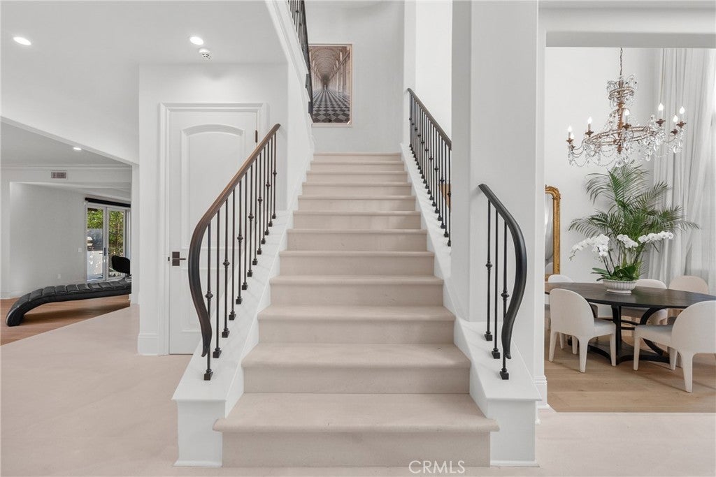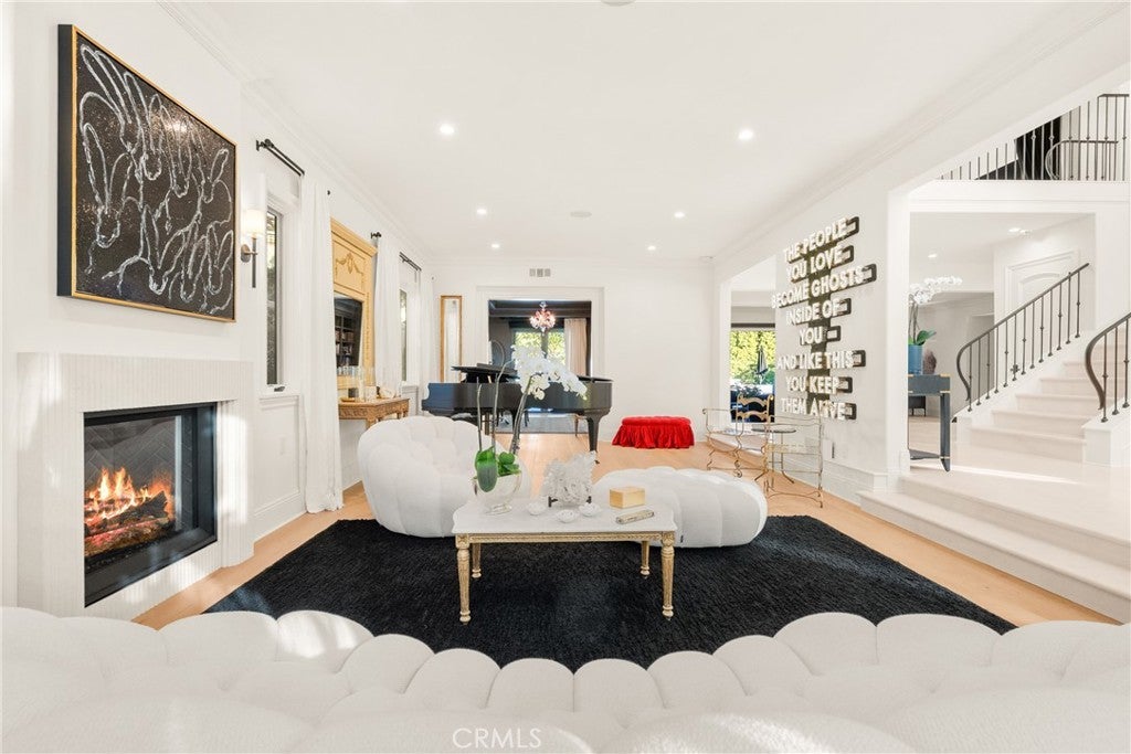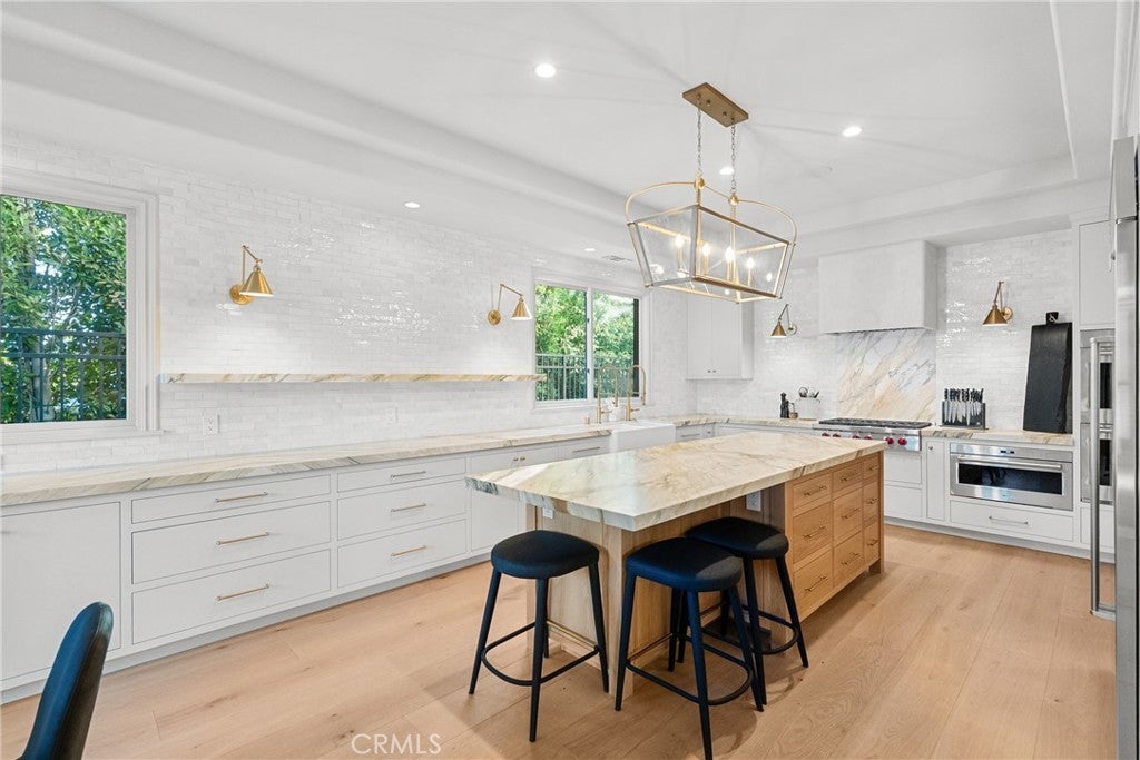 Welcome home to this stylish and elegant home in the guard-gated community of The Ridge in the heart of Calabasas. Situated near the end of a cul-de-sac, this extensively renovated home has been updated to the highest standards - with no expense spared - and is perfectly designed to enjoy indoor-outdoor living at its best. As you enter the two-story foyer, you'll notice the gorgeous large slab limestone floors, an abundance of natural light, and beautifully appointed formal living and dining rooms on either side. Just beyond, the spacious family room with fireplace looks out over the entertainer's backyard and flows into the show-stopping chef’s kitchen, featuring striking Calcutta Borghini marble counters and center island, Wolf appliances, custom solid flat sawn white oak cabinetry, and Zellige tiles. The lower level also includes an office overlooking the backyard, a bedroom with en-suite bath, and a fabulous powder room with a backlit onyx sink. The beautiful limestone extends upstairs, with 10" wide European white oak wood flooring covering the remainder of the residence. Once upstairs, you find a generous loft/family room and a balcony with sweeping views. The private primary suite boasts stunning views, a two-sided fireplace, and a luxurious spa-like bath with a soaking tub, large walk-in shower, and dual custom closets - all crafted with timeless, high-end materials. The refined details extend to the secondary bathrooms, where you'll also find solid white oak cabinets, hand-made and cut terra cotta and marble flooring, Zellige tiles, and premium fixtures. The backyard oasis features a pool and spa framed by beautiful hedges and includes a fire-pit, a bbq area with a pizza oven, a cozy dining area, and lush, sophisticated landscaping - perfect for both relaxing and entertaining. Finally, this home is outfitted with a tankless water heater, premium audio, and a comprehensive video security system.