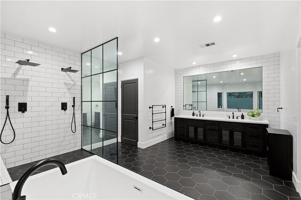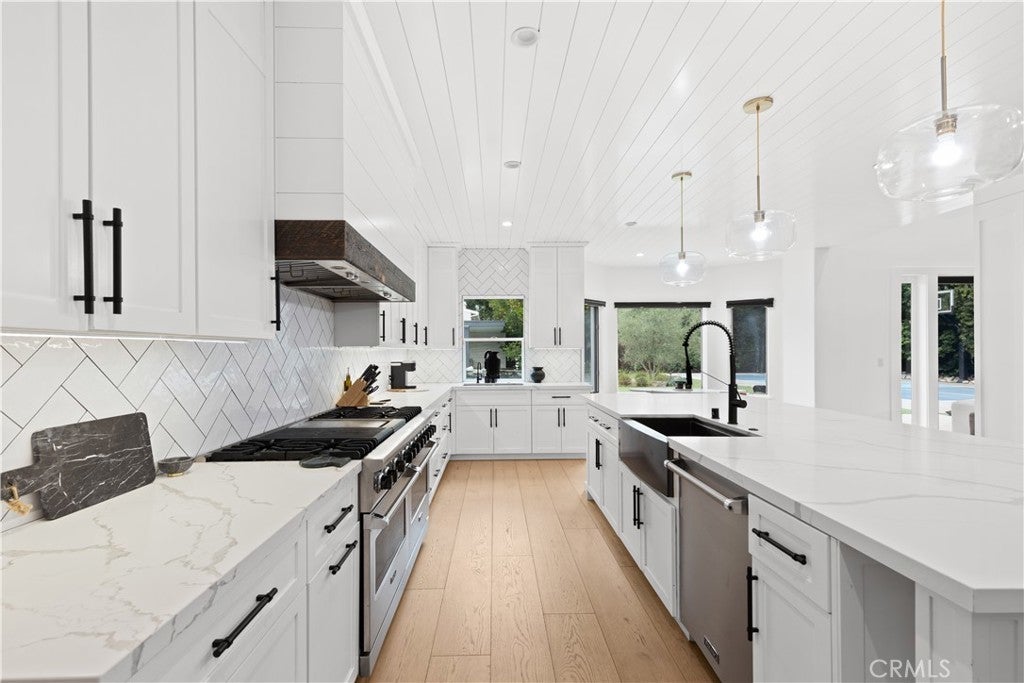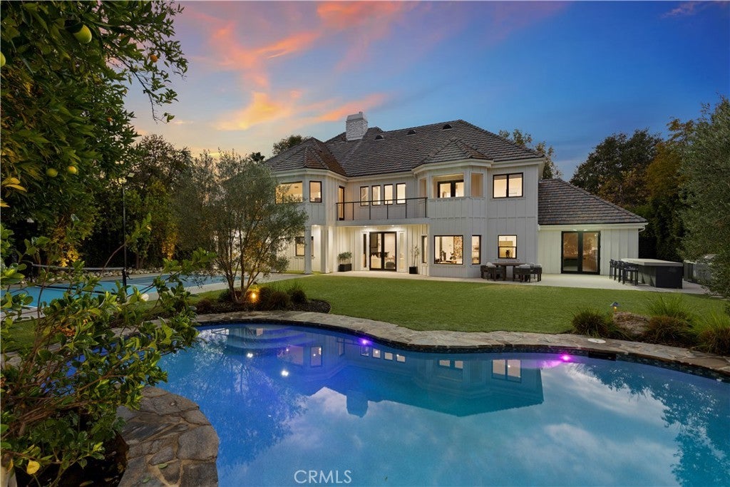 Welcome to this beautifully updated home, set on a sprawling .42 acre dual-gated lot in the highly sought-after Walnut Acres neighborhood of Woodland Hills. An expansive, landscaped front yard and generous setback provide exceptional privacy and a grand approach to the home, enhanced by towering mature hedges and privacy landscaping surrounding the property that create a private, estate-like setting. Double doors open to a grand foyer with soaring double-height ceilings that flow seamlessly into a spacious family room. Anchored by a stunning fireplace, the family room opens to a designer chef’s kitchen featuring top-of-the-line appliances, a massive island with seating and sun-drenched breakfast nook. The main living area also offers an inviting formal living and dining room, perfect for hosting holiday gatherings or intimate dinner parties. French doors open to a private backyard retreat designed for effortless entertaining. Surrounded by lush, mature landscaping, the outdoor space boasts a sparkling pool/spa, poolside cabana with a built-in firepit and outdoor TV, a sports court and outdoor BBQ with bar seating. Spread throughout the home are five generously sized bedrooms along with five full bathrooms, including an expansive primary suite highlighted by a private balcony that overlooks the backyard, dual walk-in closets and a spa-inspired bathroom, complete with a soaking tub, oversized walk-in shower and double vanity. Additional amenities include a large attic for extra storage, three-car garage and private dual-gated circular driveway. This property is conveniently located nearby Westfield Topanga Mall, Topanga Village, Warner Center, Ventura Boulevard and so much more. Lease includes pool and landscaping services, and is available partially or fully furnished.