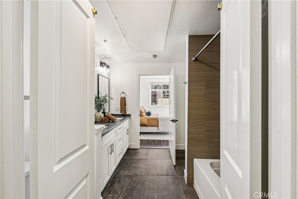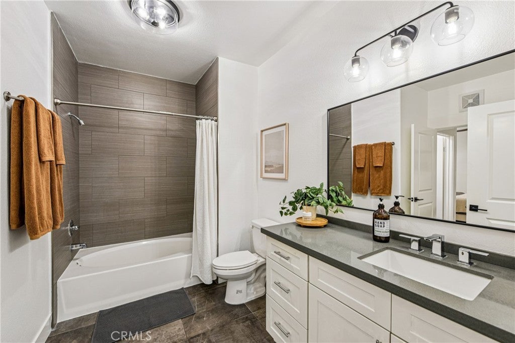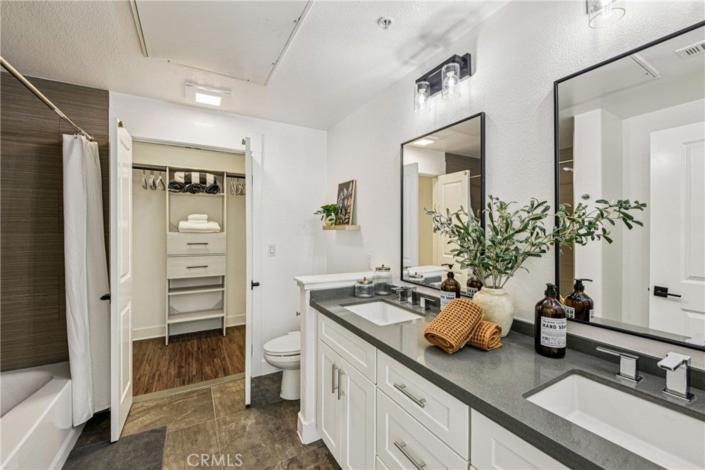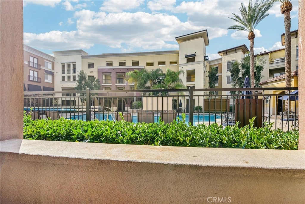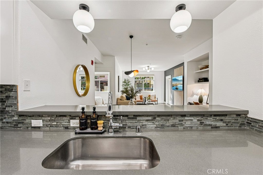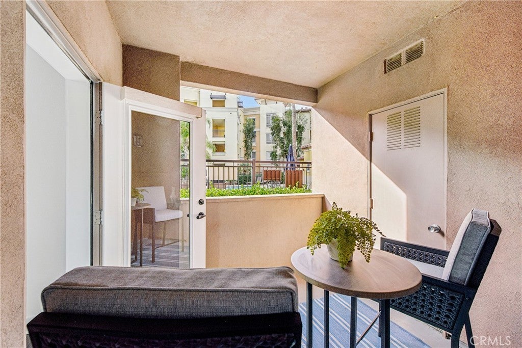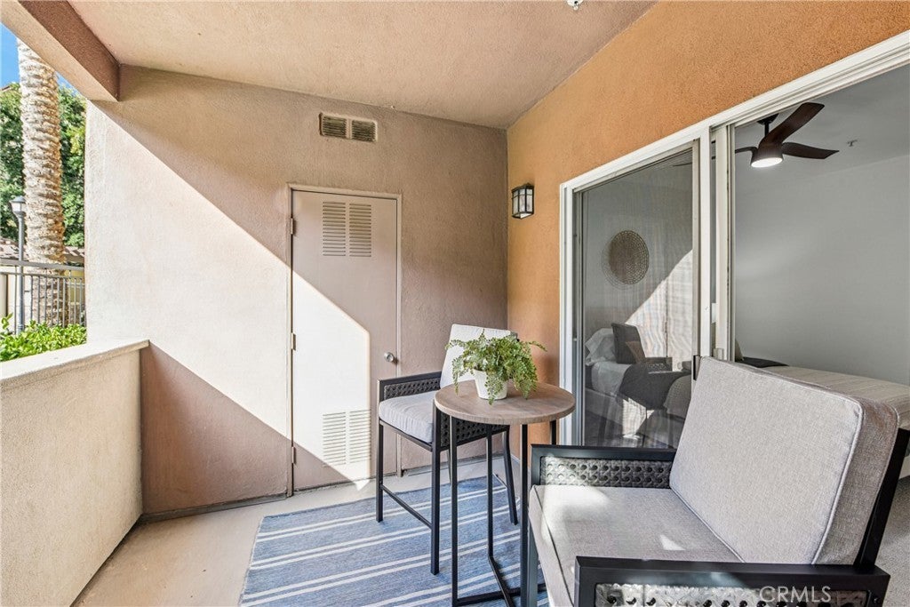 Welcome to this beautifully maintained fully furnished 2-bedroom, 2-bath condo in the highly desirable Madison at Town Center community—just steps from Westfield Valencia Mall. All furniture is included in the sale, making this a truly turnkey opportunity. This stylish first-floor residence offers exceptional convenience with no stairs or elevators and easy access to community amenities. The bright, open-concept layout features a modern kitchen with stainless steel appliances, sleek countertops, and ample cabinetry, ideal for everyday living and entertaining. Luxury plank flooring runs throughout the unit, complemented by new light fixtures and new windows that fill the home with natural light. A built-in desk in the living area provides a perfect home office or study space. The spacious primary suite offers a walk-in closet and a spa-inspired en-suite bath with dual sinks and generous storage. The secondary bedroom includes its own full bath, walk-in closet, and direct access to the private patio—ideal for guests or shared living. A large laundry closet with side-by-side washer and dryer adds everyday convenience. Enjoy the private patio, accessible from both the living room and bedroom—perfect for morning coffee or evening relaxation. Additional features include a newer HVAC system, two reserved parking spaces, and secure gated access. Residents enjoy resort-style amenities including a pool and spa, fitness center, private movie theater, clubhouse, billiards room, outdoor fireplace, BBQ areas, Amazon lockers, and beautifully landscaped paseos. Set in a vibrant, walkable neighborhood close to shopping, dining, nightlife, and bike paths, this turnkey condo offers exceptional value and lifestyle.