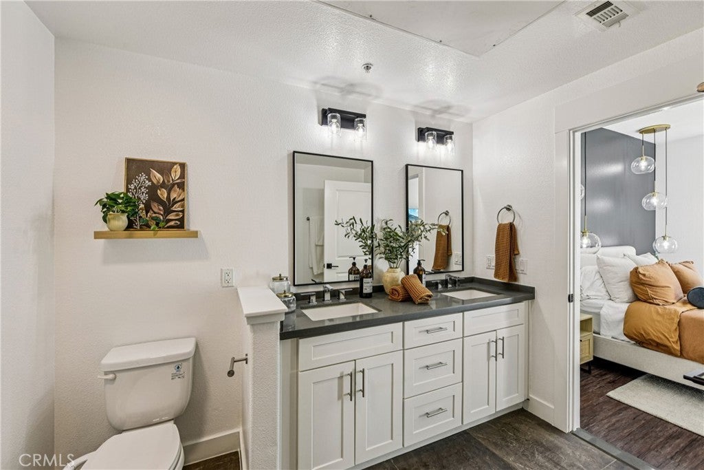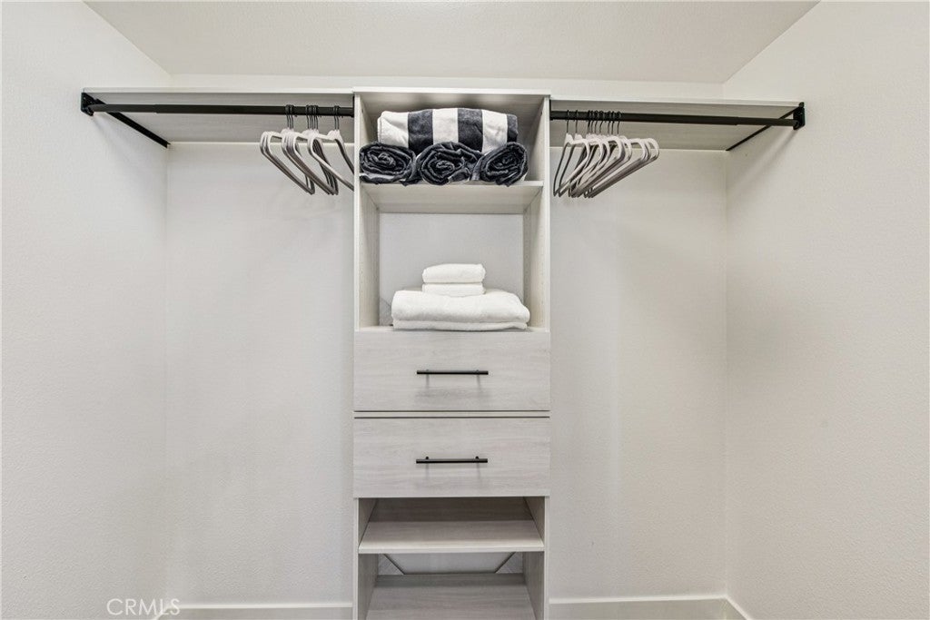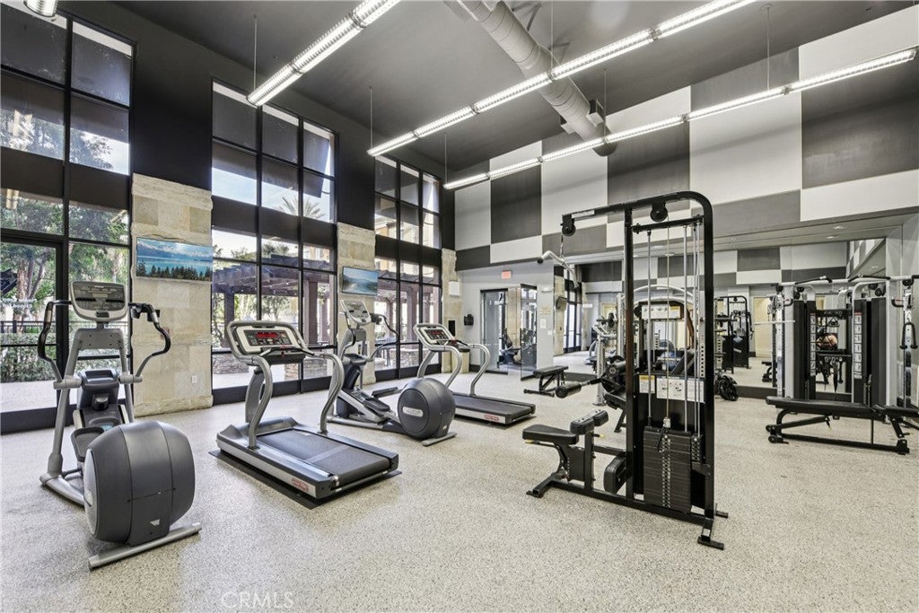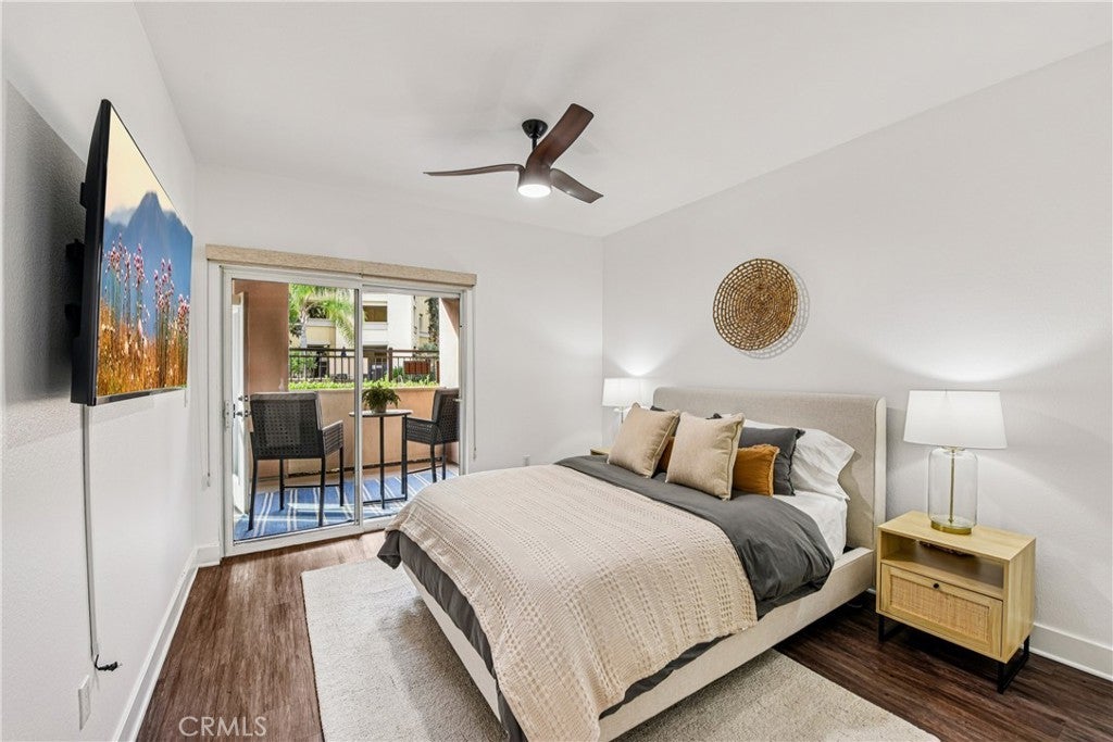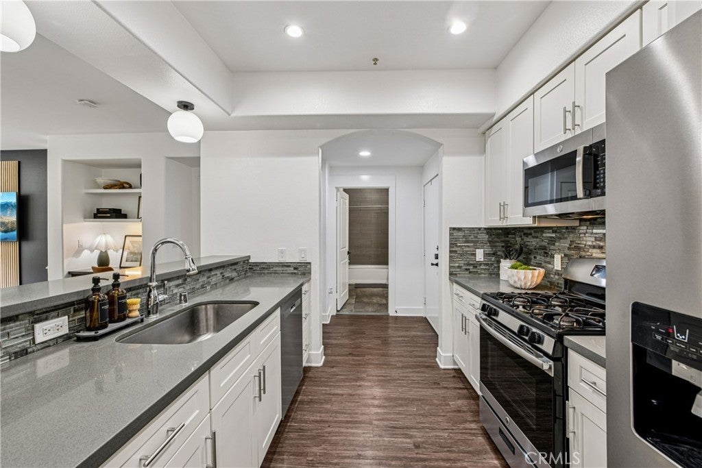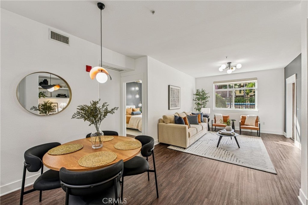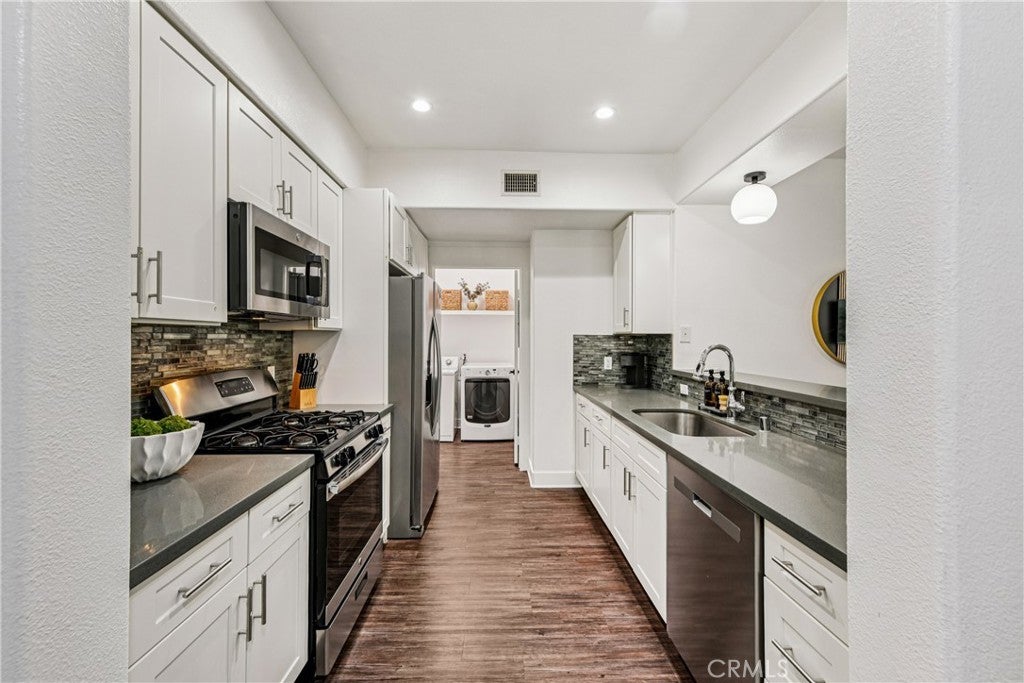 Welcome to this beautifully maintained fully furnished 2-bedroom, 2-bath condo in the highly desirable Madison at Town Center community—just steps from Westfield Valencia Mall. All furniture is included in the sale, making this a truly turnkey opportunity. This stylish first-floor residence offers exceptional convenience with no stairs or elevators and easy access to community amenities. The bright, open-concept layout features a modern kitchen with stainless steel appliances, sleek countertops, and ample cabinetry, ideal for everyday living and entertaining. Luxury plank flooring runs throughout the unit, complemented by new light fixtures and new windows that fill the home with natural light. A built-in desk in the living area provides a perfect home office or study space. The spacious primary suite offers a walk-in closet and a spa-inspired en-suite bath with dual sinks and generous storage. The secondary bedroom includes its own full bath, walk-in closet, and direct access to the private patio—ideal for guests or shared living. A large laundry closet with side-by-side washer and dryer adds everyday convenience. Enjoy the private patio, accessible from both the living room and bedroom—perfect for morning coffee or evening relaxation. Additional features include a newer HVAC system, two reserved parking spaces, and secure gated access. Residents enjoy resort-style amenities including a pool and spa, fitness center, private movie theater, clubhouse, billiards room, outdoor fireplace, BBQ areas, Amazon lockers, and beautifully landscaped paseos. Set in a vibrant, walkable neighborhood close to shopping, dining, nightlife, and bike paths, this turnkey condo offers exceptional value and lifestyle.