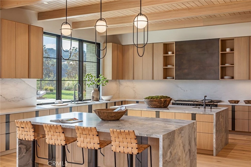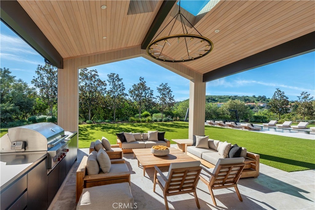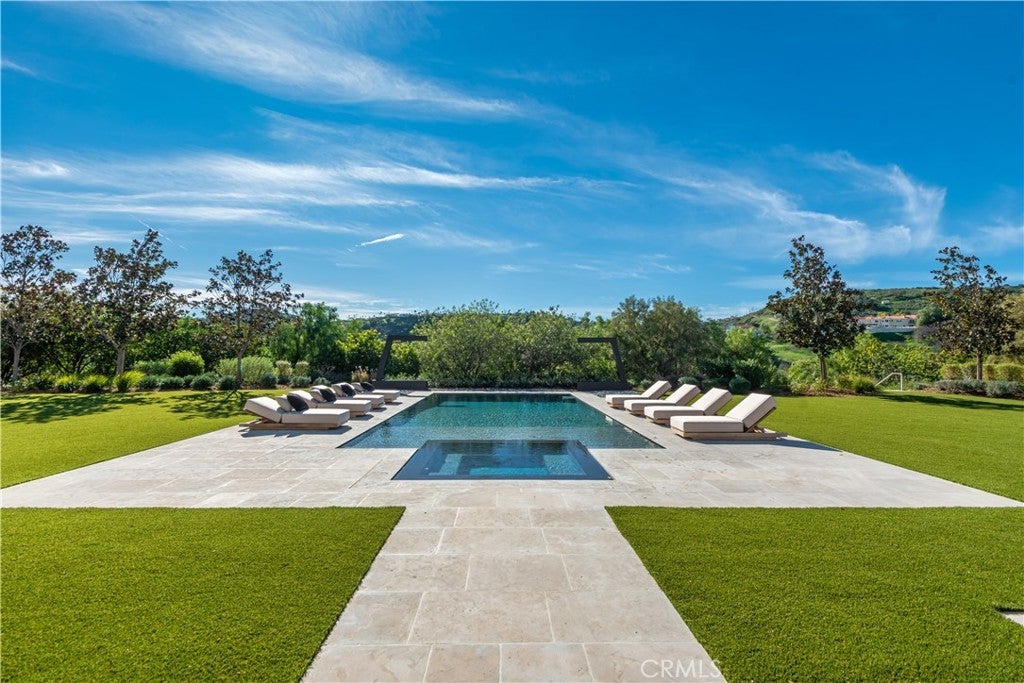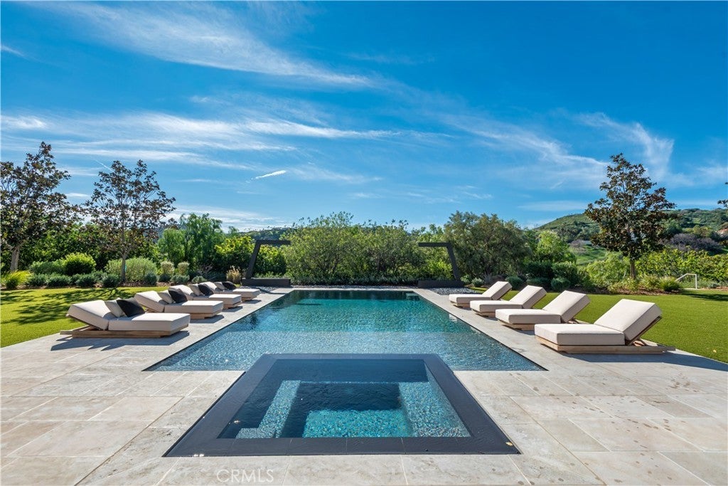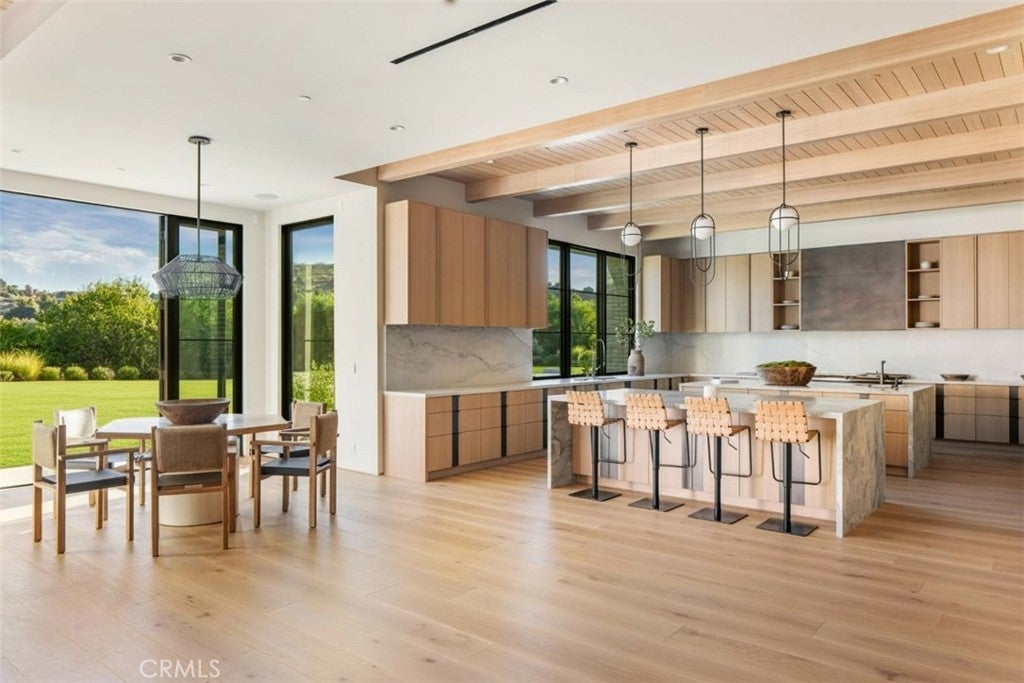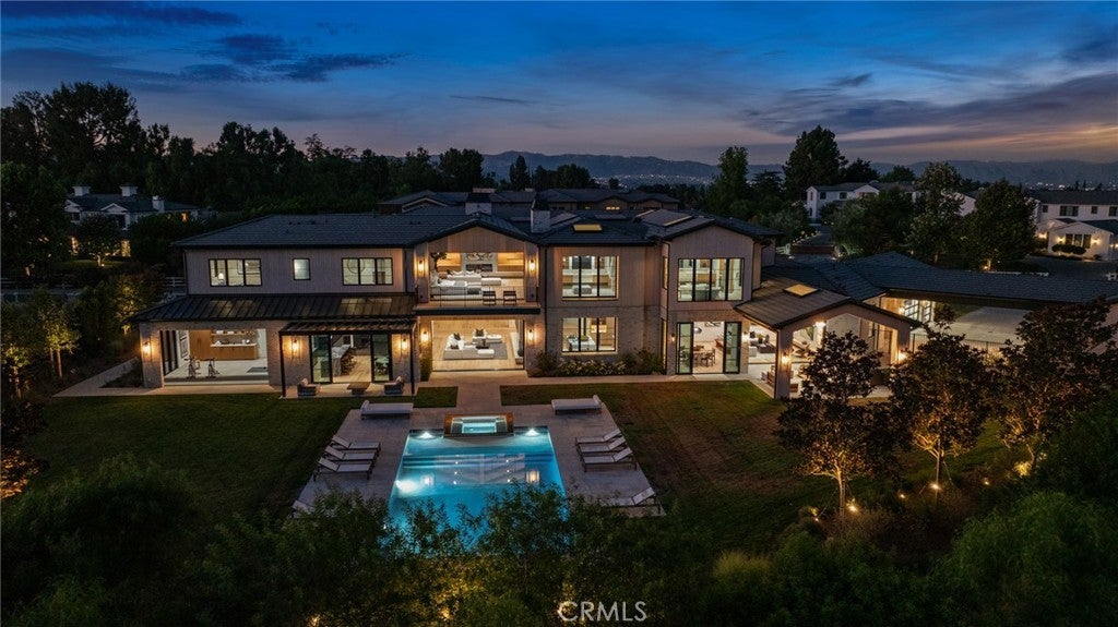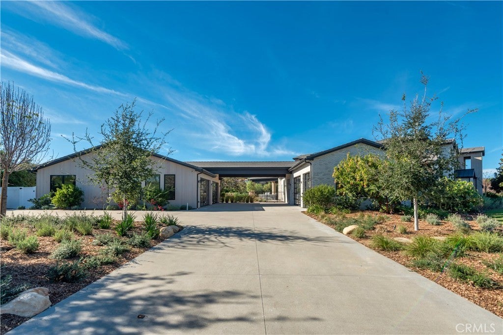 This absolutely gorgeous, new custom estate features beautiful pastoral views, is nestled on a lushly landscaped two acre lot, and is sited at the very end of a scenic cul de sac. The superb open floor plan is flooded with natural light and is highlighted by excellent quality finishes throughout. Amenities include a stellar chef's kitchen (plus a prep kitchen) with four ovens and two islands, one with counter seating, adjoining the sunny breakfast room, all opening to the spacious family room with large stone fireplace and siding walls of glass leading to a large, covered outdoor patio with skylights and full barbecue center. Additional amenities include a gracious formal dining room with glass encased, refrigerated wine wall, beautiful custom office with huge picture windows, a stunning home theater with acoustic paneled sound walls & back-lit coffered ceiling, adjoining entertainers lounge/game room with wet bar, large gym with a motorized opening wall, massage area, and a full bath that includes a steam shower & sauna, plus there is an upstairs bonus room/loft. There are seven generous en suite bedrooms in the main house, four upstairs and two on the main floor. The superb primary suite offers a vaulted, open beam ceiling, full wall windows, white oak floors, a stone fireplace, deluxe dual baths with a shared, oversize walk-in shower, a big soaking tub, room sized, glass fronted custom closets and a big sitting balcony capturing the sunset views. The nicely private grounds include a full guest house, a big sparkling zero edge pool with oversized Baja shelf, a large spa, covered patio, mature trees, and a big private yard with lot's of grass & play areas, plus garages for 7-cars finished with gleaming epoxy floors, plus there is additional off street covered parking. This luxurious home exemplifies the essence of the relaxed, indoor/outdoor California lifestyle.