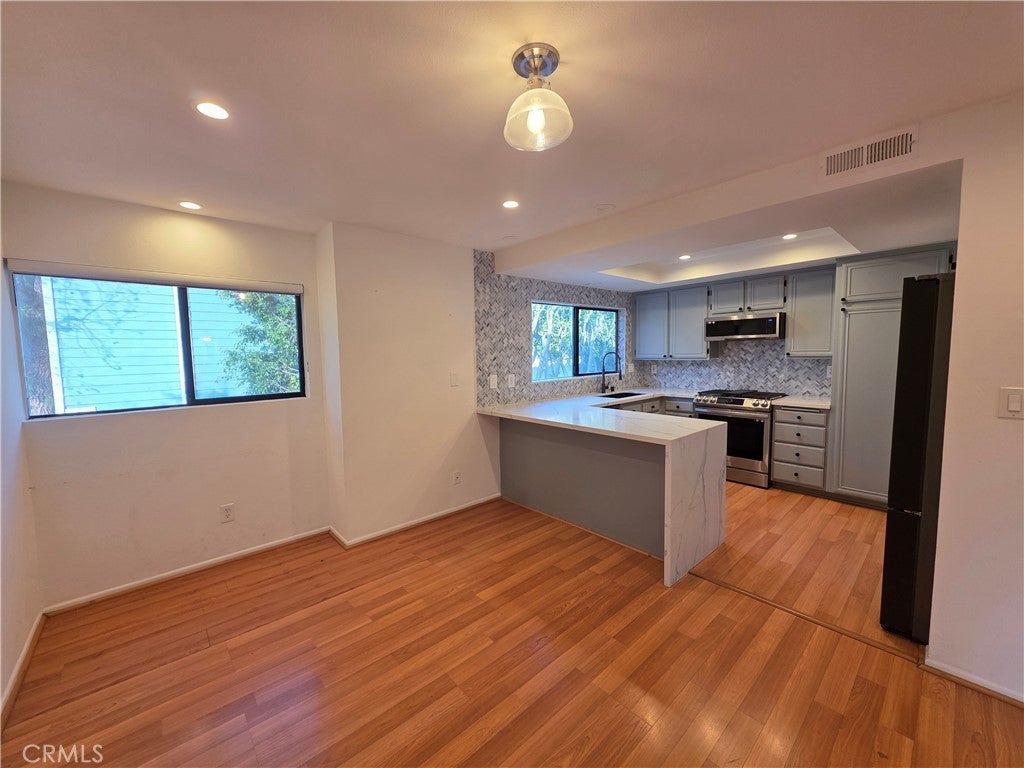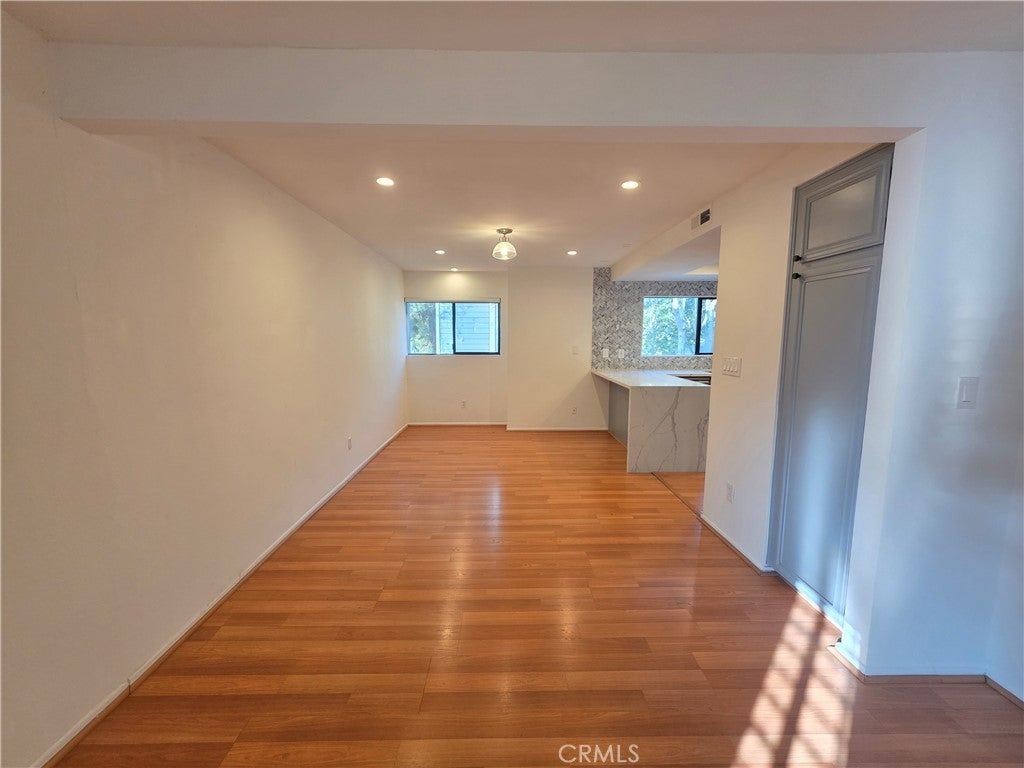 Located in a gated community near Westfield Fashion Square in Sherman Oaks, this private townhouse features a landscaped entry patio and an open interior highlighted by a living room with 14-foot ceilings and large glass windows overlooking treetop views. The floor plan includes a formal dining area, a breakfast room/den, and a remodeled kitchen with ample cabinetry and natural light. A large side-by-side laundry room offers a sink, storage cabinets, and a linen closet. The primary bedroom includes a private balcony overlooking the courtyard, a dual-sink bathroom with Walker Zanger tile shower, and a walk-in closet, while the second bedroom is generously sized and served by a separate full bathroom with tub/shower . Additional features include recessed lighting, window shutters, only one common wall, and an attached two-car garage with direct access. Community amenities include a pool and spa, with close proximity to parks with tennis courts, Trader Joe’s, Westfield Mall, Ralphs, and nearby dining and shopping.