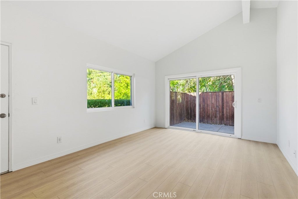 Exceptional single-story end unit in Lake Lindero, offering privacy, views, and a peaceful setting alongside natural trails with greenery and mountain backdrops. This beautifully remodeled 3-bedroom, 2-bath home features no upstairs neighbor, one shared wall, a detached 2-car garage, and a brand-new roof. The interior showcases vaulted ceilings, abundant natural light, new hardwood flooring, fresh paint, and a thoughtfully updated kitchen and baths with quartz countertops and custom tile finishes. The open living and dining areas flow seamlessly to a private patio, ideal for relaxing or enjoying the surrounding views. Set in a well-cared-for community, and conveniently located near shopping, dining, parks, and award-winning Agoura Hills schools. Move-in ready, private, and truly hard to find!