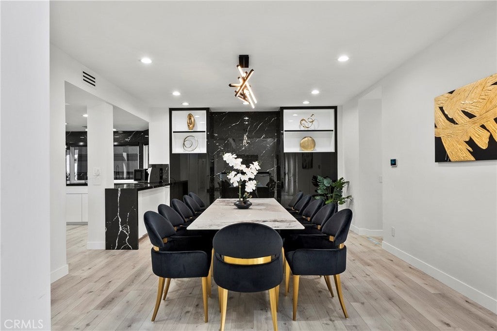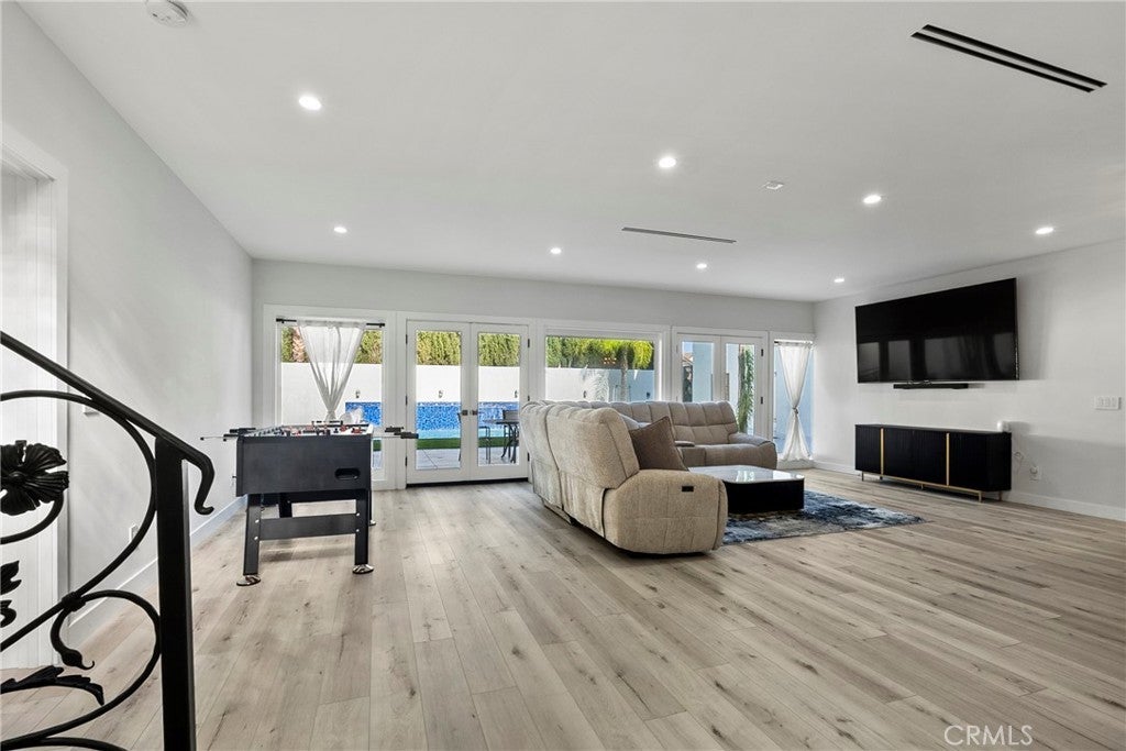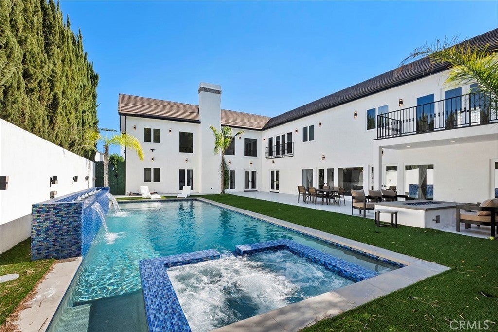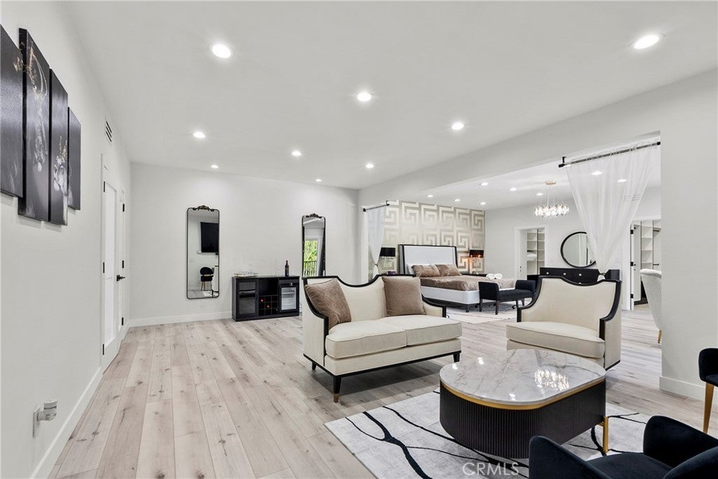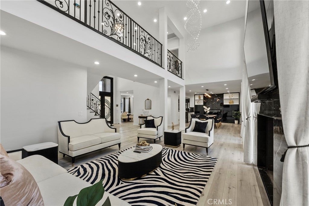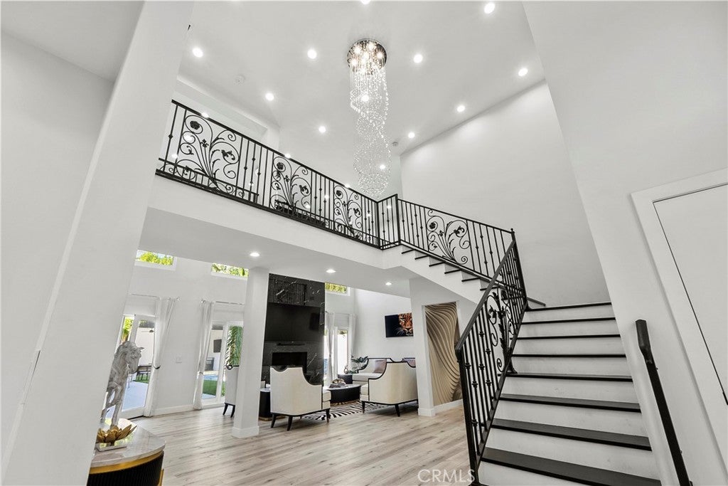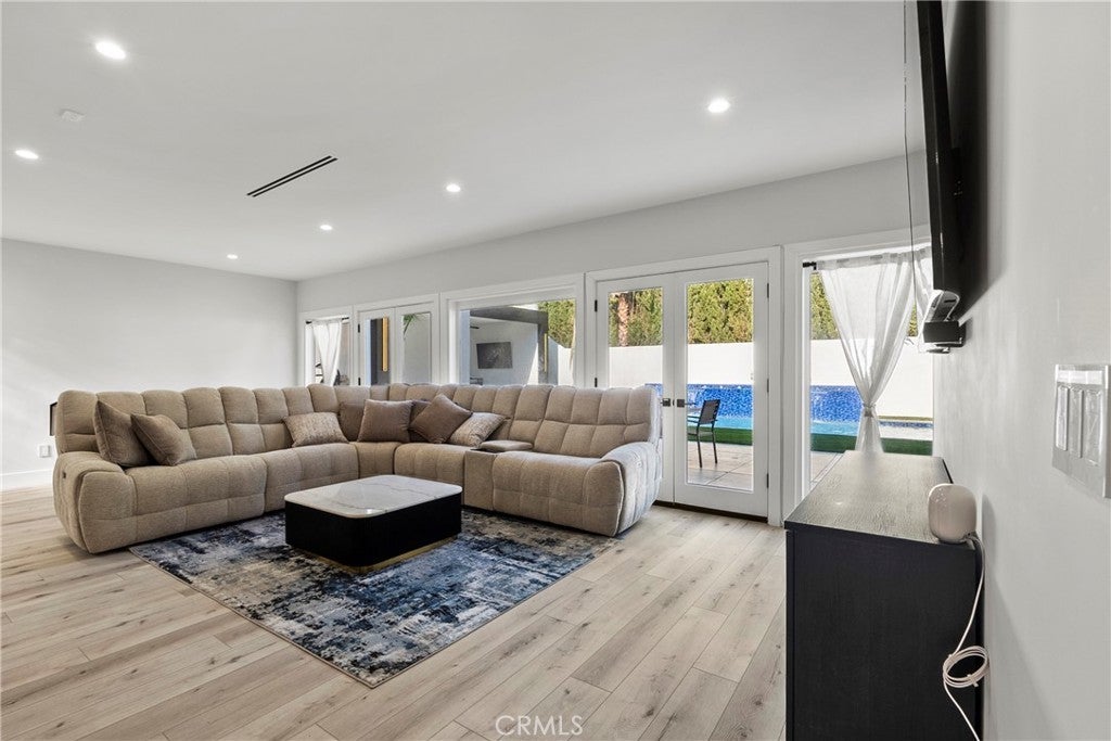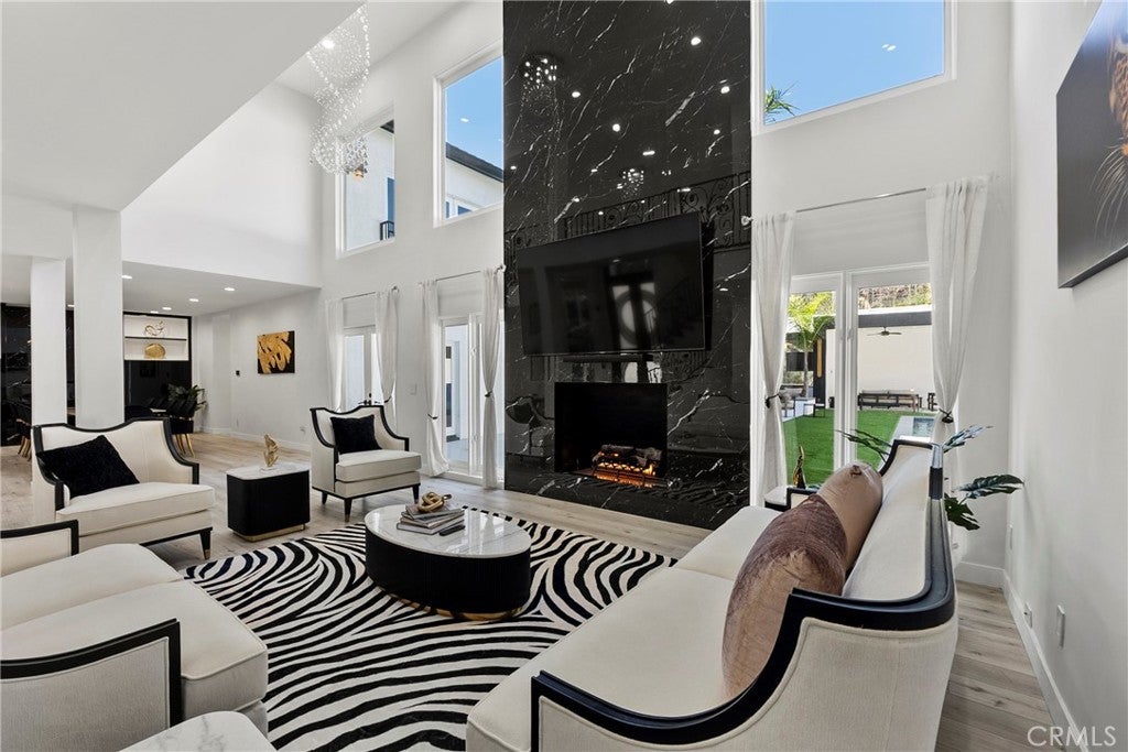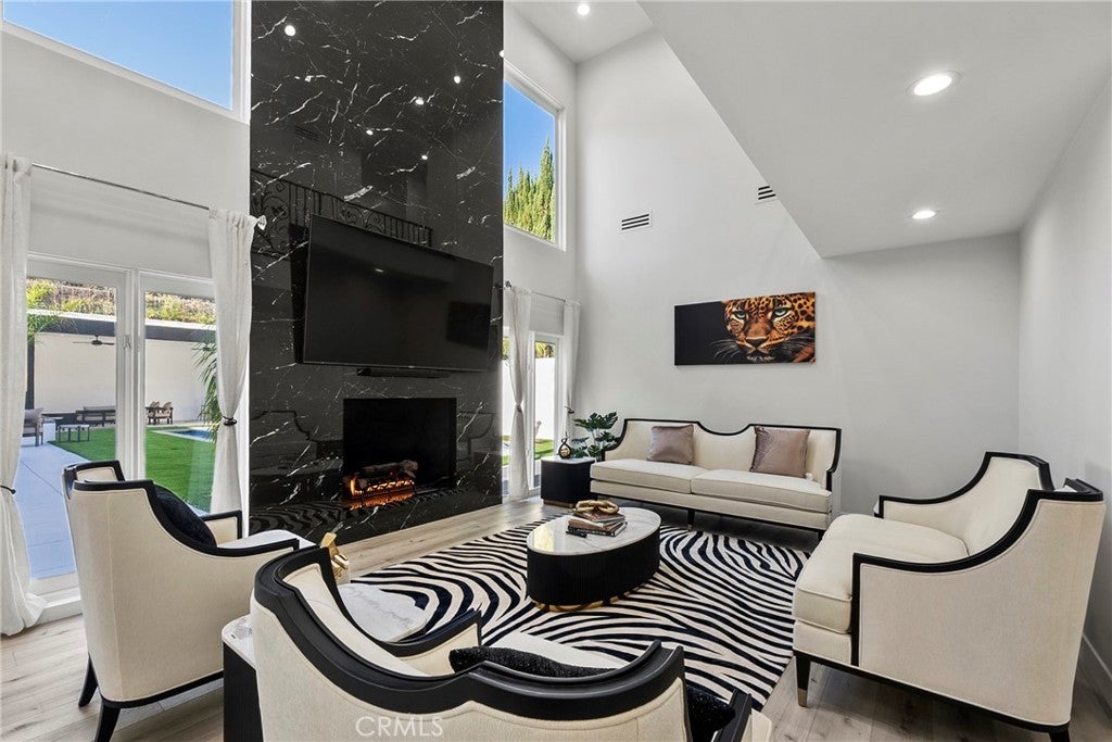 Situated on a sprawling 11,000+ sq. ft. lot in the prestigious Valley Circle Estates neighborhood of Woodland Hills, this fully furnished, tastefully updated home offers the pinnacle of modern luxury living and is appointed throughout with high-end designer furniture. A dramatic double-door entry opens to a grand foyer with soaring double-height ceilings, leading into an expansive open-concept floor plan filled with natural light. The formal living room is anchored by a striking floor-to-ceiling stone fireplace and oversized windows, while the sleek gourmet chef’s kitchen impresses with top-of-the-line appliances, quartz countertops, a waterfall island, and a generous pantry. Adjacent to the kitchen, the formal dining room provides an intimate setting for entertaining, and the inviting family room features an additional fireplace for relaxed everyday living. Designed for hosting, the spacious recreation room includes a built-in wet bar and two sets of French doors that open to a resort-style backyard featuring a sparkling pool and spa with waterfall, sports court, covered patio, built-in firepit, and mature hedges that create a private oasis. Upstairs, four generously sized bedrooms include an expansive primary retreat with a sitting area, four large closets, and a spa-like bathroom with an oversized steam shower, soaking tub, and double vanity, while additional amenities include three main-level bedrooms, a dedicated laundry room, and a three-car garage. Ideally located within a top-rated school district and just minutes from hiking trails, Warner Center, and premier shopping, dining, and entertainment at The Commons, Westfield Topanga Mall, and Topanga Village, this exceptional residence offers comfort, privacy, and refined luxury in one of Woodland Hills’ most sought-after communities.