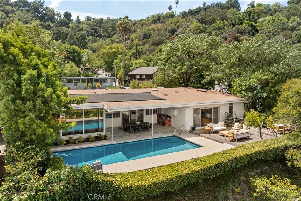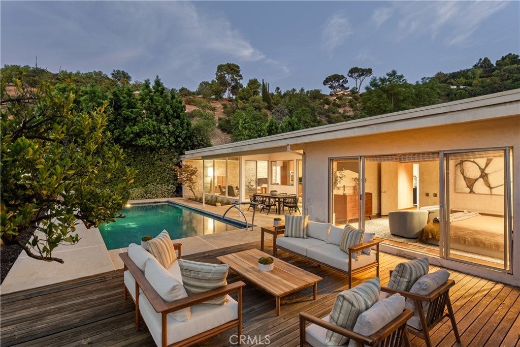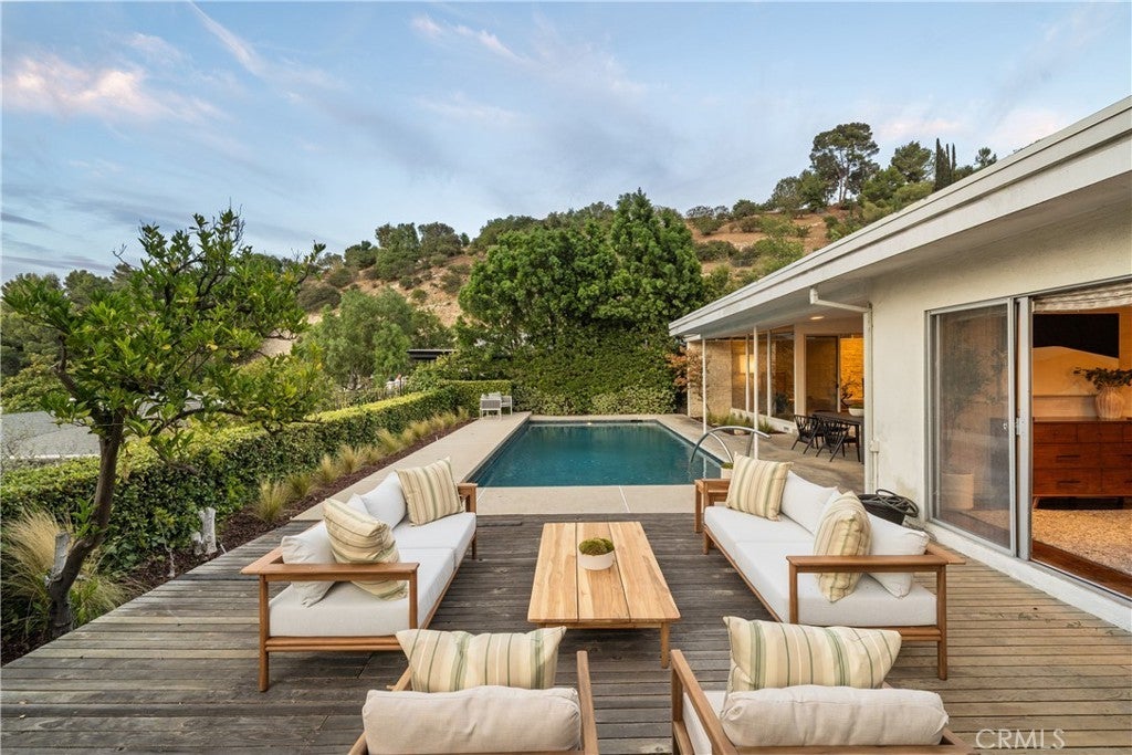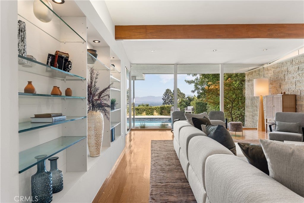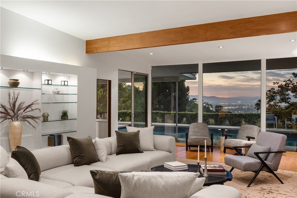 Mid-Century Modern one-story retreat located below Mulholland Drive in a breezy micro-climate with breathtaking mountain and city views. The functionality and beauty of this home is designed for easy living found in Vogue. This rare south of the Boulevard Sherman Oaks gem will delight and entertain you. Featuring 4 bedrooms plus a versatile bonus room, this home balances iconic architectural details with modern comfort. Authentic terrazzo floors welcome you into the vaulted-ceiling foyer, where clerestory windows and skylights fill the interiors with natural light. A dramatic indoor/outdoor limestone wall with a fireplace anchors the family and dining room, while wood-beamed ceilings and full-height walls of glass frame the dazzling vistas. The primary suite offers an adjacent working office, large walk-in closet and poured in place concrete spa-like bath. Three additional bedrooms and a flexible bonus room – ideal for a gym, office or playroom – provide space and privacy for every lifestyle. The kitchen retains its true Mid-Century character with solid wood cabinetry and connects to a second family room overlooking the views. An enviably large laundry room with lots of built-in cabinetry adds functionality and storage. Outside, the sparkling blue glass-tile pool (with a refreshing deep blue hue), an expansive deck and multiple lounging and dining areas create the perfect setting for entertaining or quiet evenings under the twinkling city lights. Tucked near the end of a peaceful cul-de-sac, yet just moments from Ventura Boulevard, this rare Mid-Century Modern gem combines style, function and location. Properties like this rarely become available.