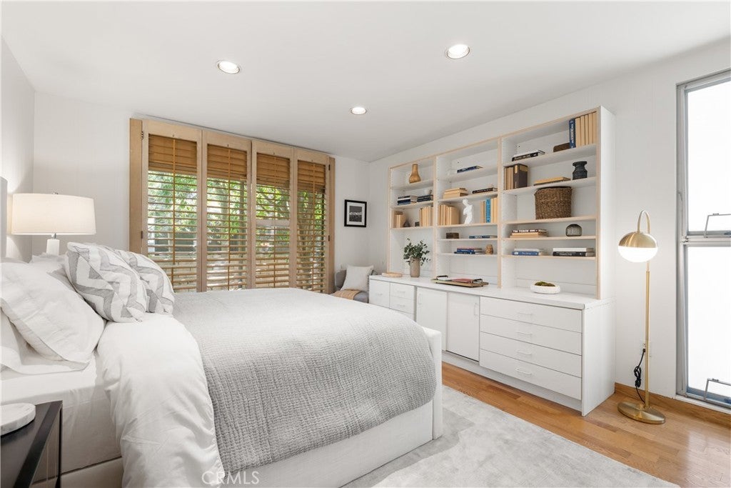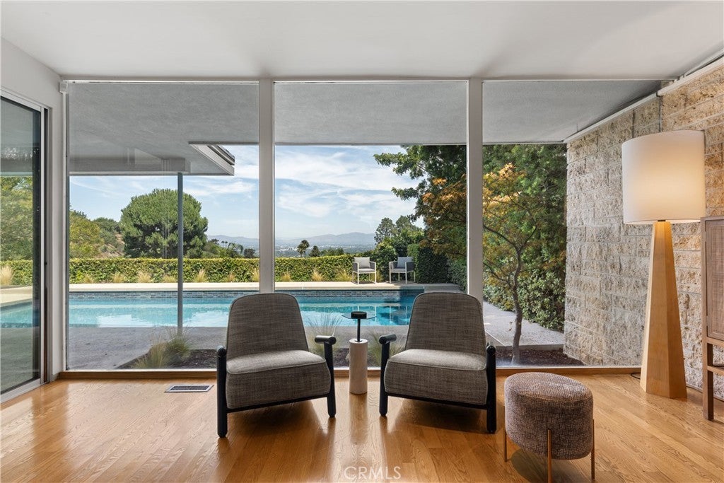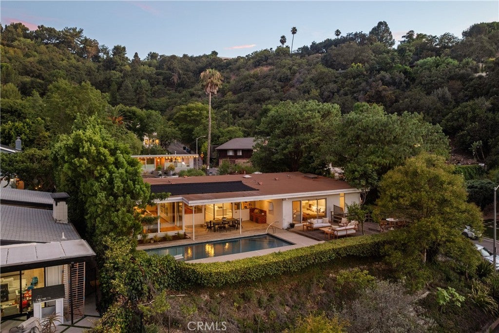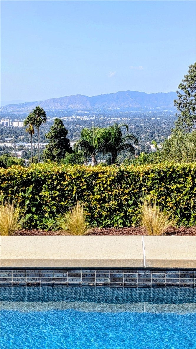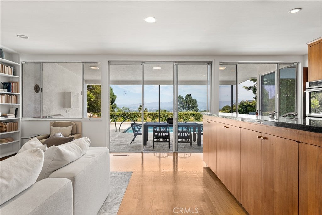 Mid-Century Modern one-story retreat located below Mulholland Drive in a breezy micro-climate with breathtaking mountain and city views. The functionality and beauty of this home is designed for easy living found in Vogue. This rare south of the Boulevard Sherman Oaks gem will delight and entertain you. Featuring 4 bedrooms plus a versatile bonus room, this home balances iconic architectural details with modern comfort. Authentic terrazzo floors welcome you into the vaulted-ceiling foyer, where clerestory windows and skylights fill the interiors with natural light. A dramatic indoor/outdoor limestone wall with a fireplace anchors the family and dining room, while wood-beamed ceilings and full-height walls of glass frame the dazzling vistas. The primary suite offers an adjacent working office, large walk-in closet and poured in place concrete spa-like bath. Three additional bedrooms and a flexible bonus room – ideal for a gym, office or playroom – provide space and privacy for every lifestyle. The kitchen retains its true Mid-Century character with solid wood cabinetry and connects to a second family room overlooking the views. An enviably large laundry room with lots of built-in cabinetry adds functionality and storage. Outside, the sparkling blue glass-tile pool (with a refreshing deep blue hue), an expansive deck and multiple lounging and dining areas create the perfect setting for entertaining or quiet evenings under the twinkling city lights. Tucked near the end of a peaceful cul-de-sac, yet just moments from Ventura Boulevard, this rare Mid-Century Modern gem combines style, function and location. Properties like this rarely become available.