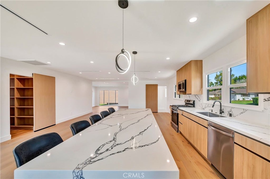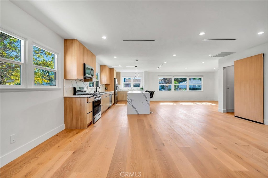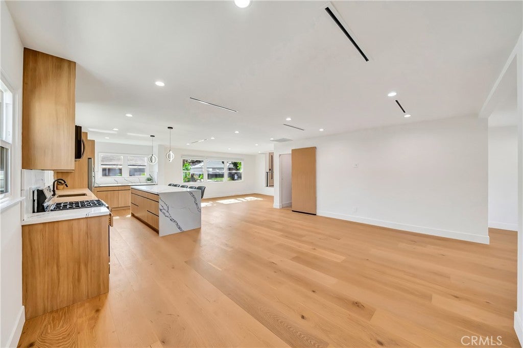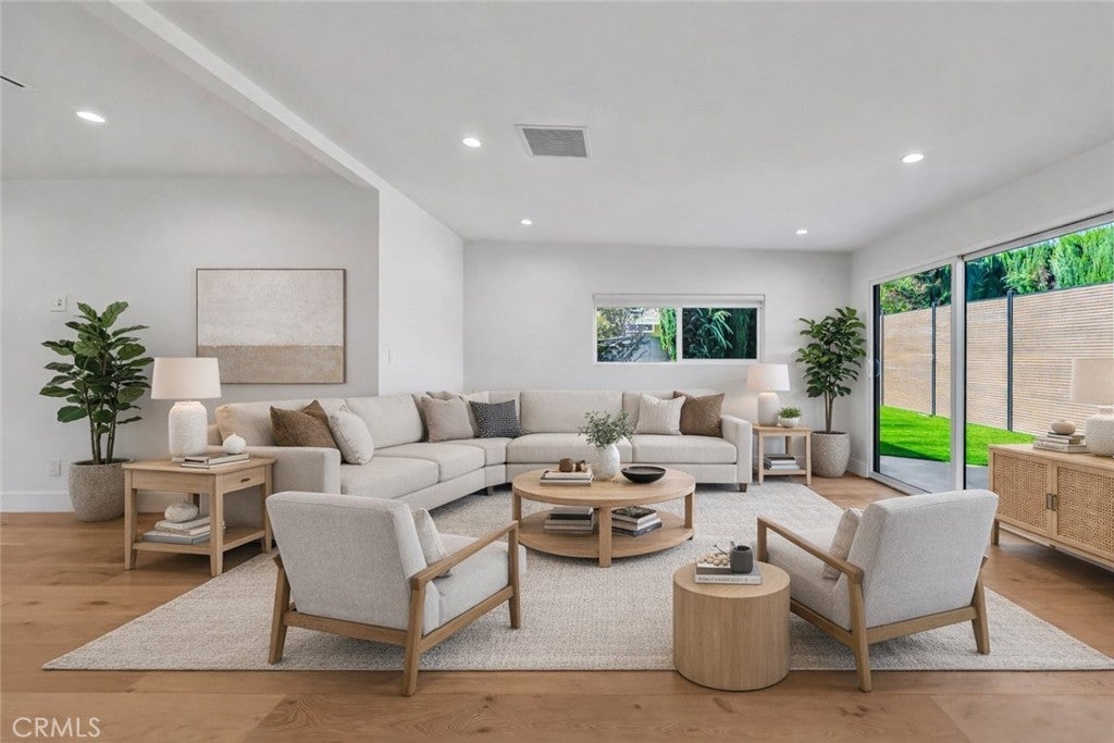 Welcome to this fully remodeled 3-bedroom, 3-bathroom home featuring a bright, open-concept living space designed for modern living and effortless entertaining. Flooded with natural light, the home offers wide-plank wood flooring, recessed lighting, and a seamless flow between living, dining, and kitchen areas. The large chef’s kitchen anchors the open space and includes custom flat-panel wood cabinetry, quartz countertops, stainless steel appliances, a spacious island with seating, and a dedicated pantry. Perfectly positioned, the kitchen opens directly to the main living areas, creating a true great-room feel. This home features three spacious bedrooms, three beautifully updated bathrooms, and a separate washer and dryer room for added convenience. Every detail has been thoughtfully remodeled with modern finishes and quality craftsmanship throughout. Step outside to enjoy a private backyard, ideal for entertaining, relaxing, or creating your own outdoor retreat. Situated on a quiet residential street in Woodland Hills, close to shopping, dining, and freeway access, this turnkey property offers the perfect blend of open space, comfort, and contemporary style. Can be delivered furnished or Unfurnished.