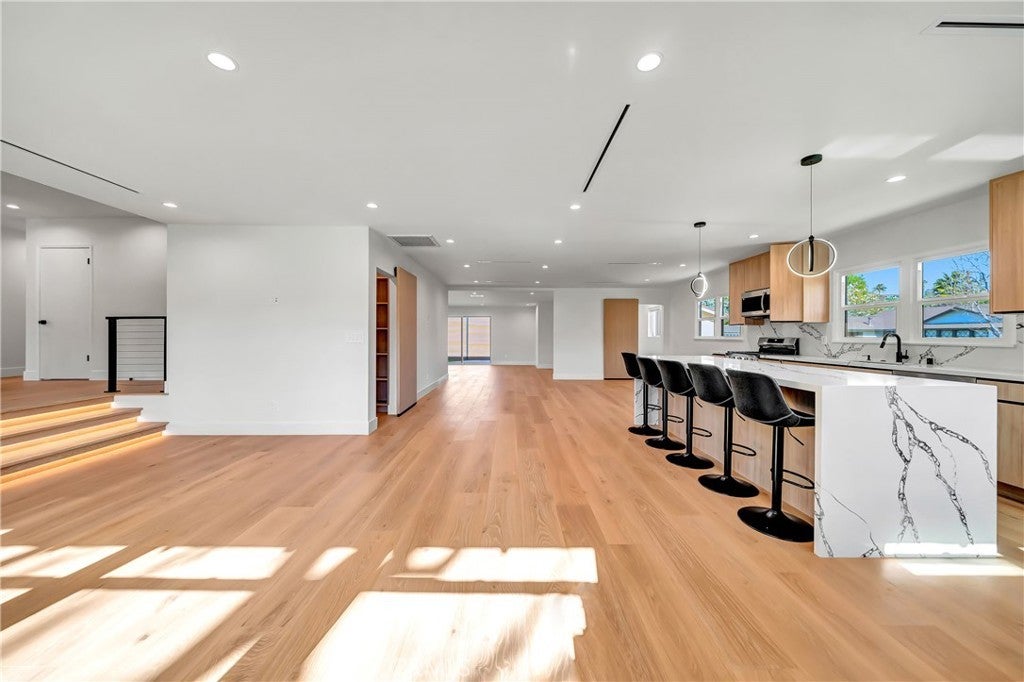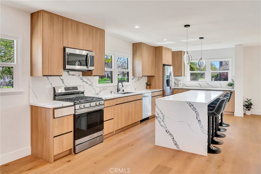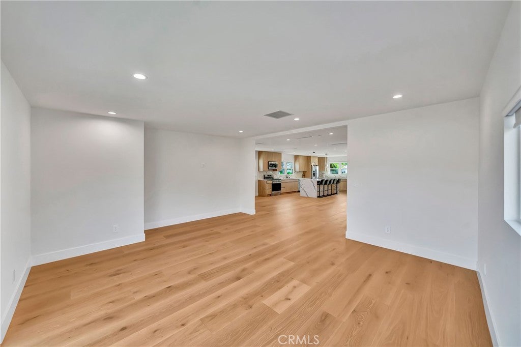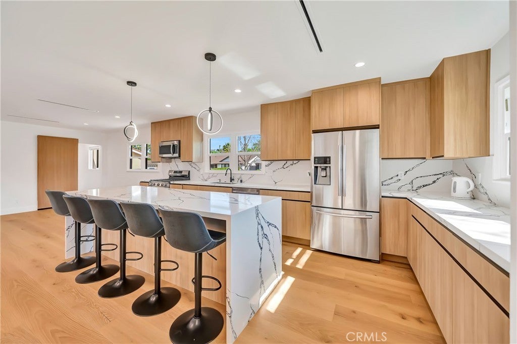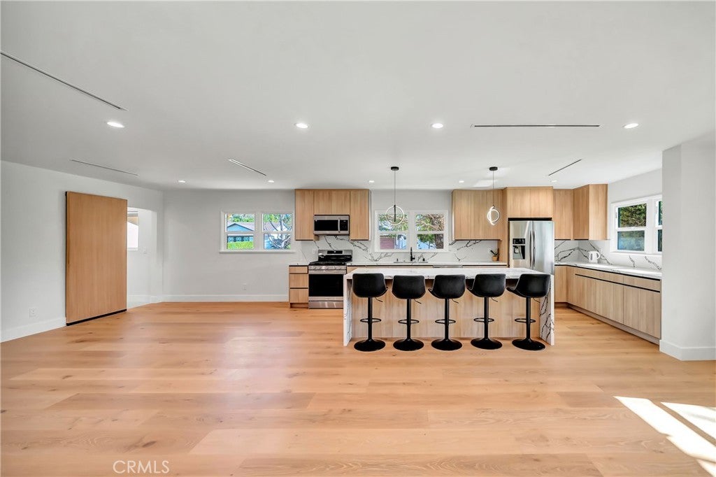Welcome to this fully remodeled 3-bedroom, 3-bathroom home featuring a bright, open-concept living space designed for modern living and effortless entertaining. Flooded with natural light, the home offers wide-plank wood flooring, recessed lighting, and a seamless flow between living, dining, and kitchen areas. The large chef’s kitchen anchors the open space and includes custom flat-panel wood cabinetry, quartz countertops, stainless steel appliances, a spacious island with seating, and a dedicated pantry. Perfectly positioned, the kitchen opens directly to the main living areas, creating a true great-room feel. This home features three spacious bedrooms, three beautifully updated bathrooms, and a separate washer and dryer room for added convenience. Every detail has been thoughtfully remodeled with modern finishes and quality craftsmanship throughout. Step outside to enjoy a private backyard, ideal for entertaining, relaxing, or creating your own outdoor retreat. Situated on a quiet residential street in Woodland Hills, close to shopping, dining, and freeway access, this turnkey property offers the perfect blend of open space, comfort, and contemporary style. Can be delivered furnished or Unfurnished.