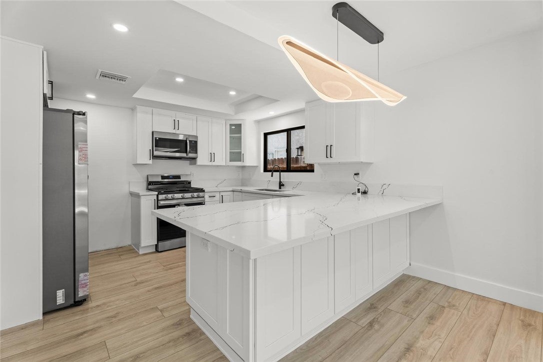 Beautifully remodeled 4-bedroom, 3-bathroom home that was recently renovated from top to bottom! Spacious living and dining areas flow seamlessly into a bright, well-designed kitchen with all-new appliances including fridge, stove, microwave, and washer/dryer. The living room features sliding doors that open to a large, private backyard with a partially covered patio and multiple fruit trees. New dual-pane windows and sliders provide abundant natural light and a quiet interior. One bedroom and full bath are located on the main level. Upstairs features a primary suite with a walk-in closet and dual-vanity bath, plus two additional bedrooms and a full bath. The home has recessed lighting throughout, luxury cabinetry/hardware, and a new energy-efficient central heating and air system. Two driveway parking spaces are included. The Front-facing garage has been converted to an ADU with its own private entrance (ADU is not included in rental). This stunning property is conveniently located in an amazing central location with a short drive to freeway access and nearby CSUN, Pierce College, Northridge Fashion Center Mall, Portos Bakery, and many other great restaurants/shopping/entertainment. Make an appointment to see this one today as it will not last! (The ADU is also available to be included with the main house for an additional cost if more space is desired)