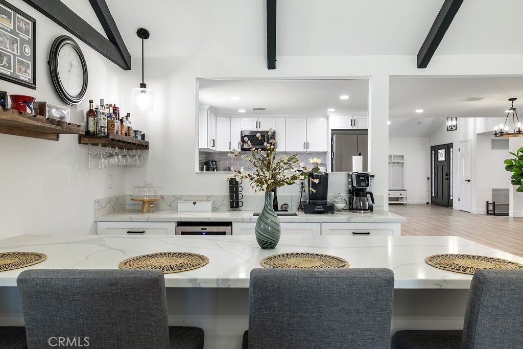 Beamed Ceilings, Built-in Features, Ceiling Fan(s), Cathedral Ceiling(s), Open Floorplan, Quartz Counters, Recessed Lighting, Storage, Bar, All Bedrooms Down, Bedroom on Main Level, Main Level Primary, Wet Bar