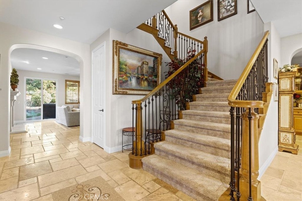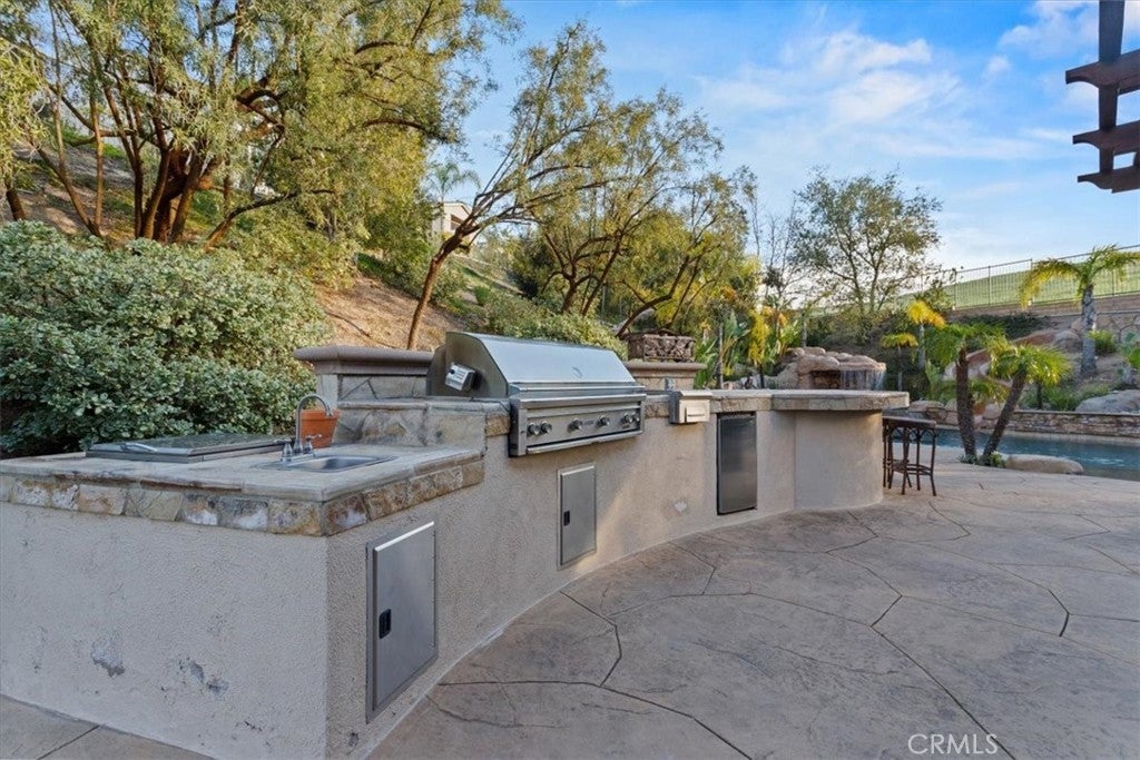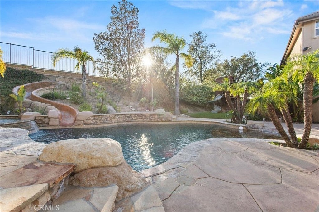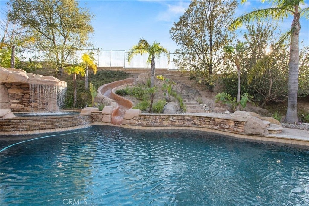 Welcome to Castlewood at Big Sky, one of the area’s most coveted communities—where wide-open spaces, dramatic mountain scenery, and serene natural beauty create a truly special place to call home. Backed by the stunning presence of Whiteface Mountain, this peaceful enclave offers the perfect blend of privacy, luxury, and Southern California indoor-outdoor living. Tucked away at the end of a quiet cul-de-sac and up a long private driveway, located next to open space, this exceptional property showcases breathtaking mountain and valley views, 5 spacious bedrooms, 4.5 baths, and an entertainer’s backyard that rivals a private resort. From the moment you arrive through the gated courtyard entry, you’ll appreciate the thoughtful layout—Inside, an expansive and light-filled floor plan unfolds. The formal living room, anchored by a cozy fireplace, opens to a charming courtyard with a tranquil fountain—setting the tone for relaxed elegance. A warm and inviting family room features its own fireplace, built-in entertainment center, and views of the sparkling pool beyond. Perfect for hosting, the elegant formal dining room flows seamlessly into the sun-drenched gourmet kitchen, complete with granite countertops, abundant cabinetry, a center island with sink, walk-in pantry, and a full suite of stainless steel appliances—truly a chef’s dream. The main level also includes a bedroom with a private bath, a laundry room, and a convenient powder room for guests. Up the grand staircase, the luxurious primary suite awaits—your personal retreat. This expansive haven includes a fireplace, sitting area, oversized walk-in closet with built-ins and pull down attic access with an abundance of storage area, and an additional ~250 sq ft bonus space ideal for an office, nursery, or fitness room. The spa-like primary bath completes the experience. Two additional ensuite bedrooms, a versatile loft, and a bonus room overlooking open space offer endless flexibility for today’s lifestyles. And then… the showstopper backyard. This is Southern California living at its finest: a resort-style pool and spa with rock waterfall grotto, swaying palm trees, BBQ island, lush lawn for play, and even a putting green—all beautifully set against a natural backdrop. Solar-with back-up batteries. There is also ample parking with a 2 car garage and a one-car garage with an attached room ideal for a hobby room or storage. Residents of Big Sky enjoy miles of walking and hiking trails.