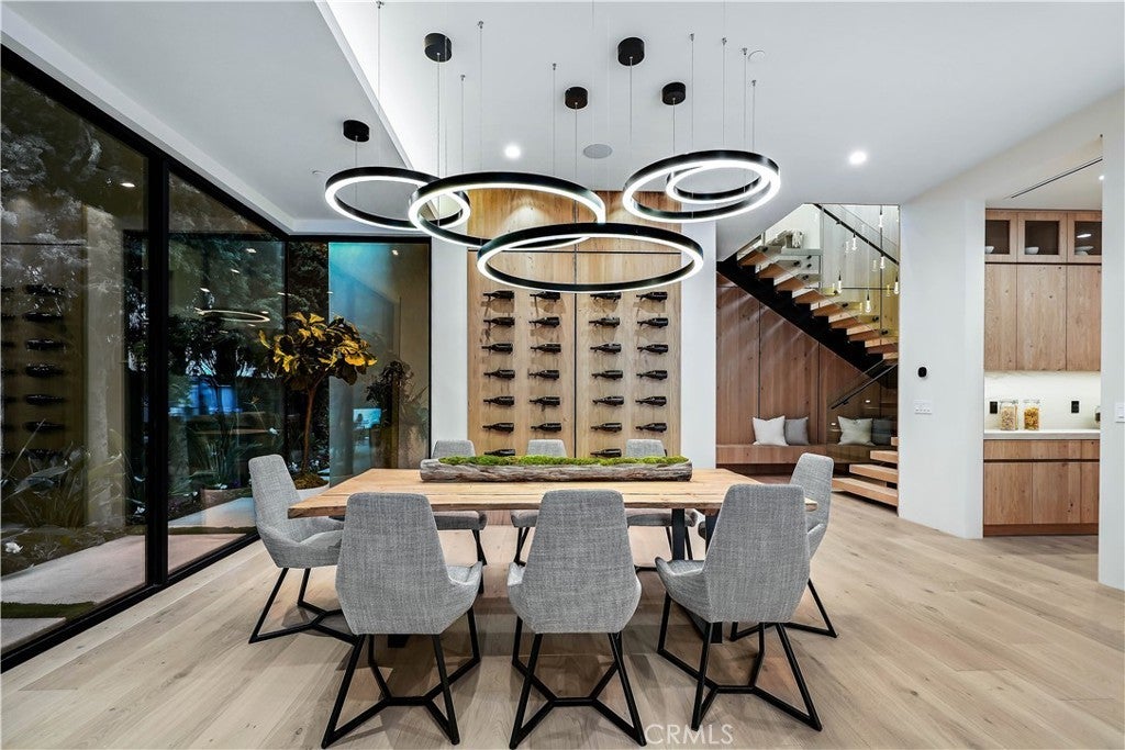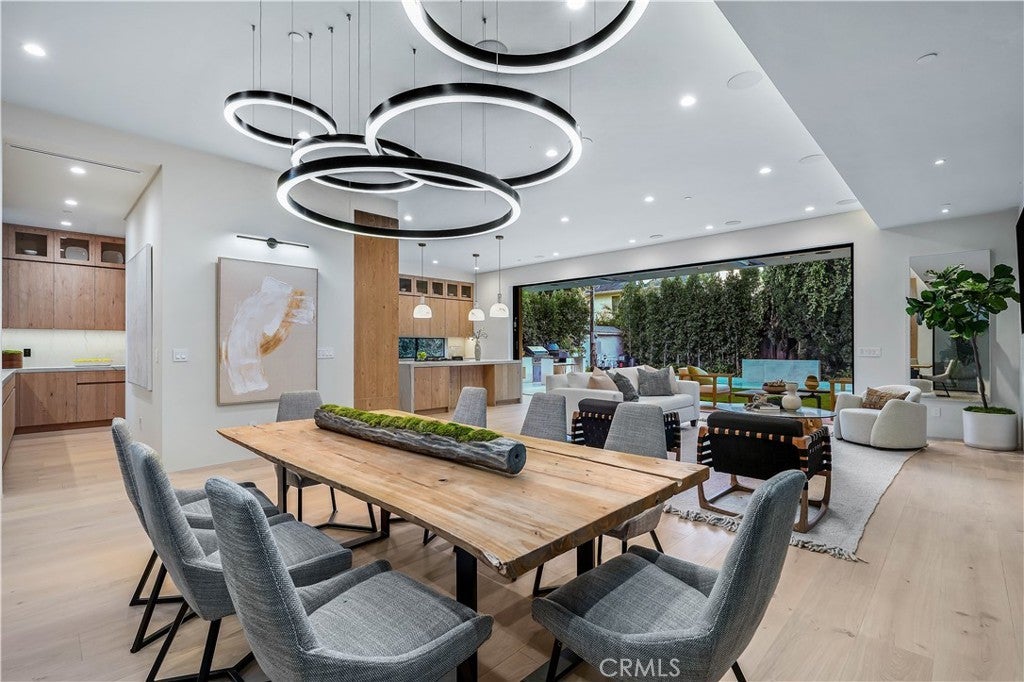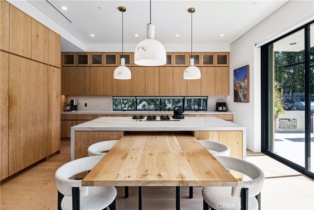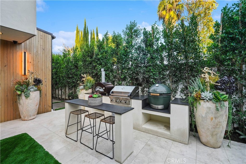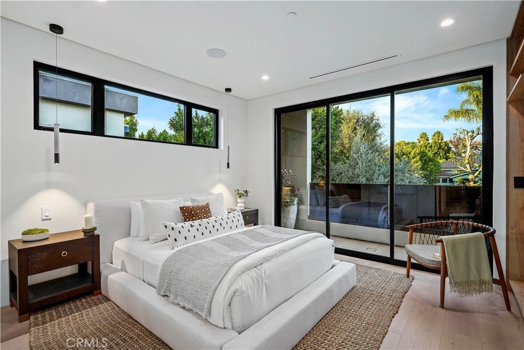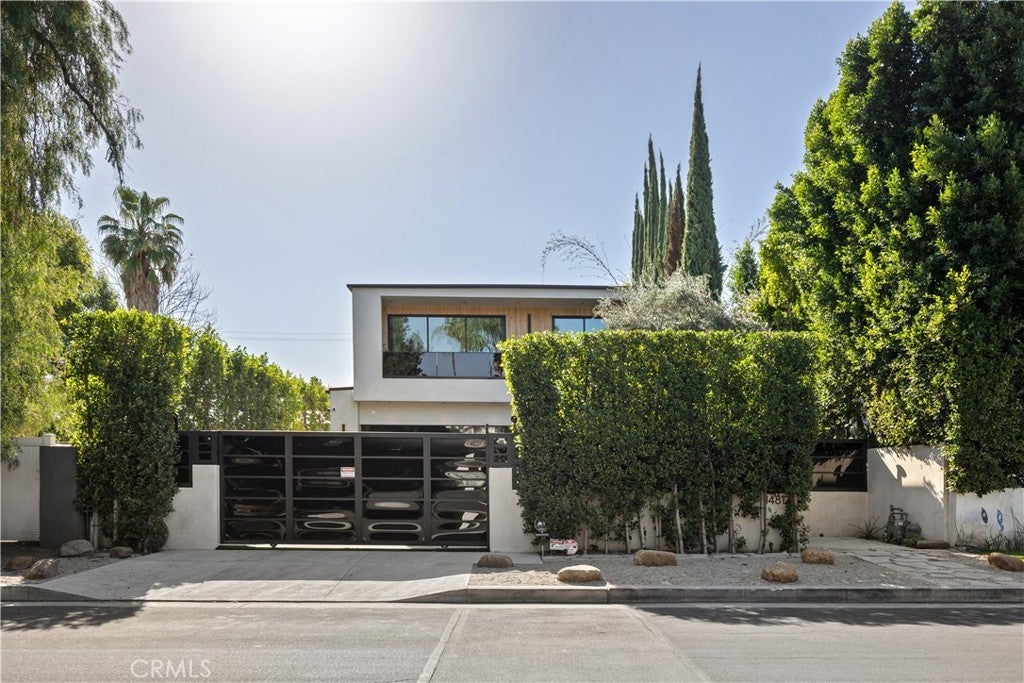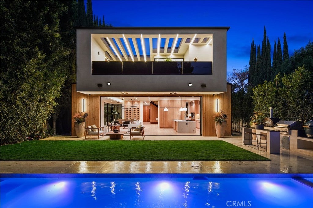 Tucked away on a quiet, tree-lined street in the heart of Sherman Oaks, this privately gated newer construction estate redefines the standard for modern luxury. The open-concept floor plan is highlighted by lofty ceilings and expansive walls of glass that flood the space with warm natural light. At the heart of the home lies a designer chef’s kitchen equipped with top-of-the-line Miele appliances, a massive waterfall island, butler’s pantry and separate walk-in pantry. The adjoining formal dining room boasts bespoke wine storage, while the spacious living room’s oversized sliding glass door seamlessly extends your living space outside and is outfitted with a custom-built screen to keep unwanted pests and debris out. Designed for the ultimate entertainer, the tranquil backyard retreat is enveloped by lush hedges for unparalleled privacy. Whether you’re hosting at the outdoor BBQ kitchen, complete with a pizza oven and smoker, or unwinding in the sparkling pool/spa, the space feels like a boutique resort. The journey continues inside, where the main level is rounded out by an ensuite bedroom, chic powder room and two-car garage with direct access. Ascend the dramatic floating staircase, where you’ll find three generously sized ensuite bedrooms and a dedicated laundry room. The primary retreat features a spacious private patio, large walk-in closet and sumptuous bathroom, outfitted with a deep soaking tub, oversized rainfall shower and double vanity. Additional amenities include a smart home system with built-in speakers, state-of-the art security system and custom Lutron motorized shades throughout. Ideally located within the top-rated Kester Avenue Elementary school district and just minutes from Ventura Boulevard’s premier shops and restaurants.