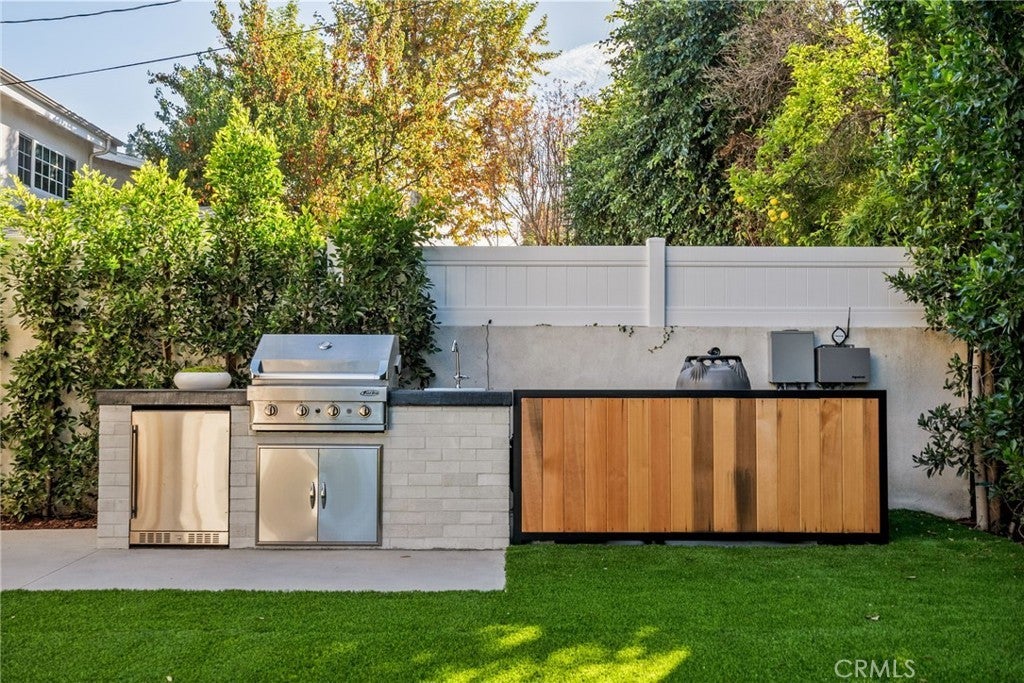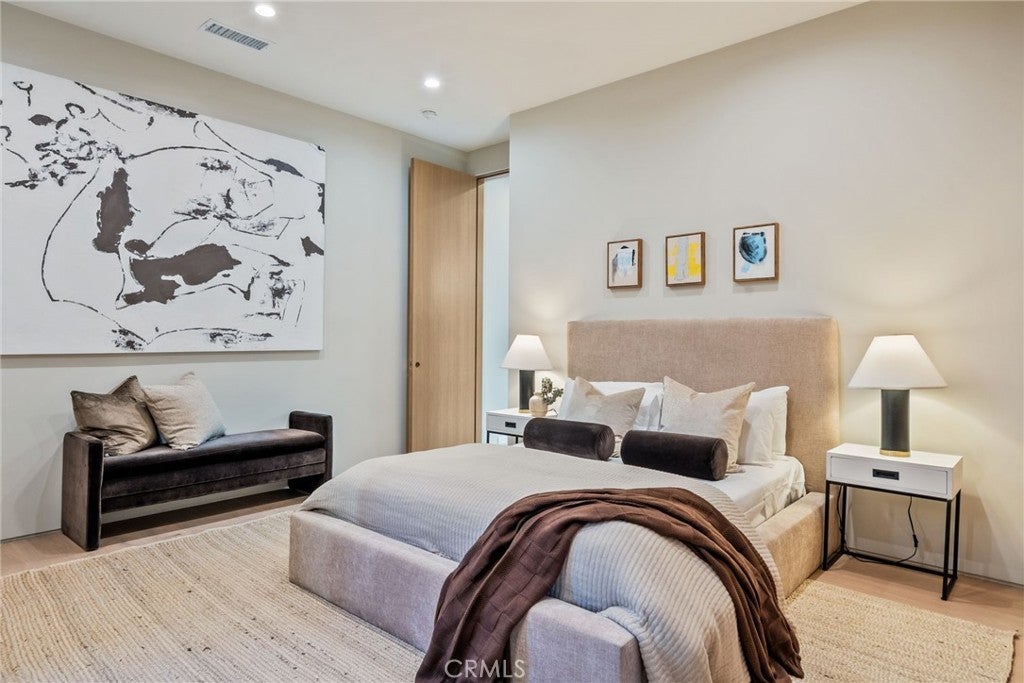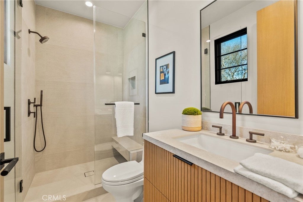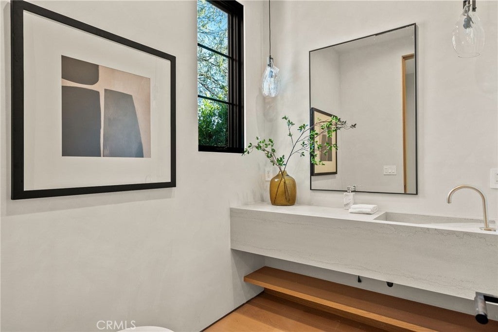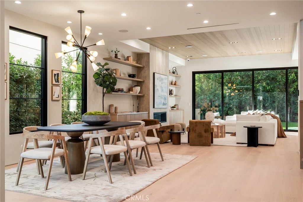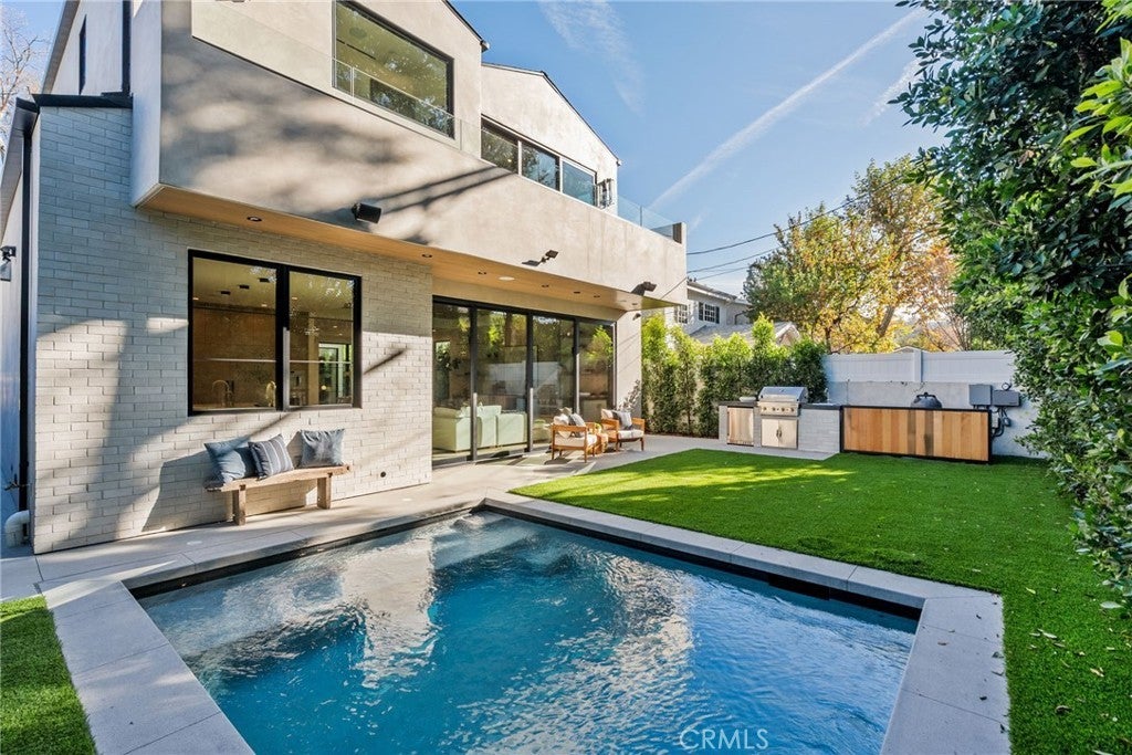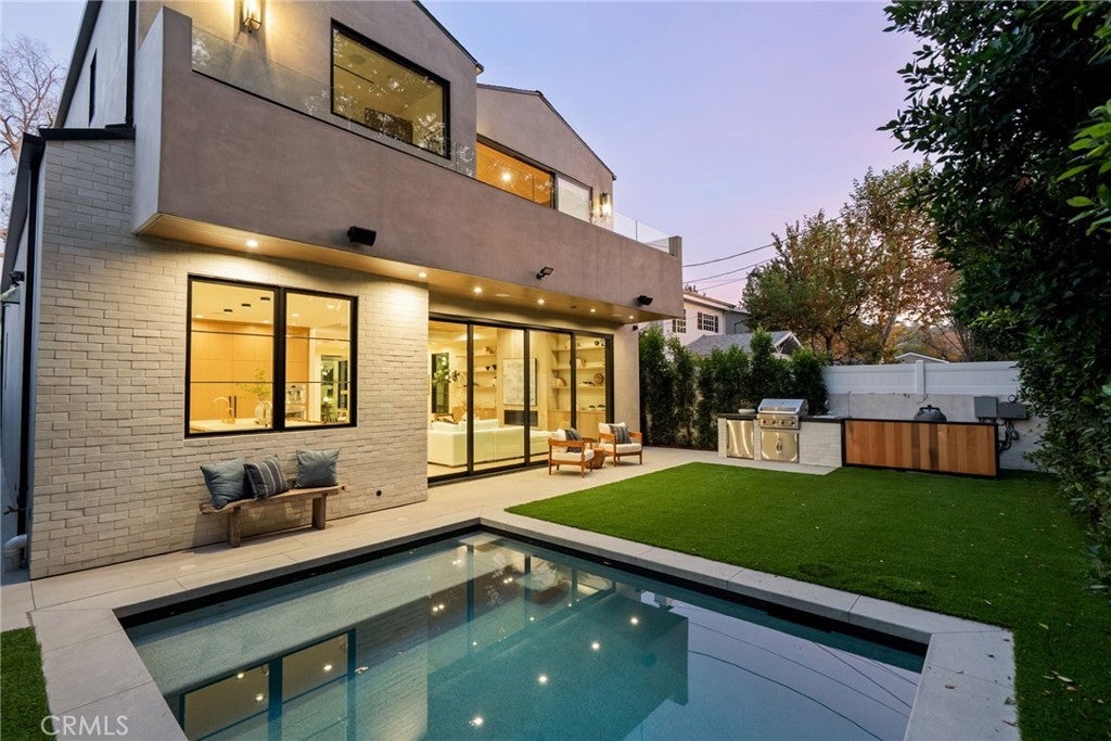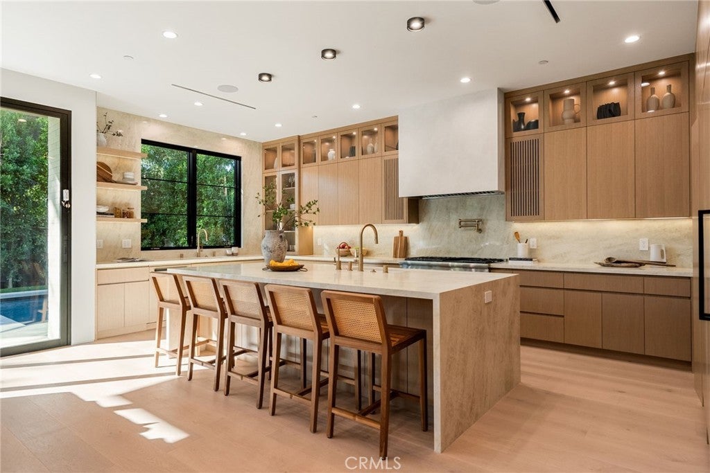 Situated on a quiet, tree-lined street in the desirable Beeman Park neighborhood of Studio City, this stunning modern residence blends luxury, functionality, and effortless indoor-outdoor living. Offering 5 bedrooms and 4.5 bathrooms, the home features an oversized guest bedroom on the main level, while four spacious en-suite bedrooms are located upstairs, including a serene primary suite with a private balcony. Designed for both everyday comfort and upscale entertaining, the open-concept floor plan showcases European oak floors, a dramatic floor-to-ceiling stone fireplace, and extensive custom wood paneling, built-ins, and cabinetry throughout. A dedicated office adds flexibility for today’s lifestyle. The gourmet kitchen is a true showpiece, featuring Taj Mahal stone, a custom lime-washed stove hood, Thermador appliances, two sinks, two dishwashers, a walk-in pantry, wine fridge, and thoughtful modern finishes. Ferguson lighting accents the home with warmth and sophistication. The primary suite is a private retreat with a beverage center, spa-inspired bath with lime-washed finishes, and his-and-hers closets. Additional highlights include a Control4 smart home system, integrated speakers, security cameras, and a sleek flush garage door. Outdoors, enjoy a peaceful courtyard, pool, and seamless indoor-outdoor living complete with an outdoor Turbo grill, sink, and refrigerator—perfect for entertaining or relaxing in total privacy. Ideally located within the sought-after Dixie Canyon School District, and just moments from Beeman Park, the Shops at Sportsmen’s Lodge, and some of Studio City’s most popular restaurants and amenities, this exceptional home offers modern luxury in a prime location.