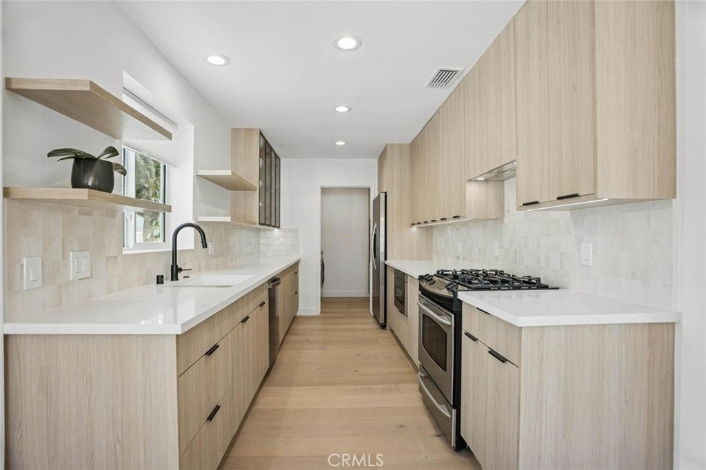 Tucked away on a quiet street in one of Sherman Oaks' most desirable pockets, this completely renovated 3-bedroom, 2-bath residence blends refined design with effortless indoor-outdoor living. The home showcases a stunning open-concept floor plan flooded with natural light, highlighting high-end finishes and thoughtfully curated details throughout. At the heart of the home, expansive living and dining spaces flow seamlessly, creating an inviting atmosphere ideal for both everyday living and entertaining. The primary suite is truly exceptional, extra-large in scale, featuring soaring ceilings and double French doors that open directly to the backyard, offering a private retreat rarely found. Step outside to a spacious backyard oasis, surrounded by tall privacy fencing and mature evergreen trees. Soft landscape lighting illuminates the trees at night, creating a warm, serene ambiance perfect for evening gatherings or quiet moments under the stars. The property also features a fully fenced ADU with extra-tall fencing and a separate, private entry. Additional highlights include a fully updated interior, modern systems, and owned solar for energy efficiency. Ideally located in prime Sherman Oaks, close to dining, shopping, and conveniences, yet peaceful and private, this home delivers luxury living at its finest.