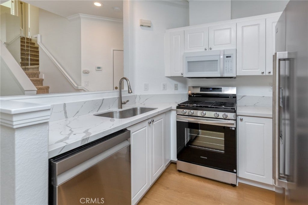 Welcome home to this beautifully upgraded townhome located in the desirable Rose Arbor tract of Valencia! This gorgeous 2-bedroom, 2 bathroom residence features a remodeled kitchen with modern finishes, updated cabinetry, and quality countertops, along with remodeled bathrooms offering stylish upgrades throughout. The light-filled floor plan provides comfortable living and entertaining spaces, complemented by numerous upgrades that add both charm and functionality. Step outside to enjoy a private, cute backyard—perfect for relaxing, gardening, or outdoor dining. Additional highlights include a one-car attached garage, and a well-maintained community close to shopping, dining, parks, and award-winning schools. This move-in-ready home offers the perfect blend of comfort, style, and location. Available for an immediate move in!