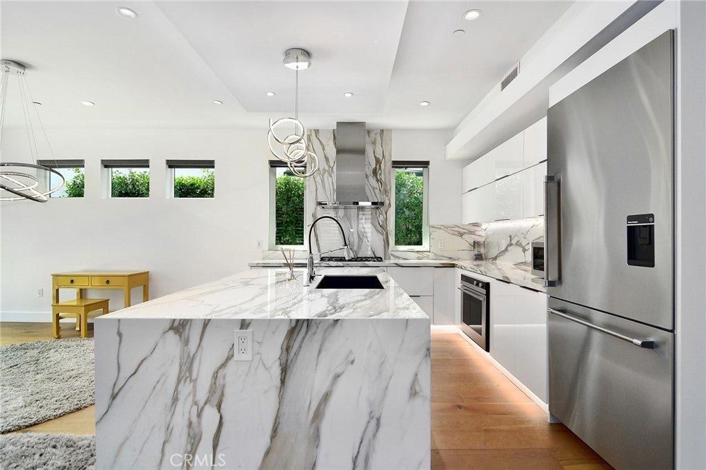 Super sexy lease opportunity in Sherman Oaks. Gated near-new construction of cherished Modern design is right here waiting for you! Inside this light & bright showplace, gorgeous hardwood flooring will make you smile. Stunning open kitchen affords a large center-island, quality Fisher & Paykel appliances and exquisite cabinetry & counters. Large living room with high ceilings offers access to the spacious rear yard with brand-new barbecue. All bedrooms are ensuite & the Primary bedroom features a dazzling private bath & large walk-in closet. Ascend the spiral staircase to enjoy an additional bed/bath & your very own massive roof-top oasis. Gated driveway parking plus a large two-car garage. Mere moments to all the shops and yummy eateries on the BLVD. Washer/Dryer & Fridge included. It doesn't get much better than this....Better Hurry!