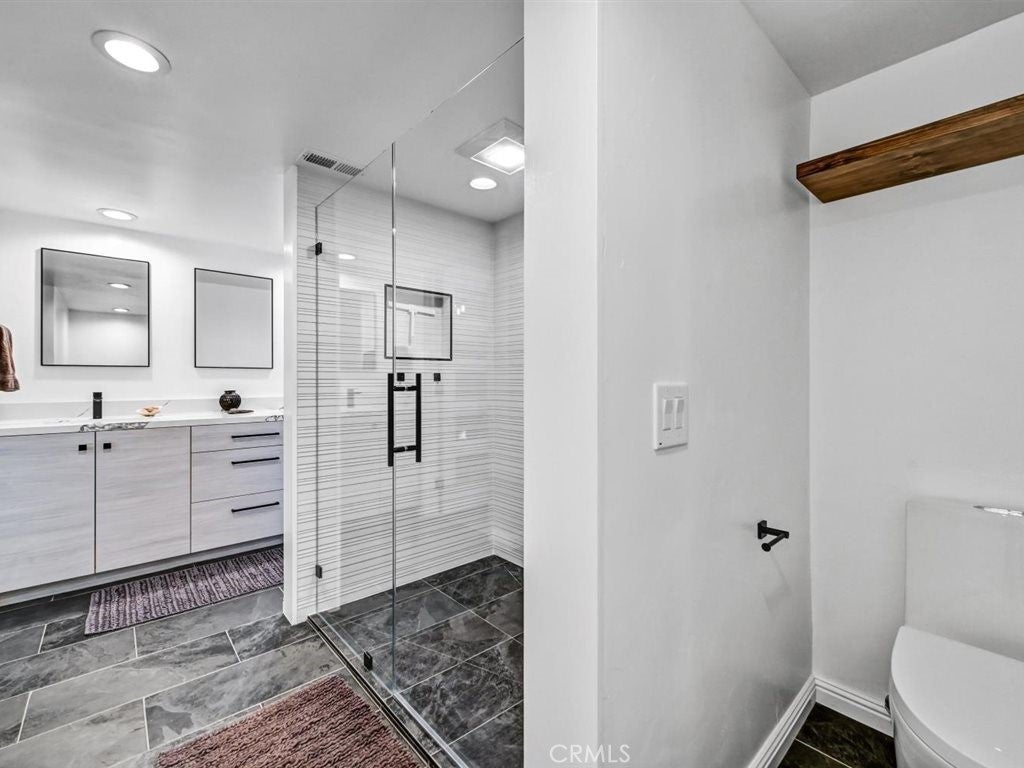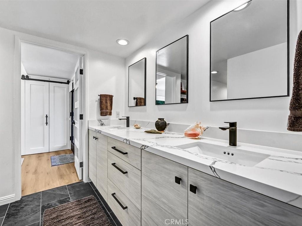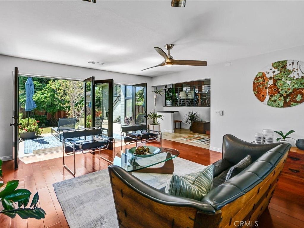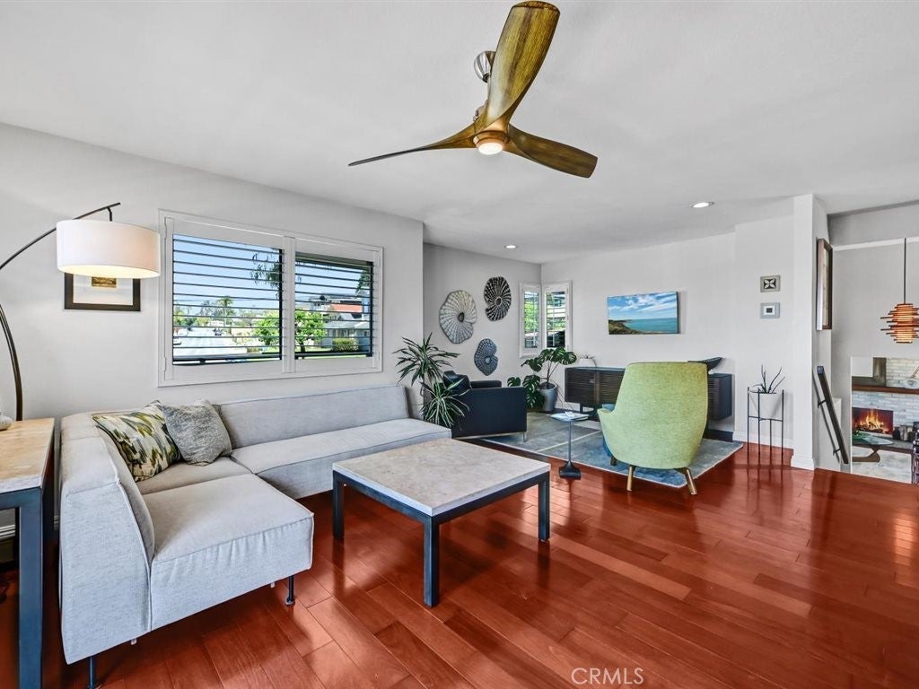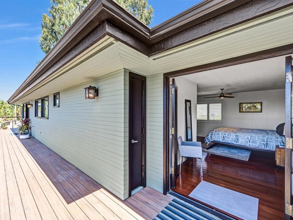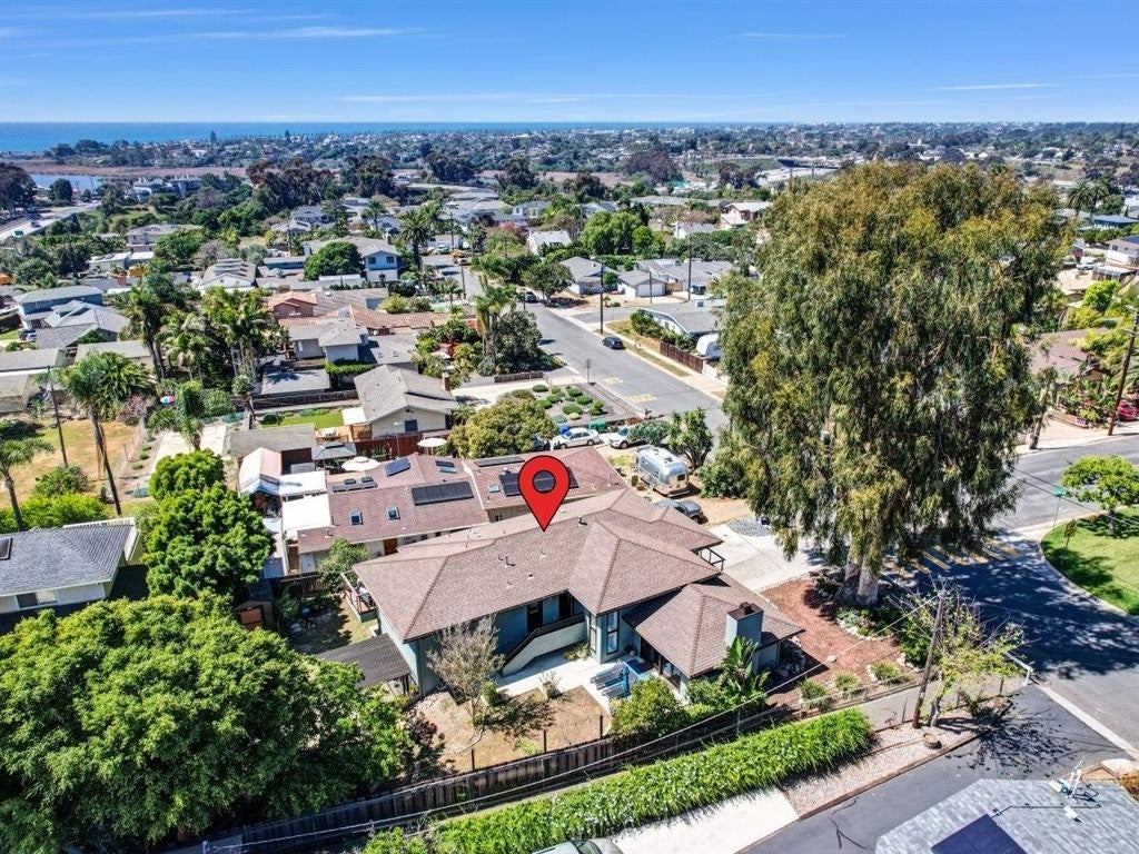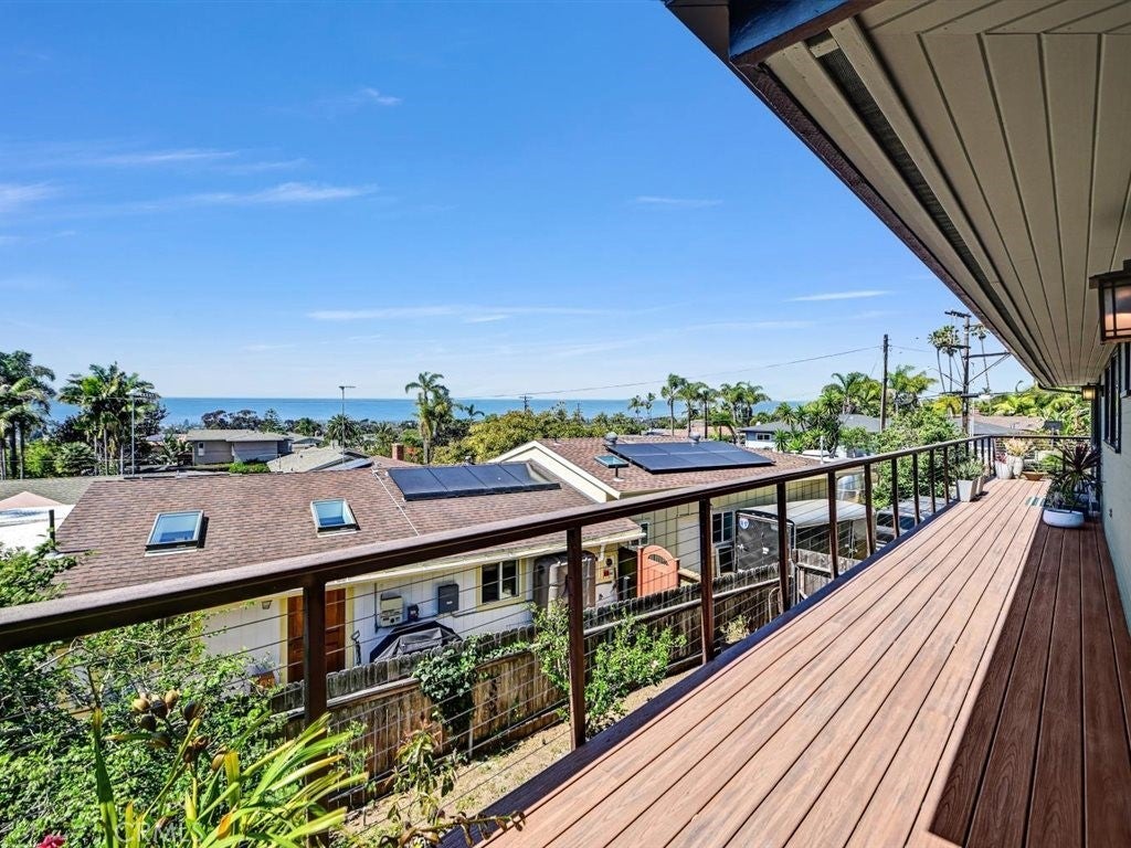Ocean views and contemporary coastal elegance define this exceptional Olde Carlsbad home. Filled with natural light and showcasing quality craftsmanship throughout, the residence offers a modern open floor plan that captures ocean views from multiple vantage points, including the expansive wraparound deck—an ideal setting for relaxing or enjoying breathtaking sunsets over the Pacific. The freshly painted exterior enhances the home’s crisp coastal presentation, while beautifully upgraded bathrooms feature stylish finishes and thoughtful design, elevating both comfort and appeal. The spacious chef’s kitchen offers generous counter space, abundant cabinetry, built-in stainless steel appliances, and a Dacor professional-grade gas five-burner cooktop with a contemporary range hood—perfectly suited for everyday living and entertaining. The adjacent family room and dining area flow seamlessly to the ocean-view deck, creating effortless indoor-outdoor living. The formal living room exudes a distinctive mid-century feel, highlighted by beautiful hardwood floating shelves and double French doors that open onto a private patio—an inviting space for gatherings or quiet retreat. Upstairs, the light-filled primary suite enjoys coastal views and features French doors that open directly to the wraparound deck, along with ample closet space and a newly upgraded Master Suite bathroom with dual sinks, custom cabinetry, and a walk-in glass shower. On the lower level, two additional bedrooms share a beautifully upgraded, spa-inspired Jack-and-Jill bathroom with dual sinks, and a spacious walk-in glass shower with modern, elegant finishes. One bedroom opens out to the backyard via both French doors, and a sliding glass patio door. Additional highlights include Santos mahogany and travertine flooring, plantation shutters, a dedicated upstairs laundry room, generous storage throughout, a two-car garage, and ample parking for additional cars in the driveway. Situated on a quiet street on a 7,707-square-foot lot, the grassy backyard wraps around the home and provides multiple areas for outdoor enjoyment. Located within walking distance to Carlsbad Village, beaches, shops, dining, and local schools, this property offers the quintessential coastal lifestyle with no HOA or Mello-Roos.