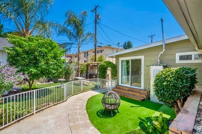 Disclaimer: The property has a detached ADU with its own separate address, currently rented to a tenant. The main house is what is available for rent. ADU portion is rented and not available. A rare opportunity competitively priced for a quick transaction. Welcome to this charming single-story residence tucked away on a quiet cul-de-sac in the heart of Van Nuys. Offering three bedrooms and two bathrooms, the home features a well-designed layout, recent updates, and inviting outdoor living spaces, including a wraparound covered patio. The light-filled living room is anchored by a cozy gas fireplace and flows seamlessly into the formal dining area. The kitchen is equipped with stainless steel appliances, ample cabinetry, a dedicated laundry area, and a separate entrance leading to the backyard. Two secondary bedrooms with generous closet space share a recently renovated bathroom highlighted by an expansive walk-in shower with built-in bench seating. Off the living room, a third bedroom and additional full bathroom provide flexibility and privacy, with sliding glass doors opening directly to the backyard. The lush, private yard is ideal for entertaining and relaxation, featuring a jacuzzi, charming garden archway, and a detached studio or flex space with electricity—perfect for a home office, gym, or creative space. Additional highlights include a gated driveway, a recently updated roof, and a convenient location close to shopping, dining, and local parks.