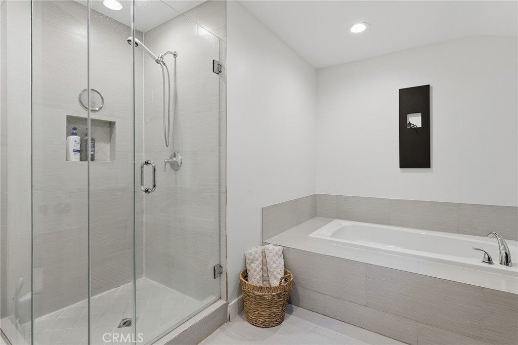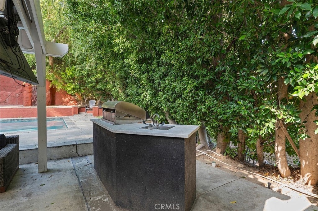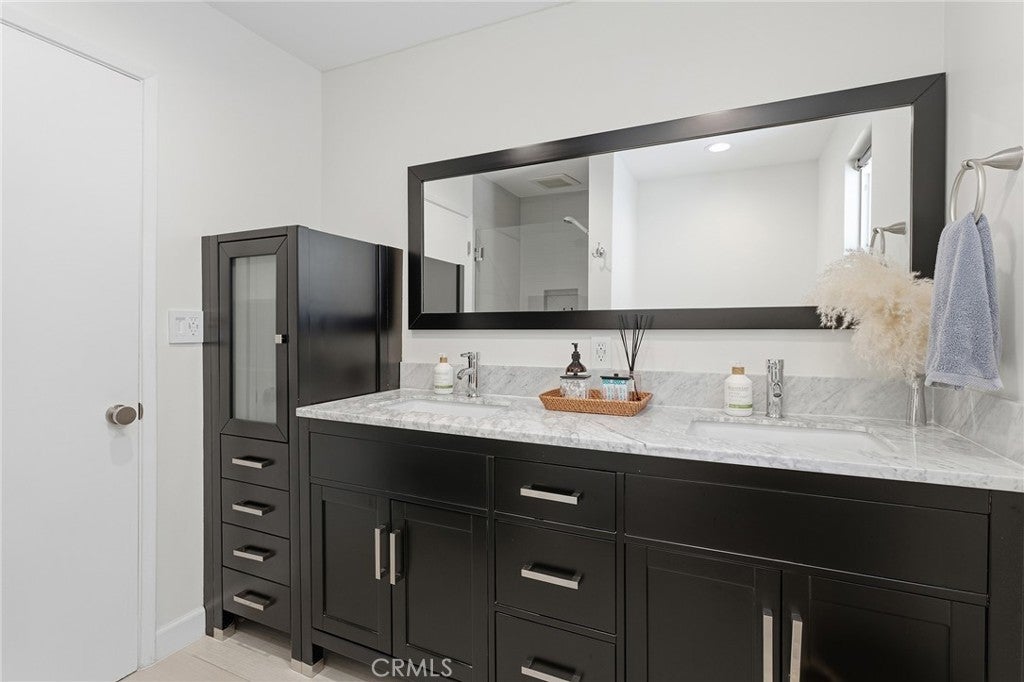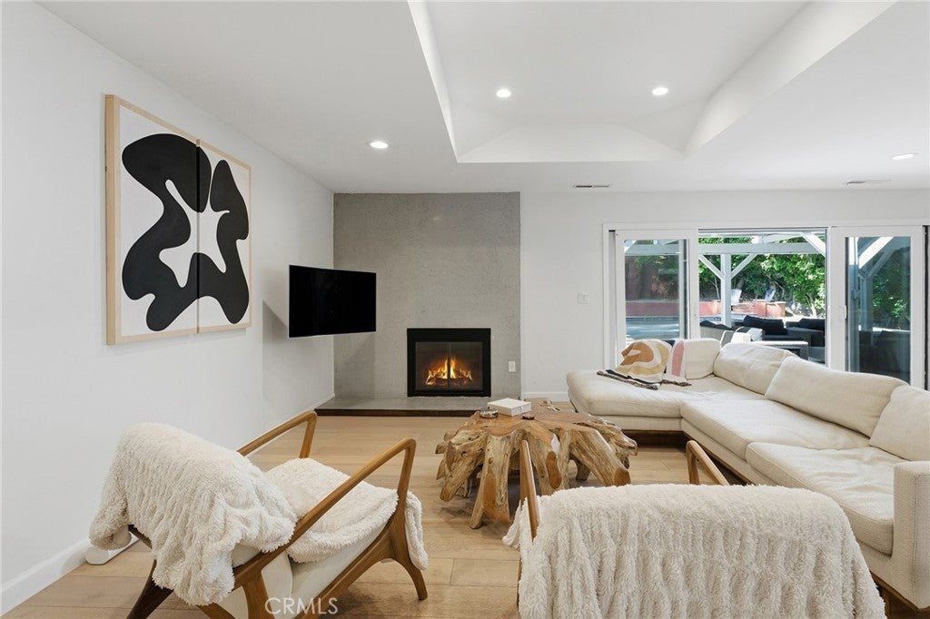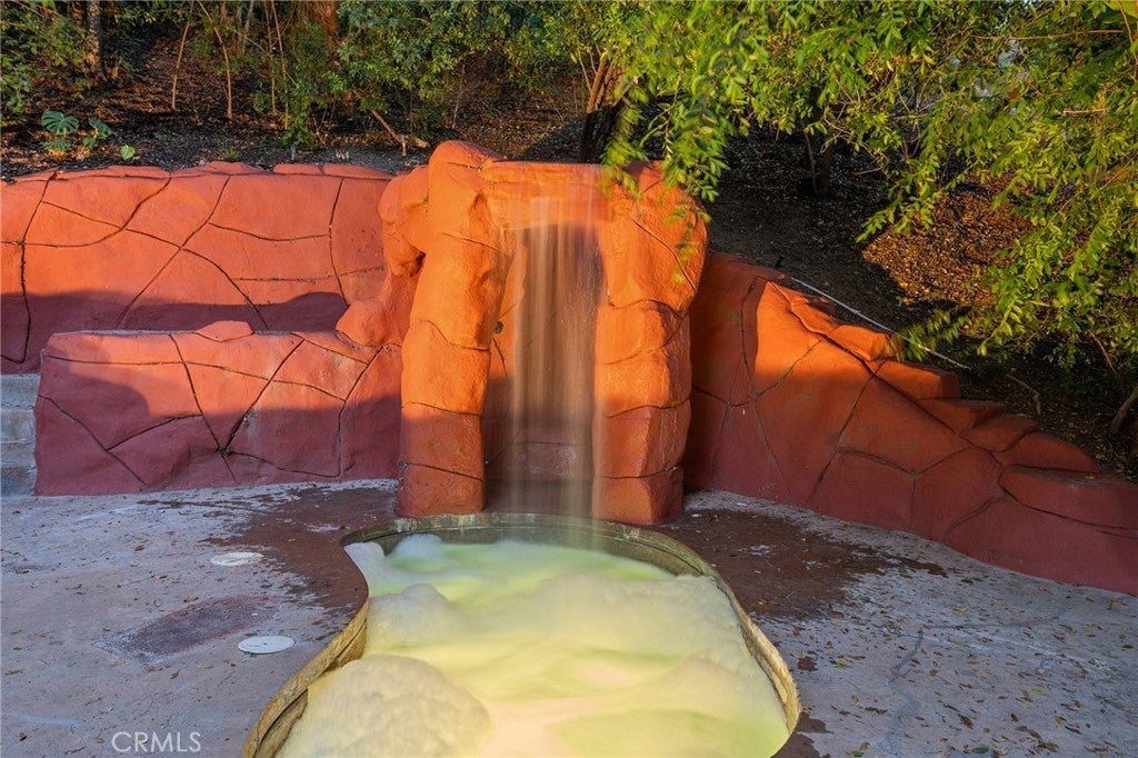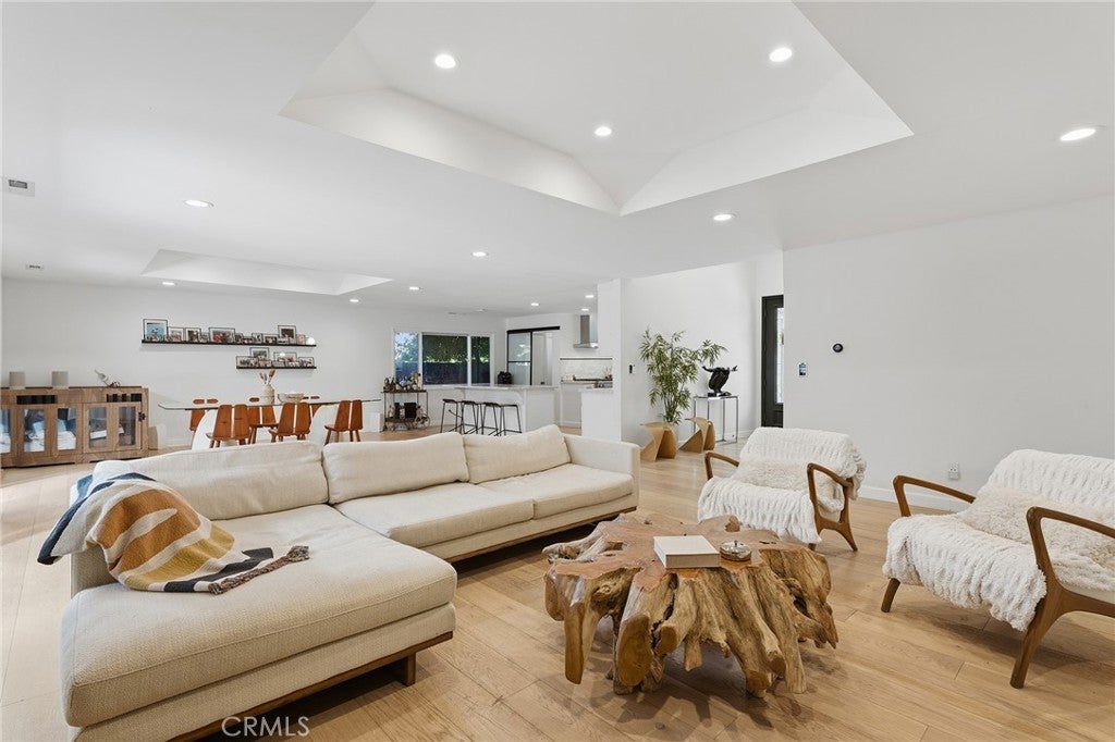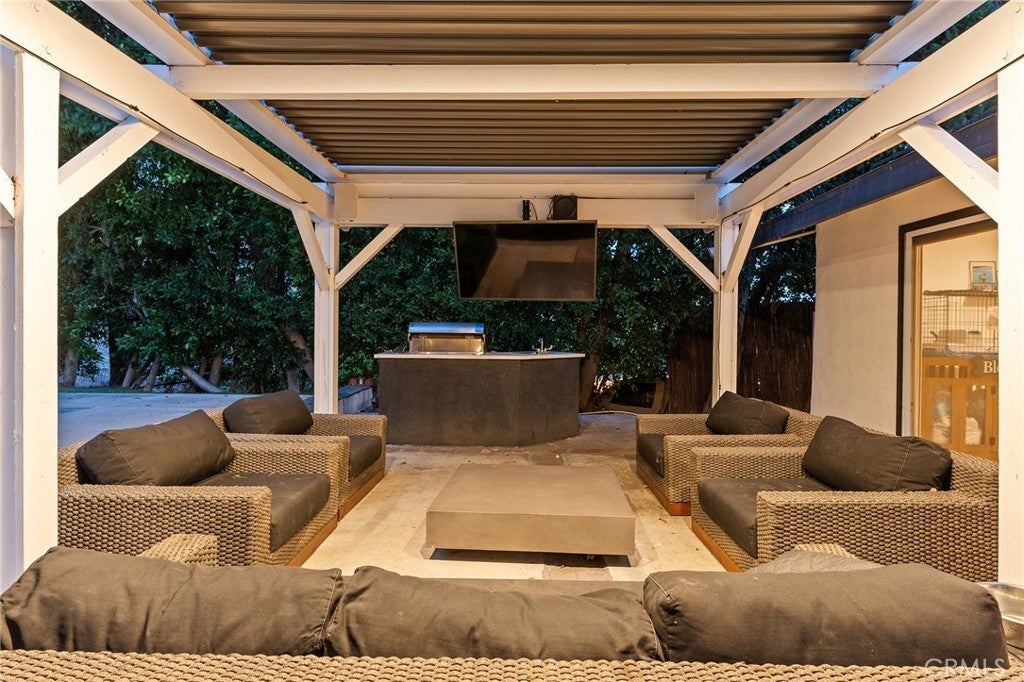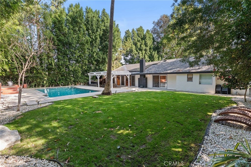 Extremely private single story gated estate located on a sprawling 20,000 SF lot South of the Blvd in the highly desirable neighborhood of Vista De Oro. The property sits far back from the street behind an automatic security gate and mature privacy hedging. An oversized driveway can accommodate parking for large gatherings and leads to the attached 2-car garage with 2 EV chargers. The grand double door entry foyer opens to a light and bright completely open floor plan with direct sight of the backyard setting an immediate tone for indoor/outdoor entertaining. The spacious family room has a plaster finished fireplace, tray ceiling, sliding glass doors that open to the yard, and wide plank hardwood floors found throughout. The equally large dining room also features a decorative tray ceiling and another glass slider that opens to the yard. The completely remodeled expansive kitchen opens directly to the living spaces and boasts center island with breakfast bar seating, Carrera marble counters & backsplash, custom soft close cabinetry, stainless appliances including a Miele range, and separate walk-in pantry. There are three well appointed bedrooms each with their own en-suite bathrooms. The primary bedroom features double door entry, glass slider that opens to the yard, large walk-in closet, and private luxurious remodeled bathroom with dual sinks, spa tub, and walk-in shower. The second bedroom suite has closet with custom built-ins and private remodeled bathroom with tub and shower. The third bedroom is located off the entry making it the ideal office or guest suite with access to a remodeled bathroom with dual sinks and walk-in shower, perfect for powder bathroom use as well. The garage is completely finished with laundry area and large attic, providing perfect flex space for play room/gym/etc but still is a fully operational garage. The stunning backyard features pebble finished saltwater swimming pool and resort style spa grotto with cascading waterfall, smart covered patio with misters, BBQ center with sink, gas fire pit, huge grass lawn for play, and gorgeous canopy trees providing ultimate privacy from neighbors. Additional upgrades include completely owned solar panels, two Tesla power walls, “Brilliant” smart home lighting, and “Span” smart home electrical panel. Sale also comes with plans/estimates for ADU & JR ADU. Adjacent to Westfield Topanga Mall/Village, Warner Center, hiking trails and easy access to the beach and freeways.