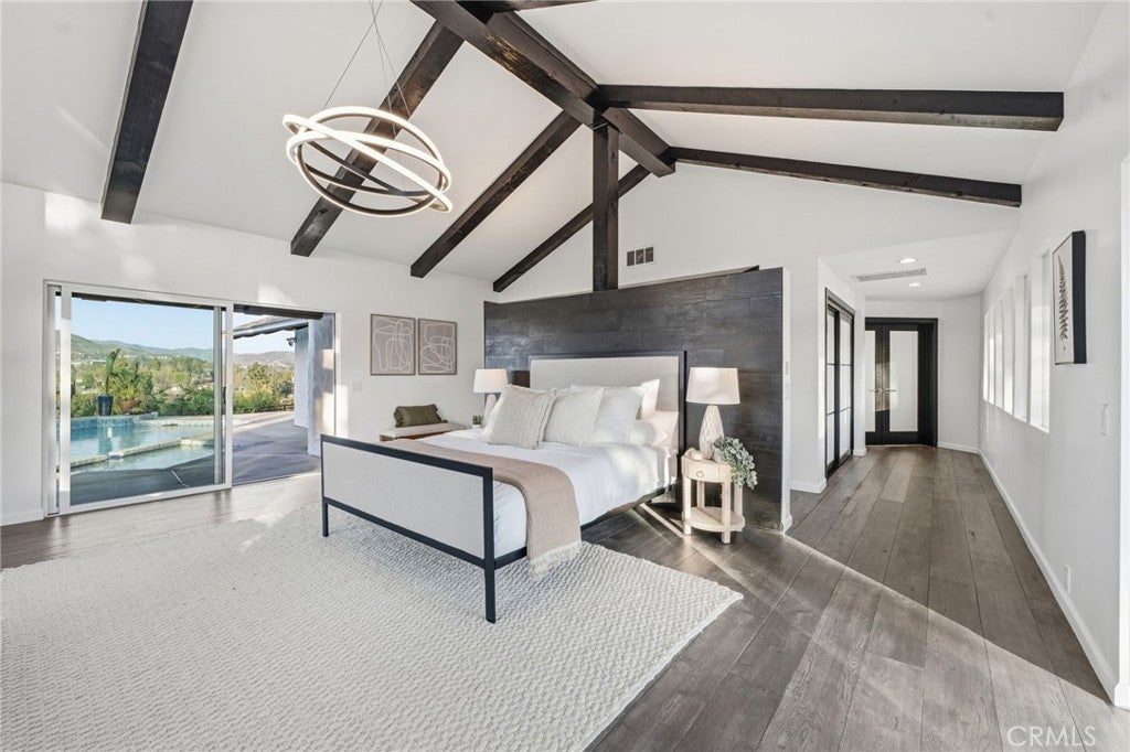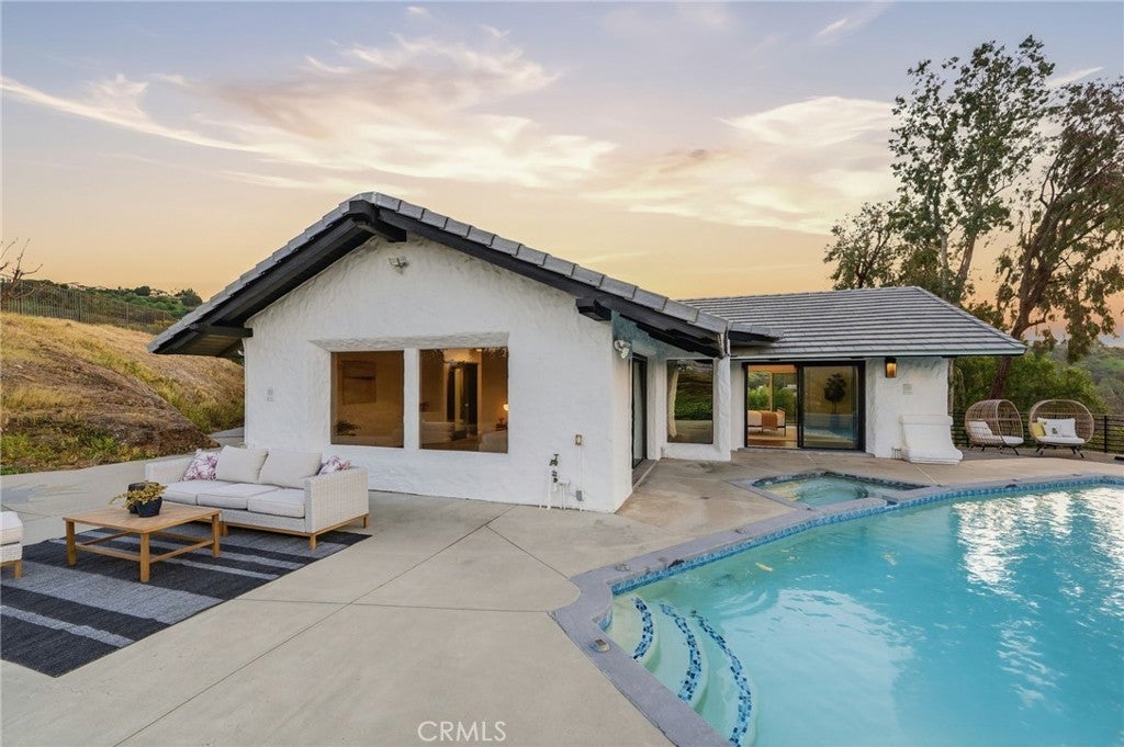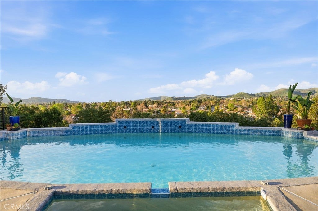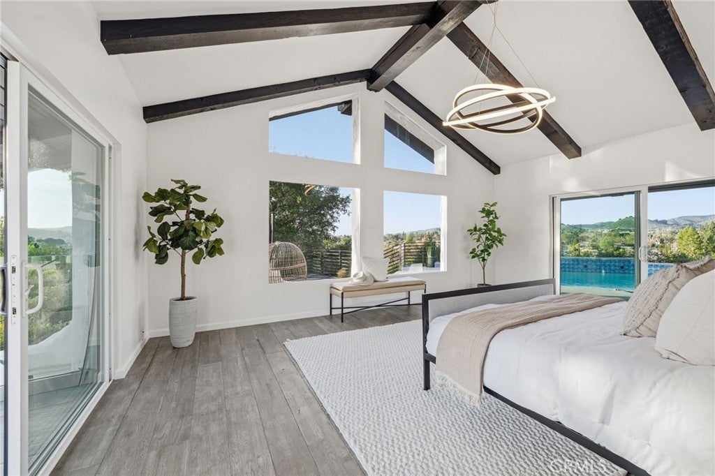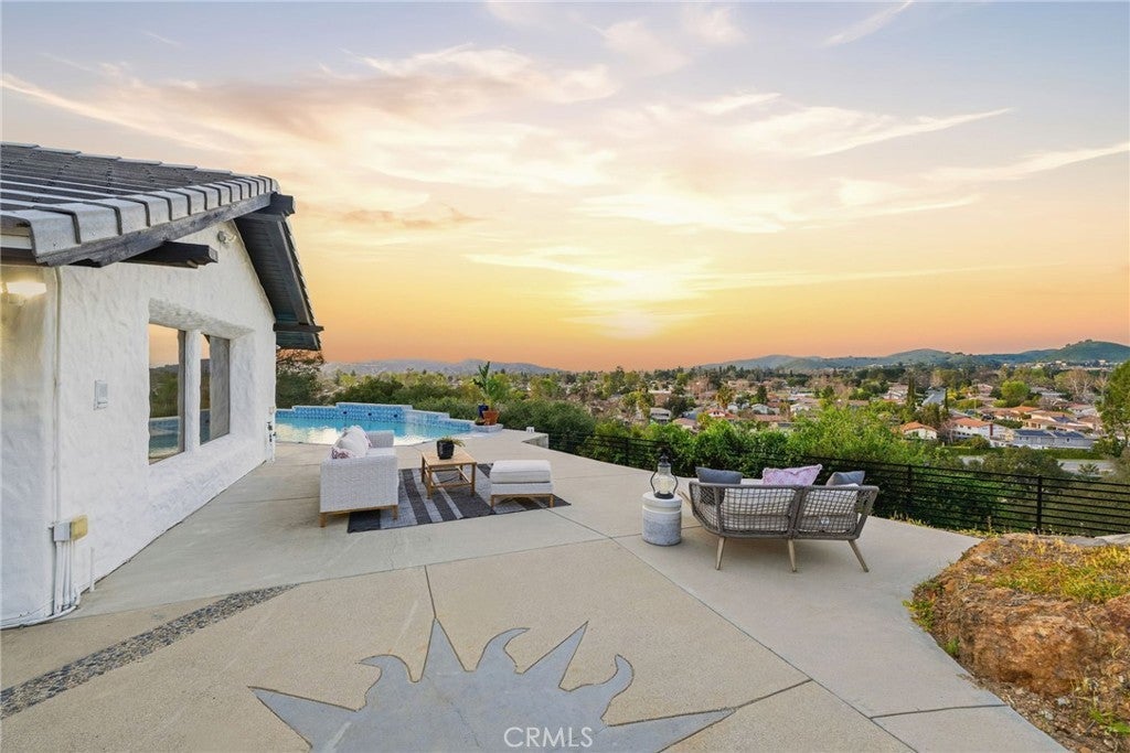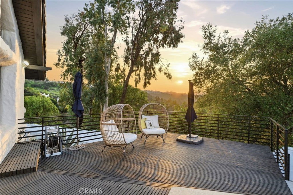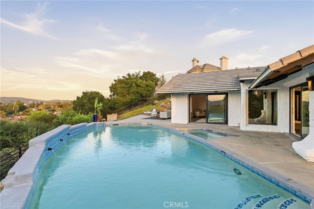 Built for sunsets! Hilltop views and stylish California living come together in this private Westlake Village estate. Perched at the top of a hill, this custom-built home offers refined style, privacy, open skies and sweeping sunset views in the idyllic Westlake Trails. A grand double-door entry opens to soaring, beamed ceilings, wide plank flooring and expansive walls of glass that fill the home with natural light and panoramic views from nearly every living space. Sleek and stylish contemporary finishes blend with warm California character, creating an atmosphere that feels sophisticated and relaxing. A grand scale living room with dramatic ceilings flows past a built-in bar and into the formal dining area, bordered by a wall of windows and glass capturing hillsides and sunsets. The open layout continues into an inviting kitchen and family room. The thoughtfully-designed kitchen, with oversized island, glass-front cabinetry and Carrara marble surfaces is equipped with high-end appliances including built-in espresso and wine refrigeration. A statement, full-height tiled fireplace anchors the family room, while sliding doors open to a veranda spanning the length of the home capturing golden light and sunset views. The flexible floor plan provides versatility with two-bedroom suites on separate levels, plus a large loft with en-suite bath and private balcony, ideal to create a fourth bedroom, office or studio. A private window-lined corridor leads to a tranquil primary suite filled with natural light, hillside views, private balcony and direct access to the pool terrace. The spa-inspired bath embraces an open, resort-style design with beautiful dark stone finishes, oversized shower and walk-in closet. Outdoor spaces throughout the property offer a variety of ways to relax, gather and take in the views. The expansive terrace and pool deck are perfect for capturing breezes, city lights and incredible views of summer fireworks, while a garden nook tucked into the hillside creates a quiet retreat. A three-car garage and expansive, long driveway provide ample parking and extra play space and a magnificent oak tree, with swings swaying from twisted branches, provide shade and storybook charm to this quiet retreat home. A peaceful hillside home designed for panoramic views, privacy and lifestyle perfectly situated in one of the most sought-after neighborhoods of Westlake Village.